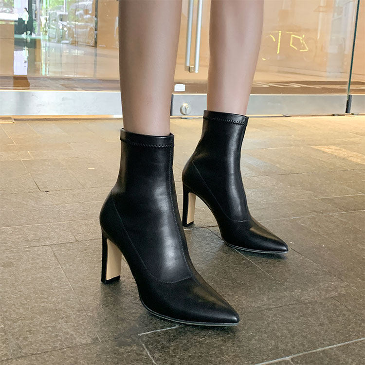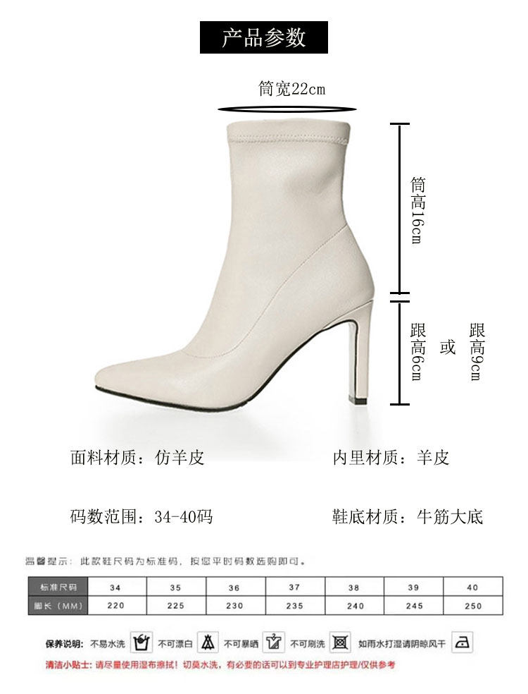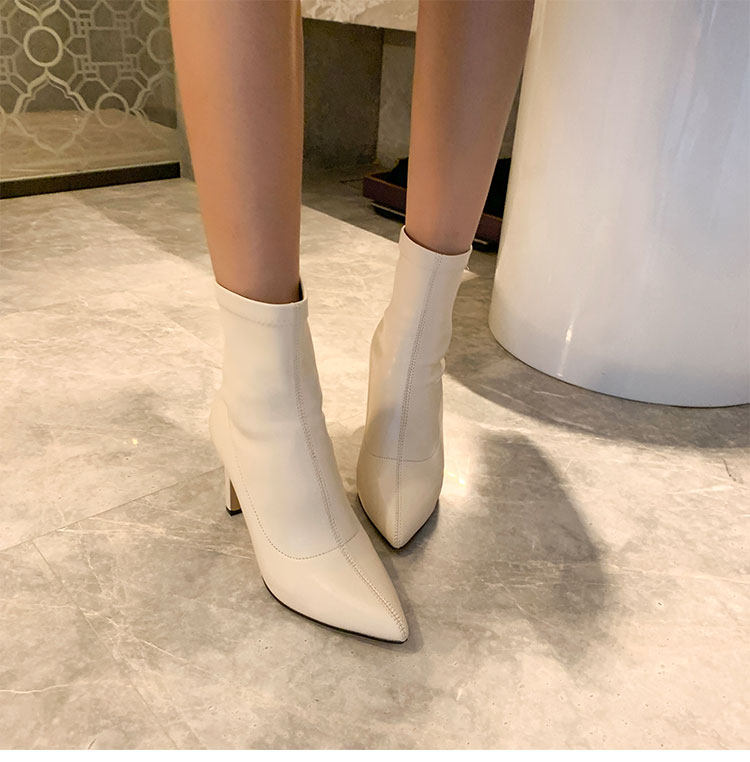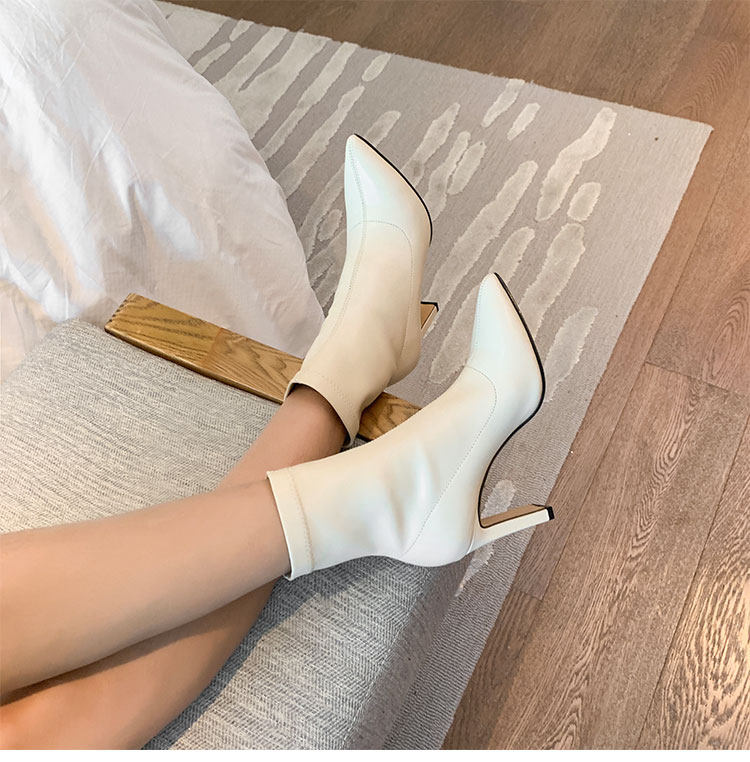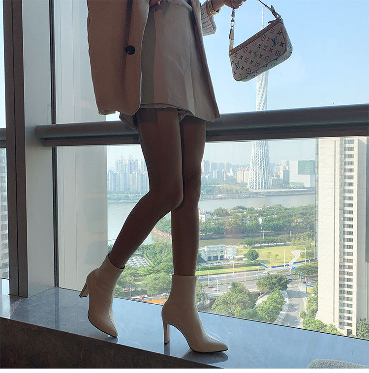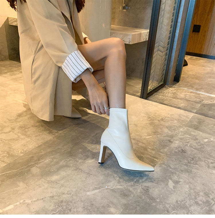 白色短靴女高跟粗跟尖頭2025新款秋冬百搭皮面ins網紅瘦瘦靴裸靴