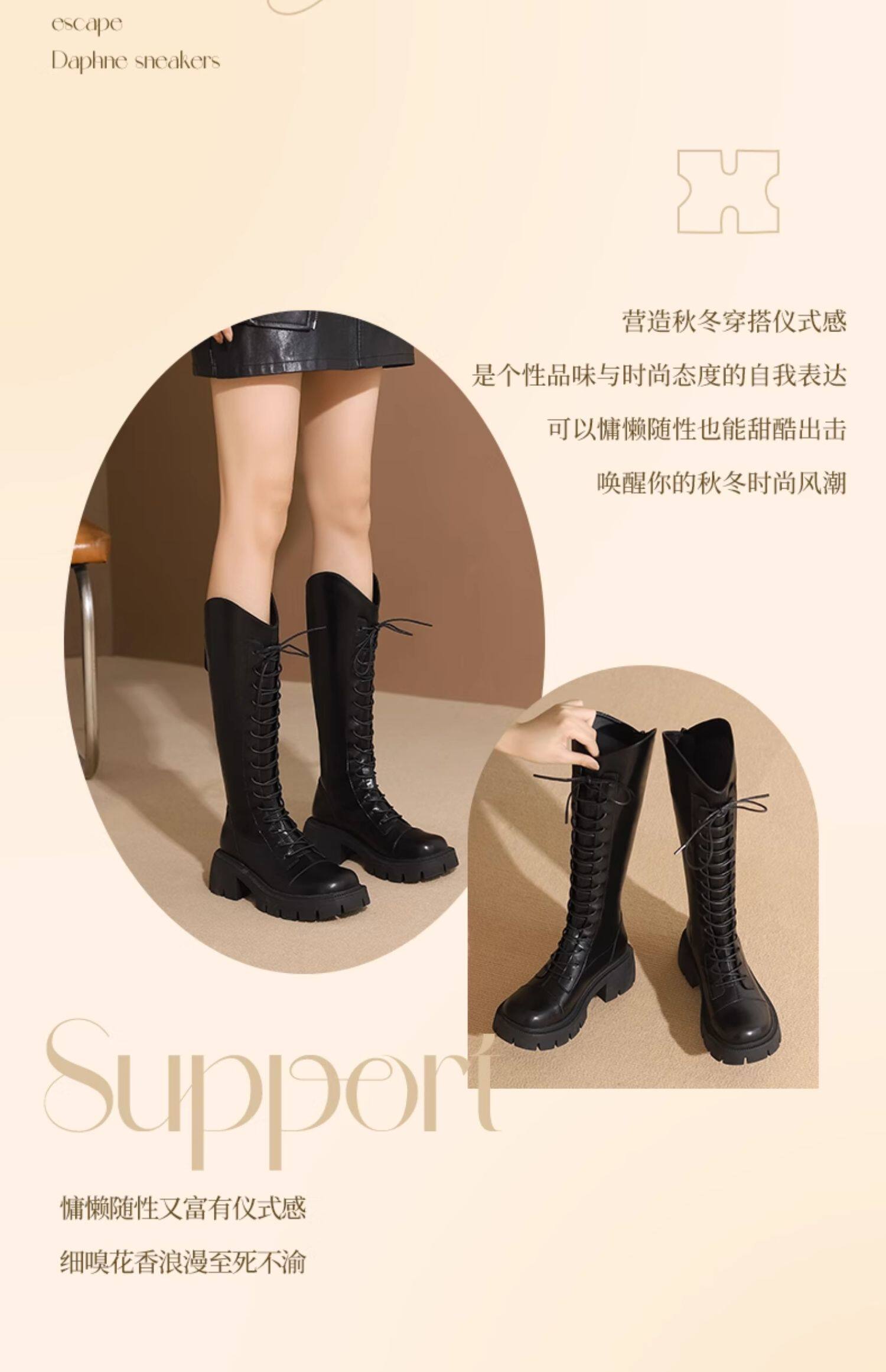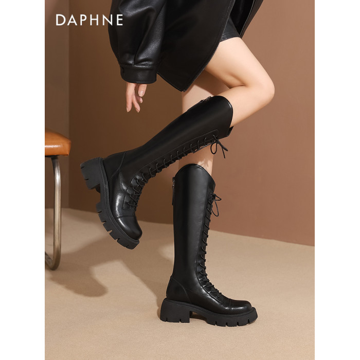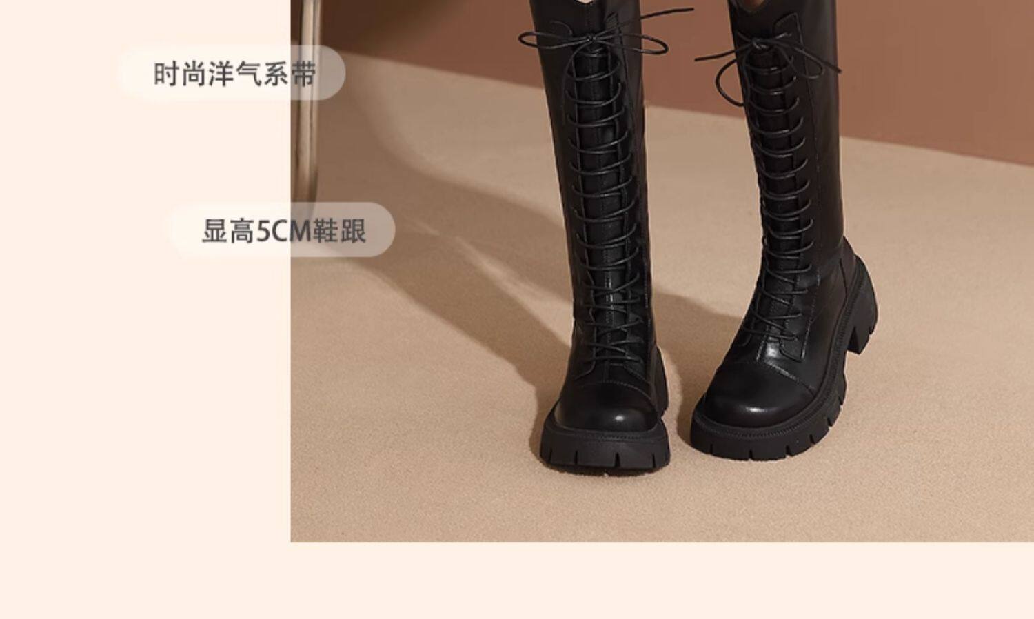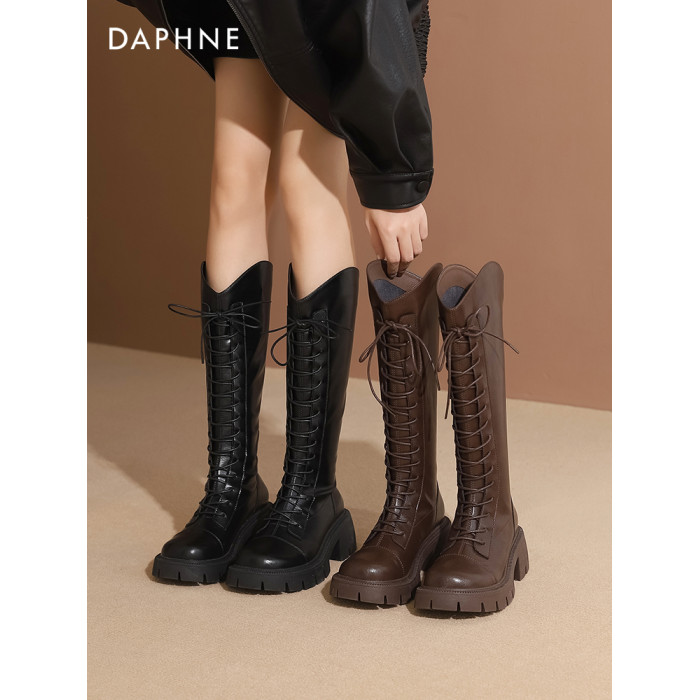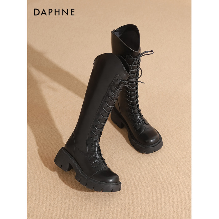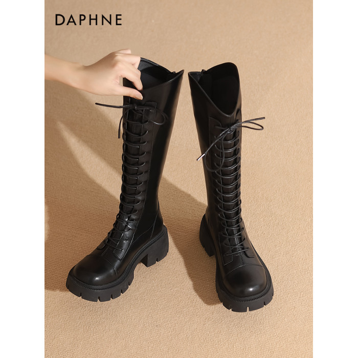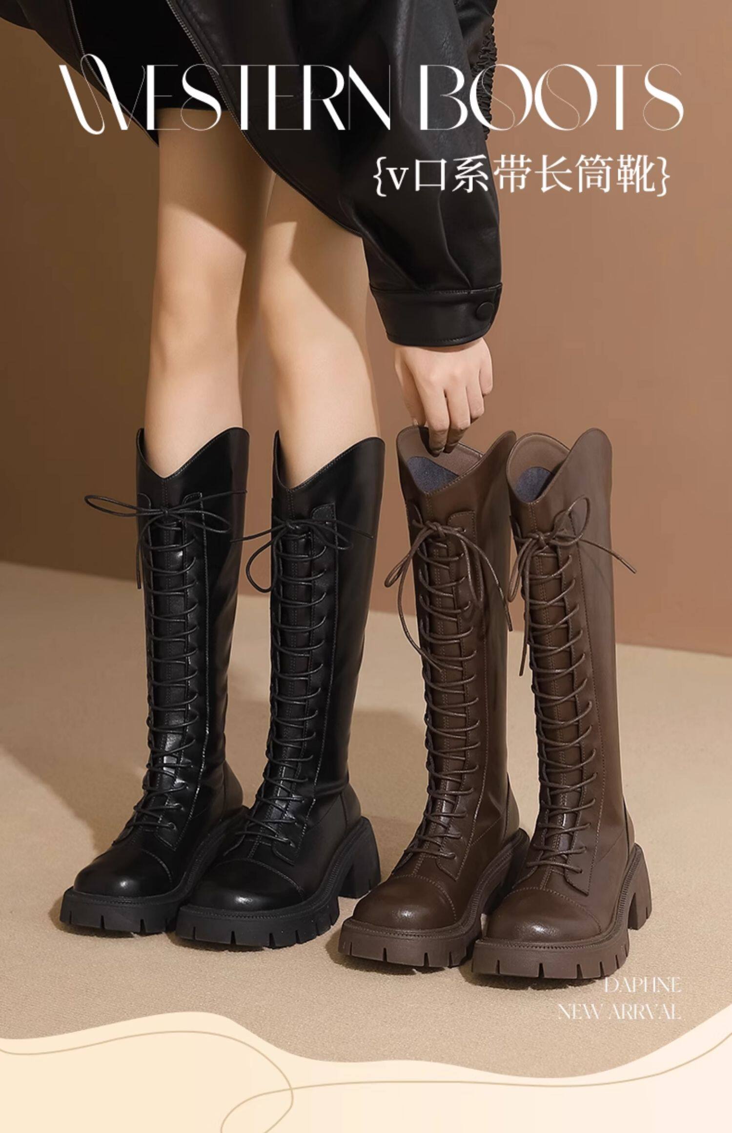 達芙妮馬丁靴女長筒靴2026新款秋冬v口系帶騎士靴厚底高筒瘦瘦靴