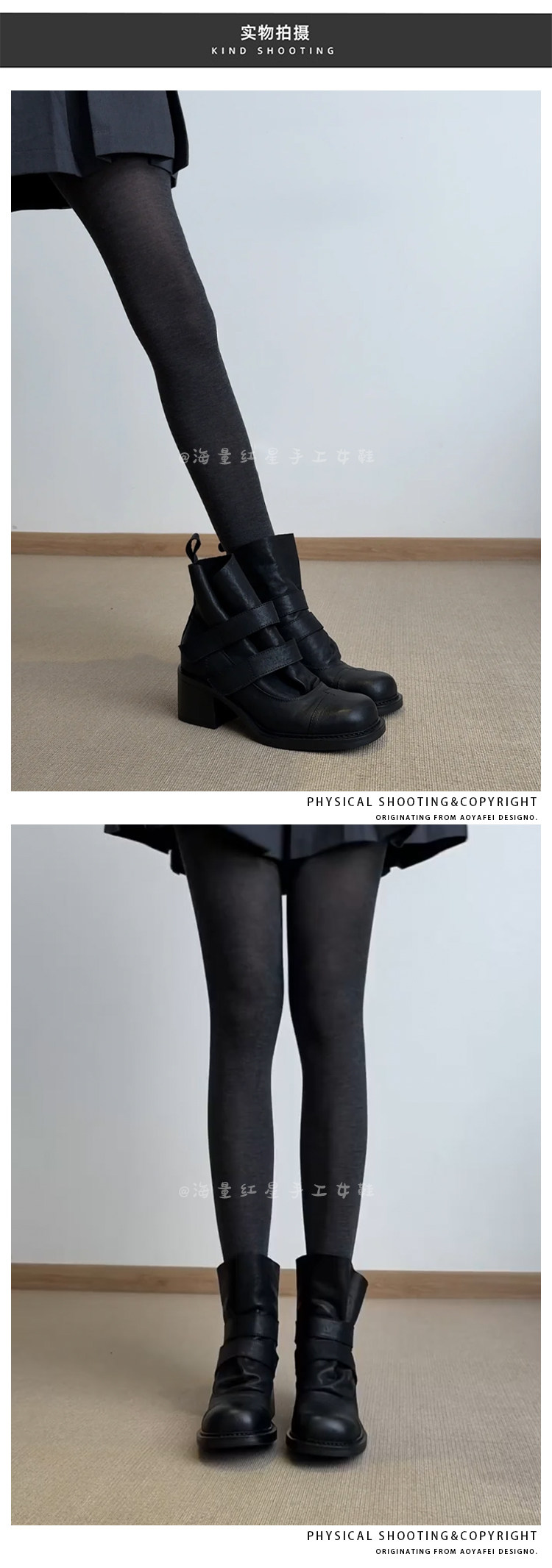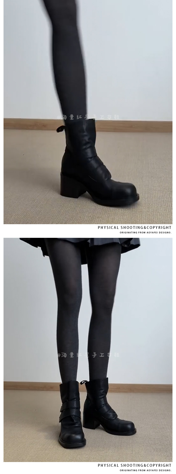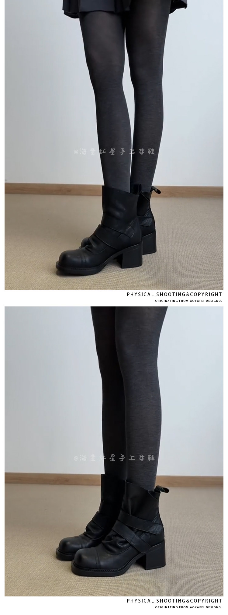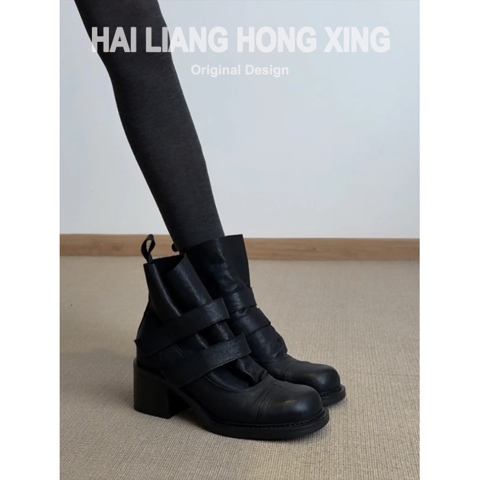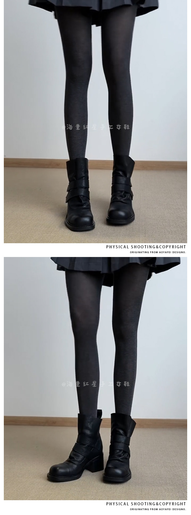 羊皮版~復古高跟短靴女新款百搭褶皺魔術貼粗跟西部馬丁靴瘦瘦靴