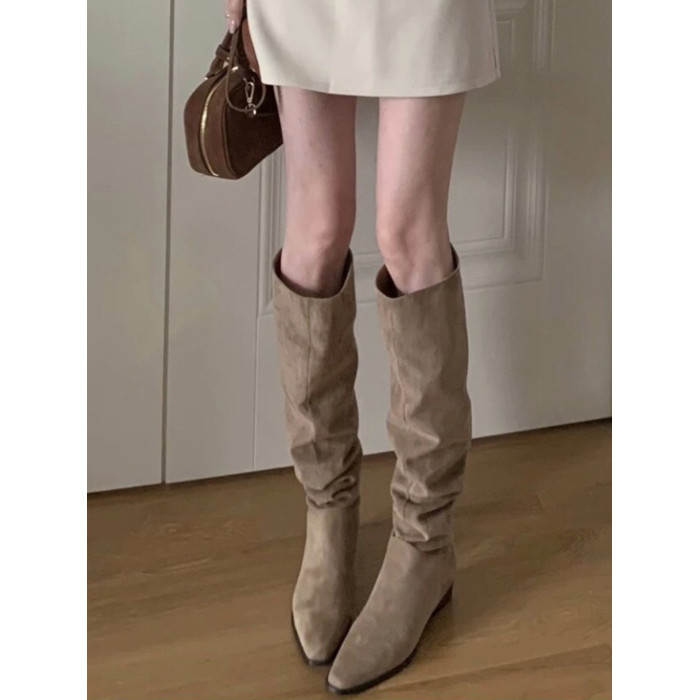 騎士靴女2025新款美拉德棕色尖頭長靴粗跟高筒復古絨面褶皺堆堆靴
