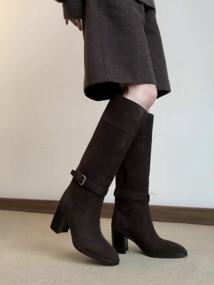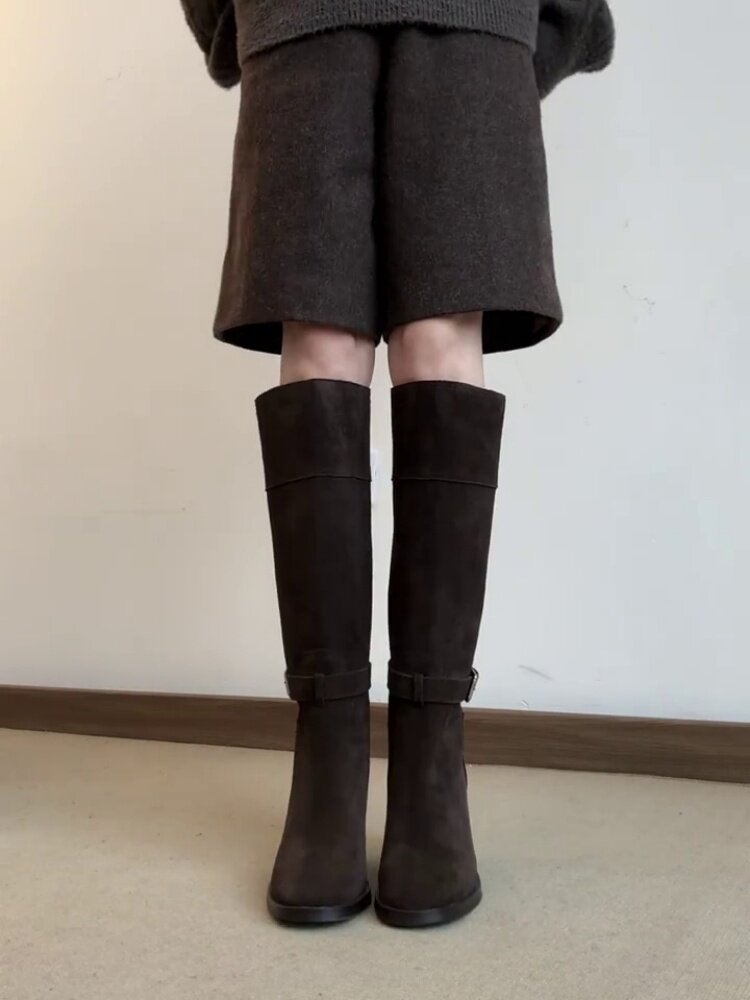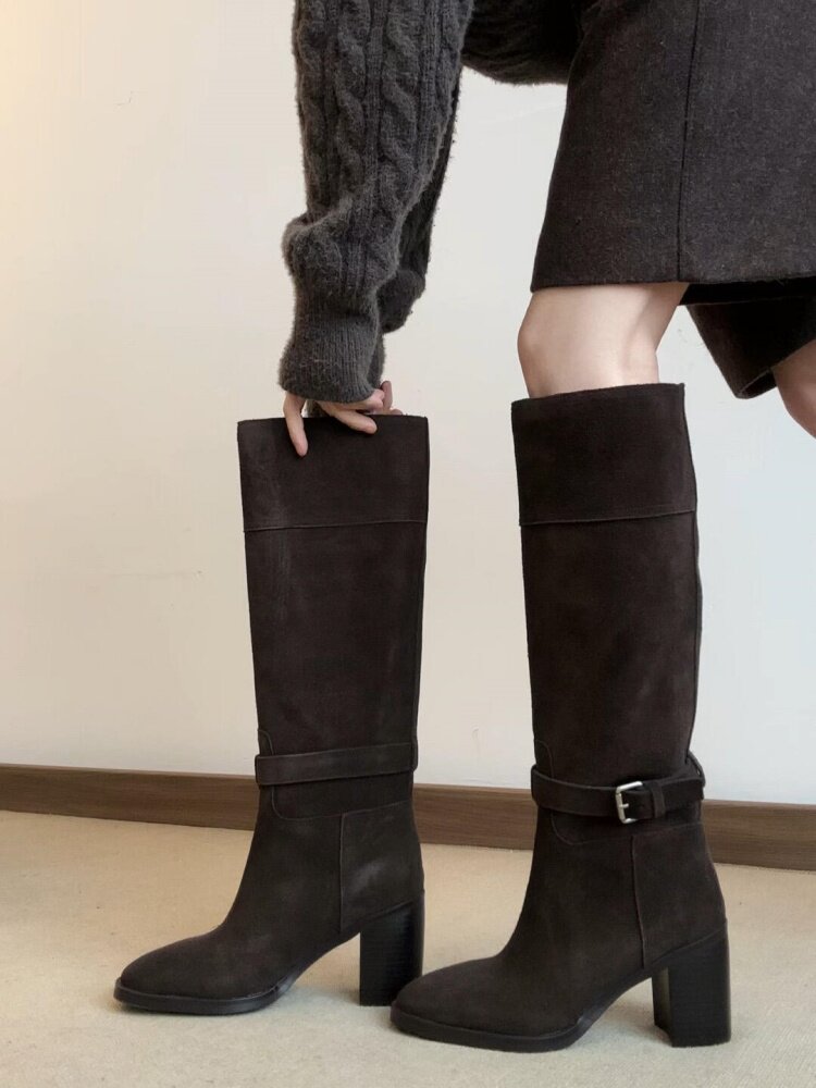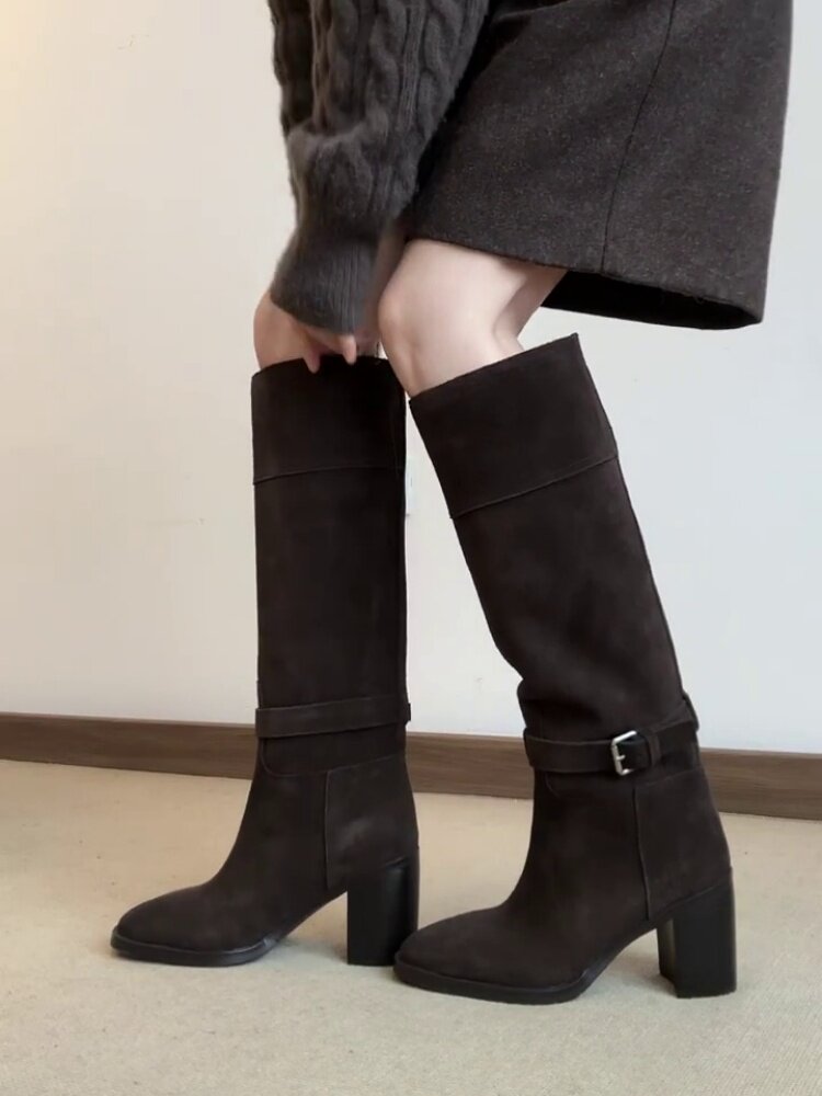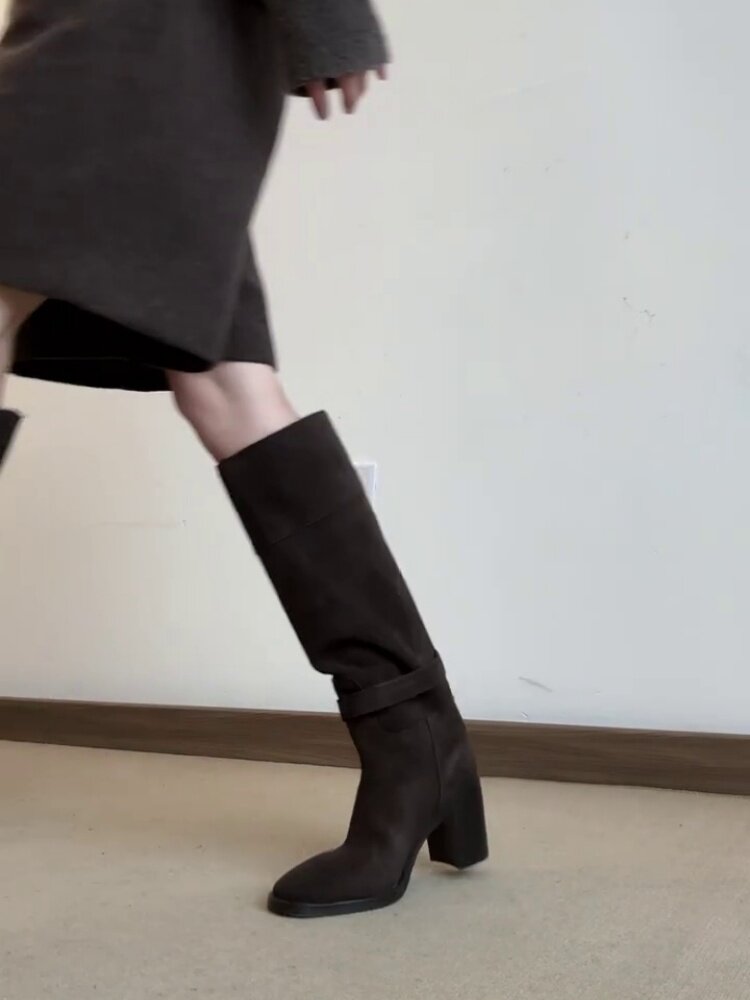 羊皮版~秋冬韓版風絨面高跟顯瘦寬筒長靴女法式真皮方頭時裝靴子