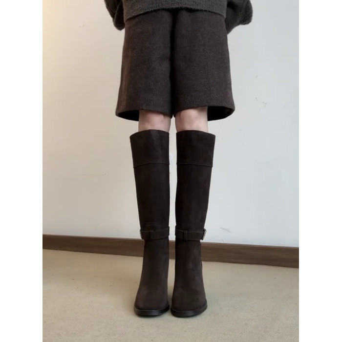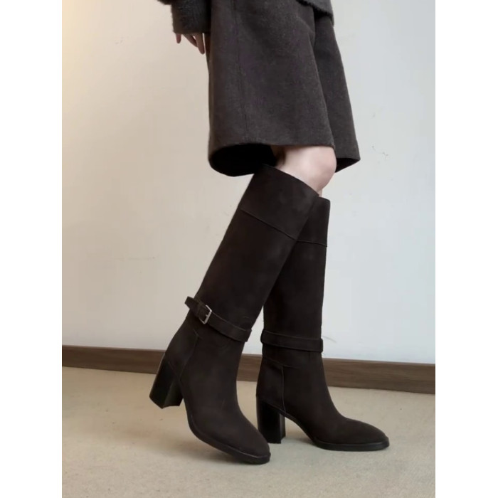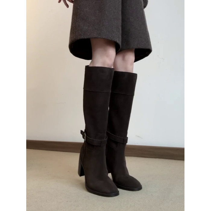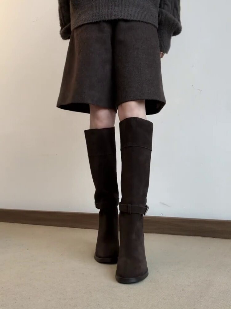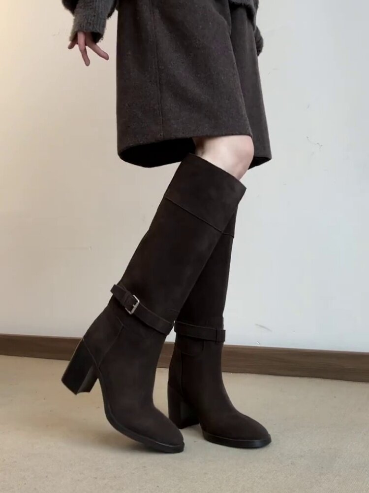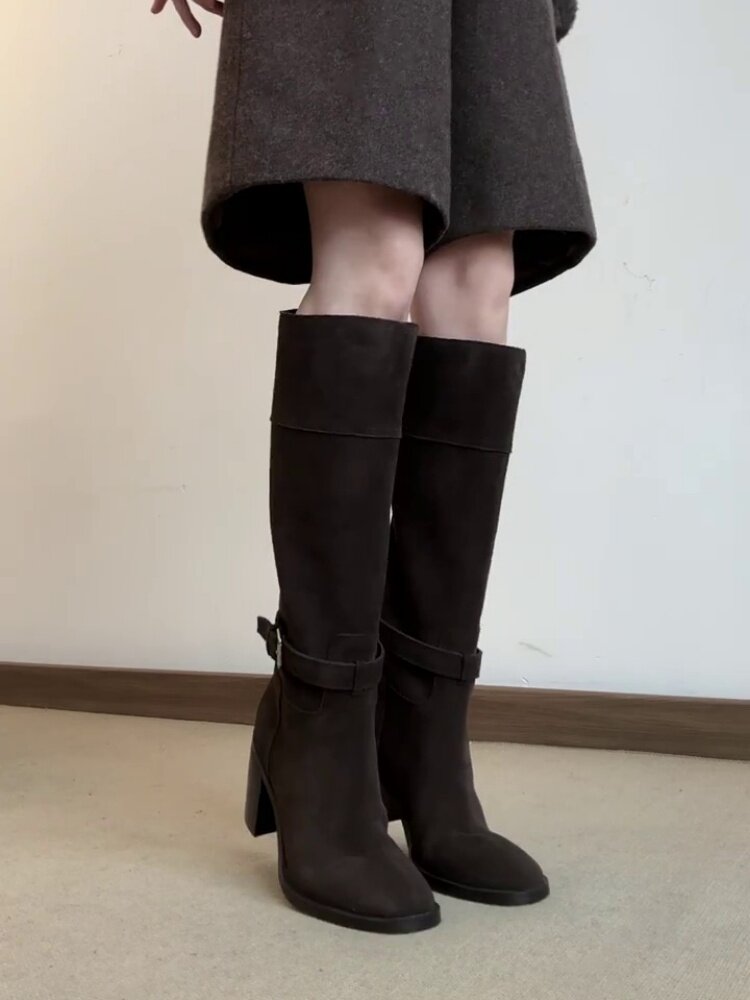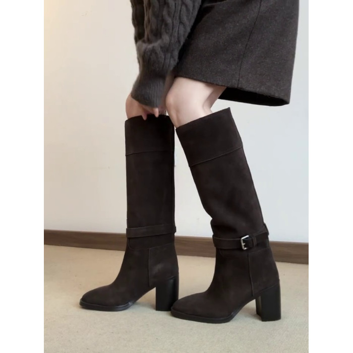 羊皮版~秋冬韓版風絨面高跟顯瘦寬筒長靴女法式真皮方頭時裝靴子