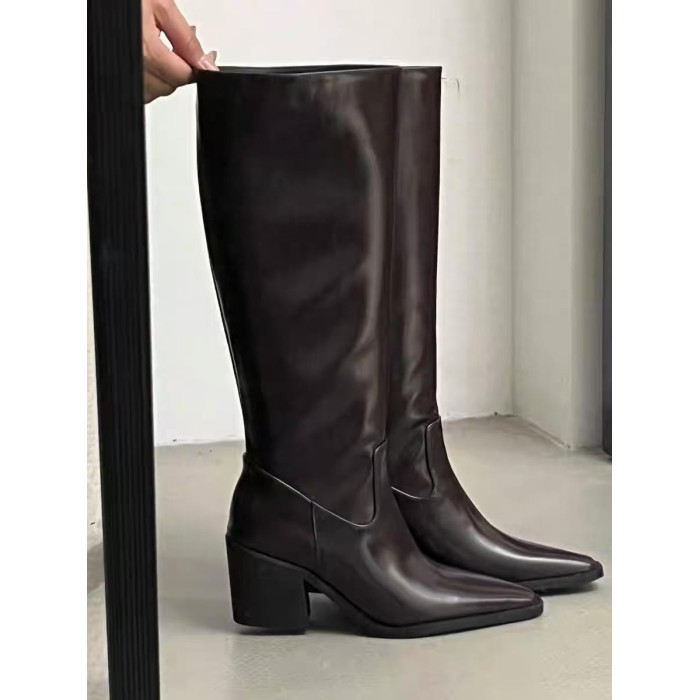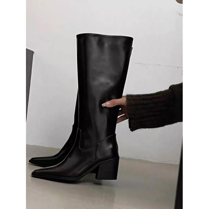 瘋狂星團~真皮小方頭大筒高跟長筒靴女粗跟不過膝氣質高筒騎士靴