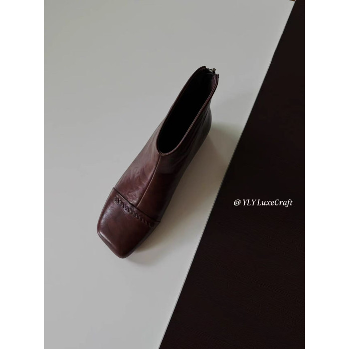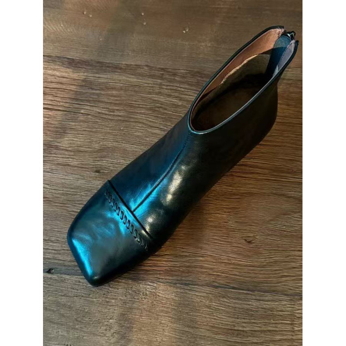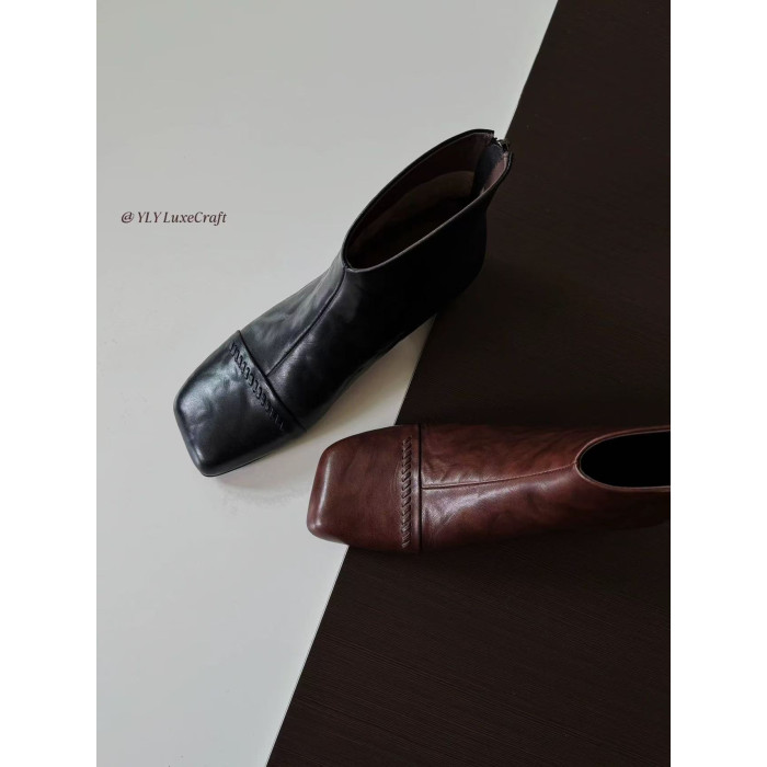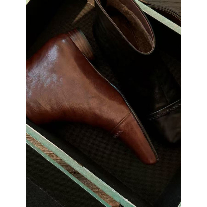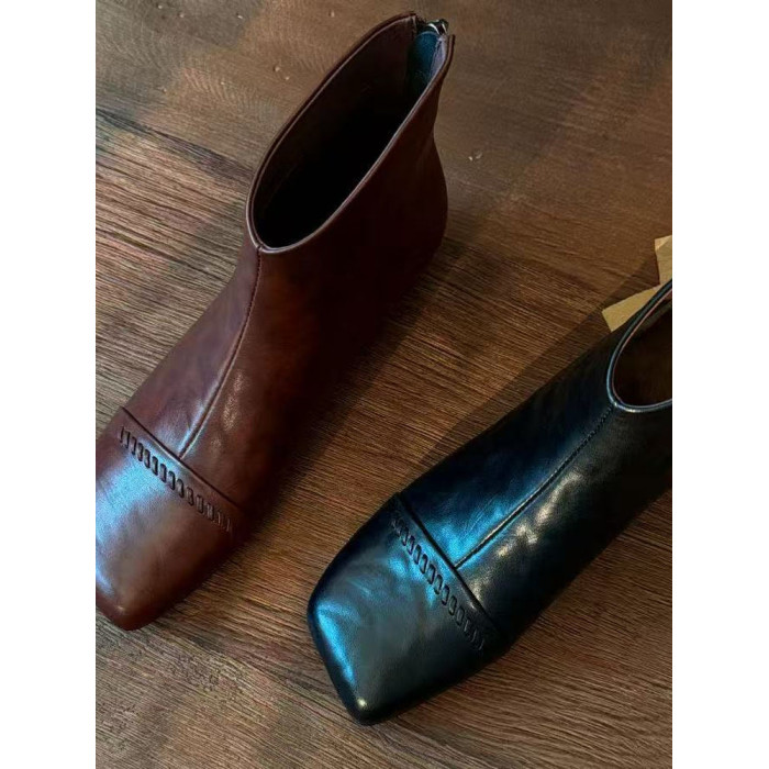 2025秋冬新款法式復古方頭短靴女粗跟真皮切爾西靴子大碼女鞋子