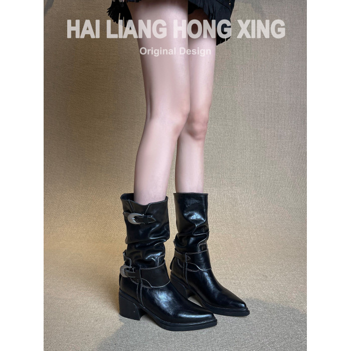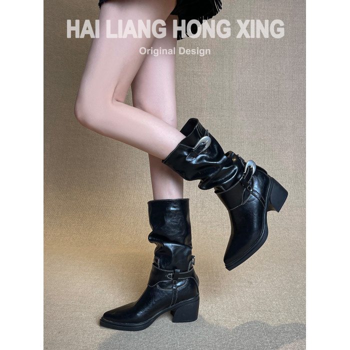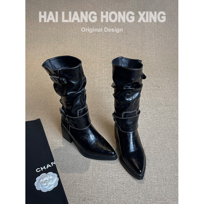 羊皮版~復古尖頭高跟短靴女新款粗跟褶皺堆堆靴騎士靴中筒馬丁靴