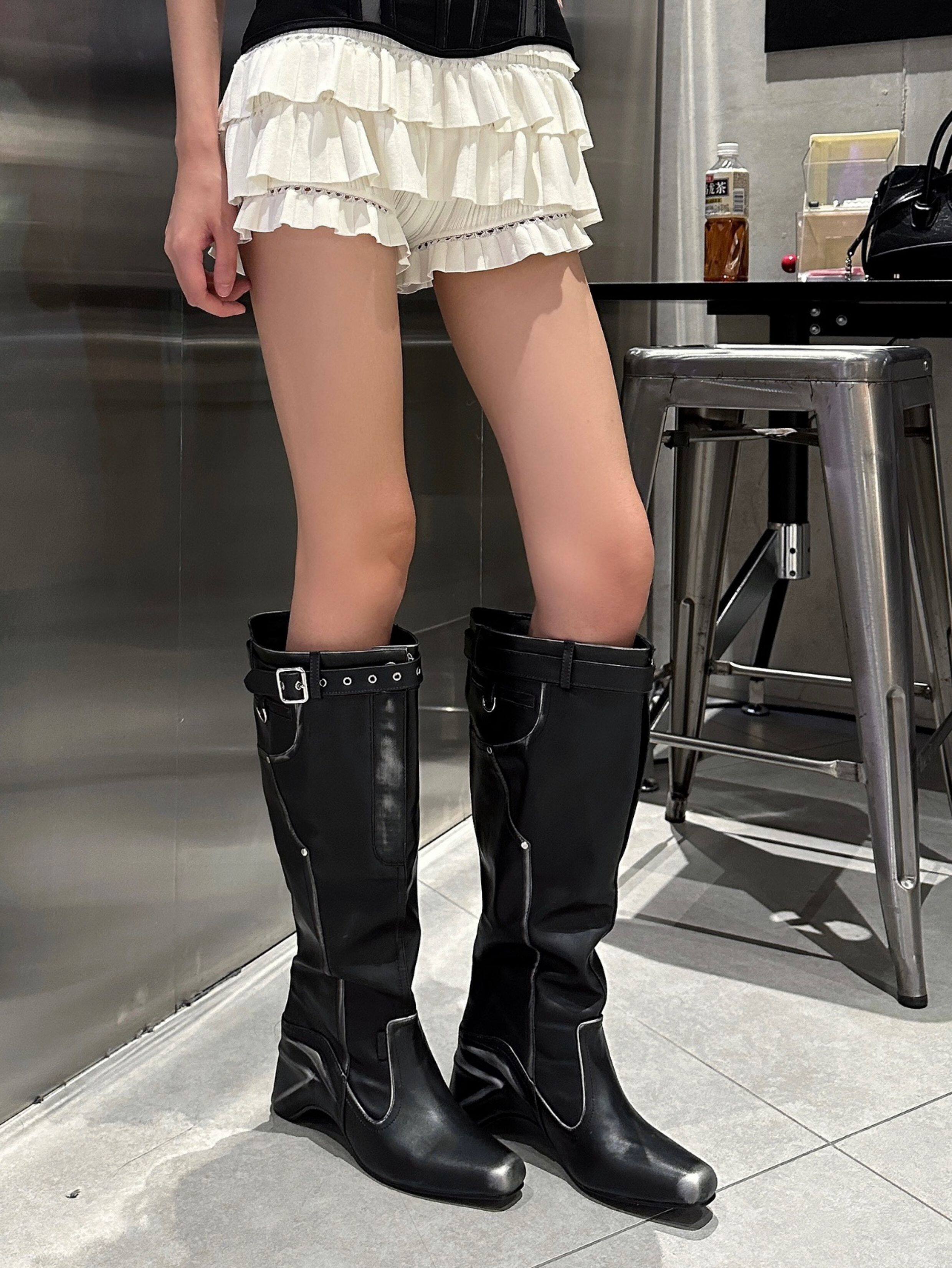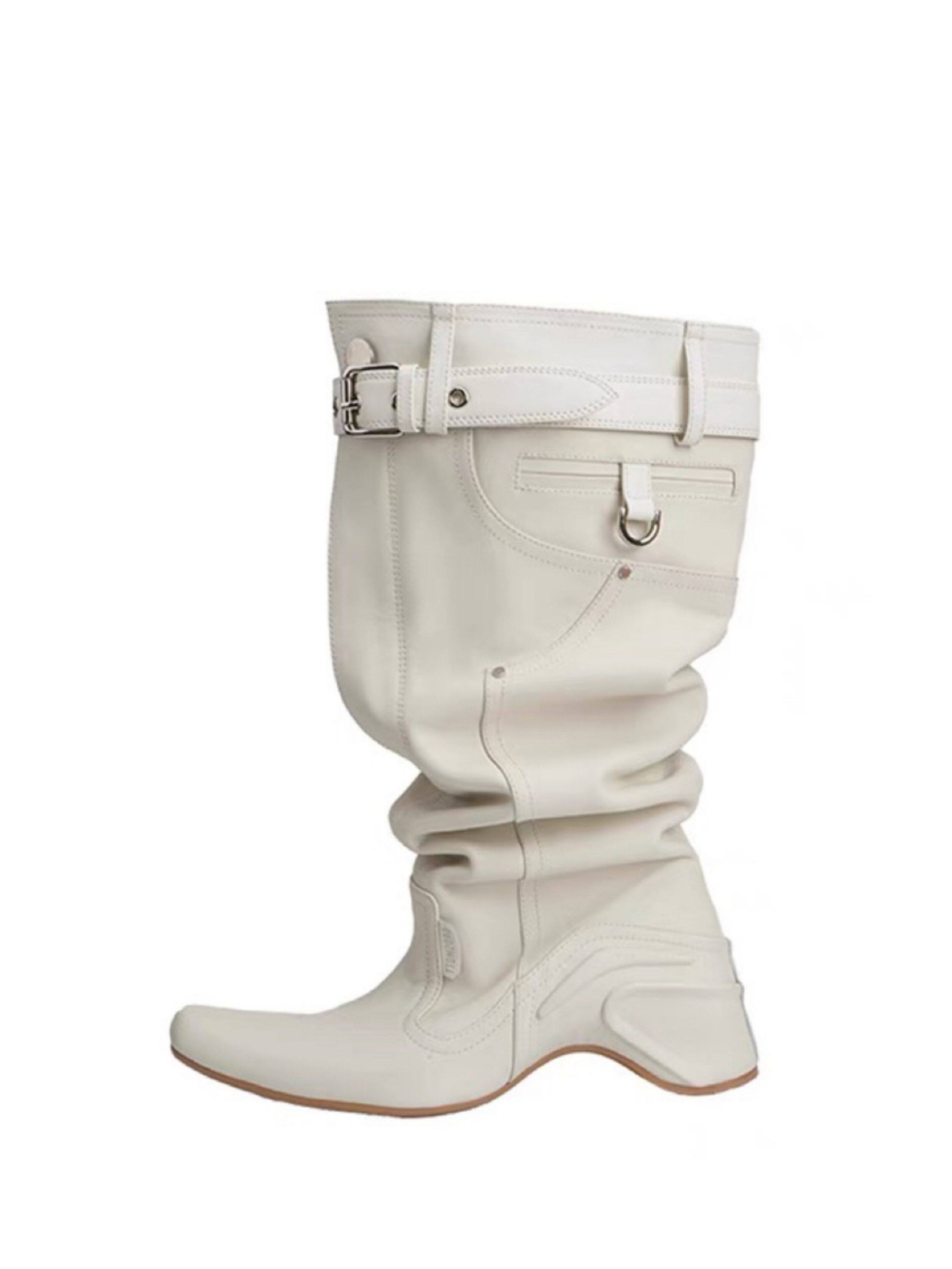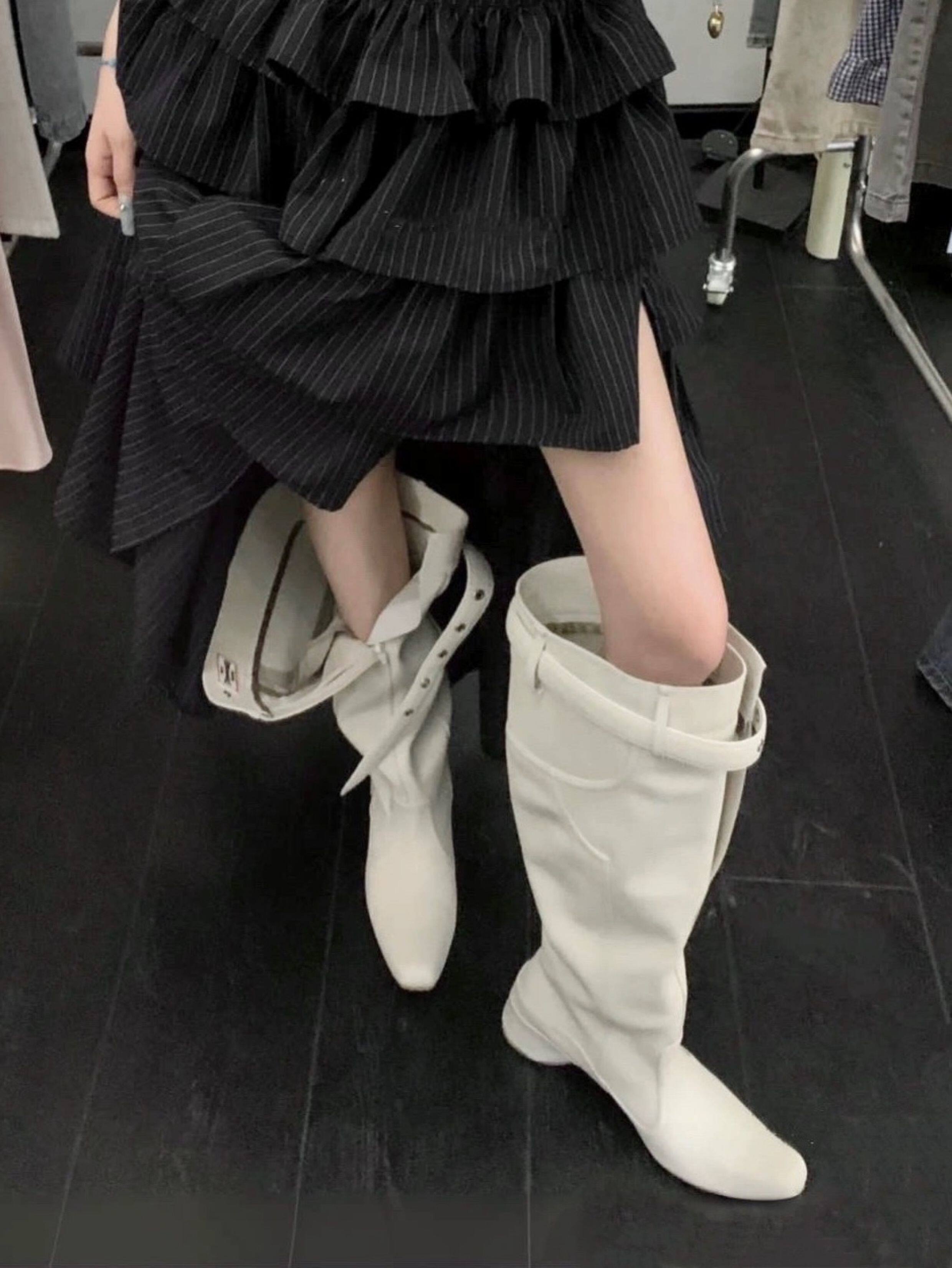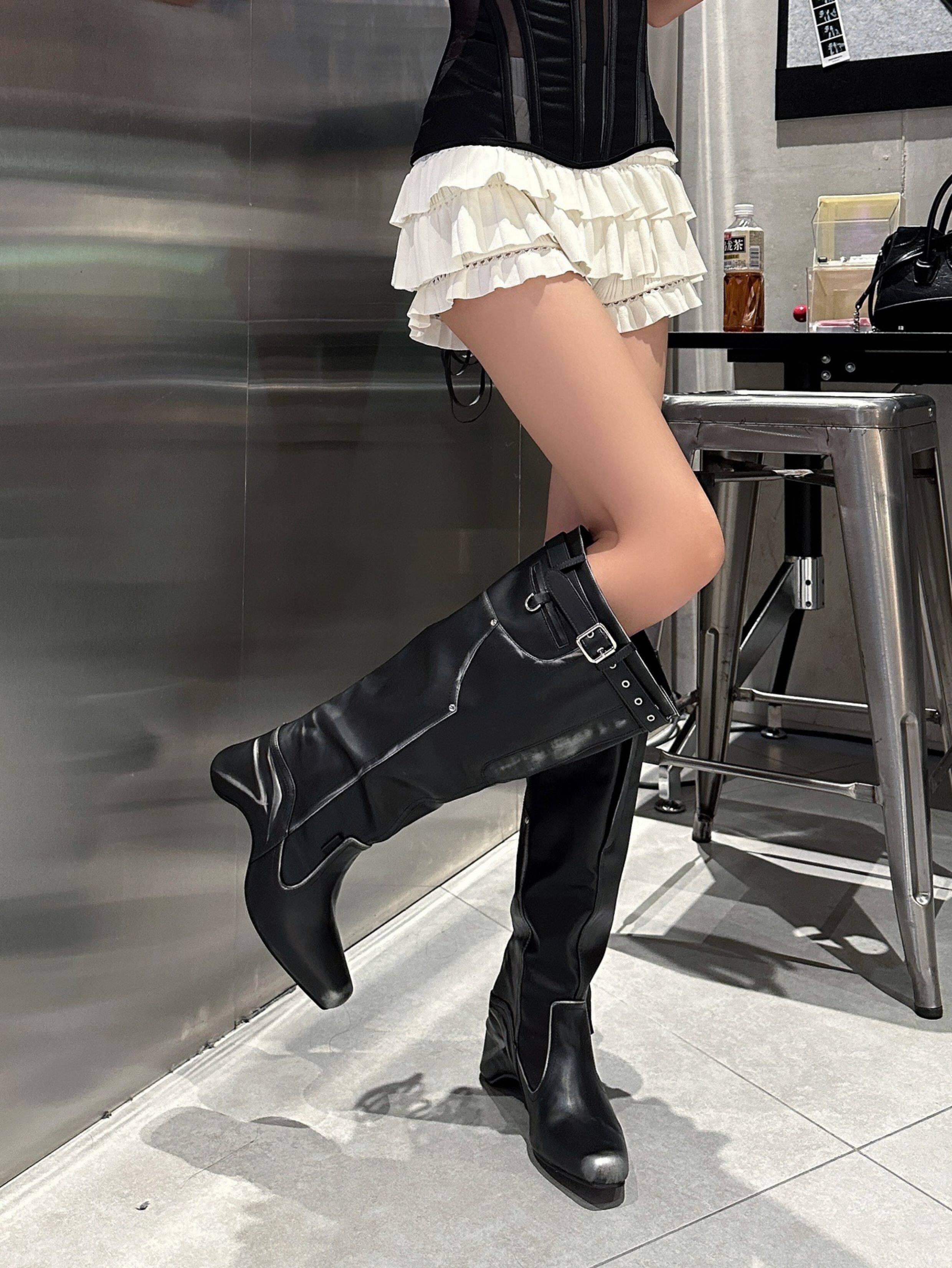 時髦感大筒圍褶皺堆堆靴復古西部牛仔靴異型跟騎士靴辣妹長筒靴女