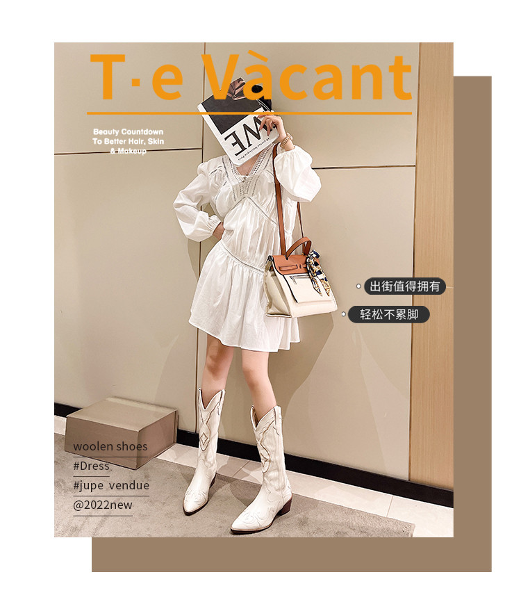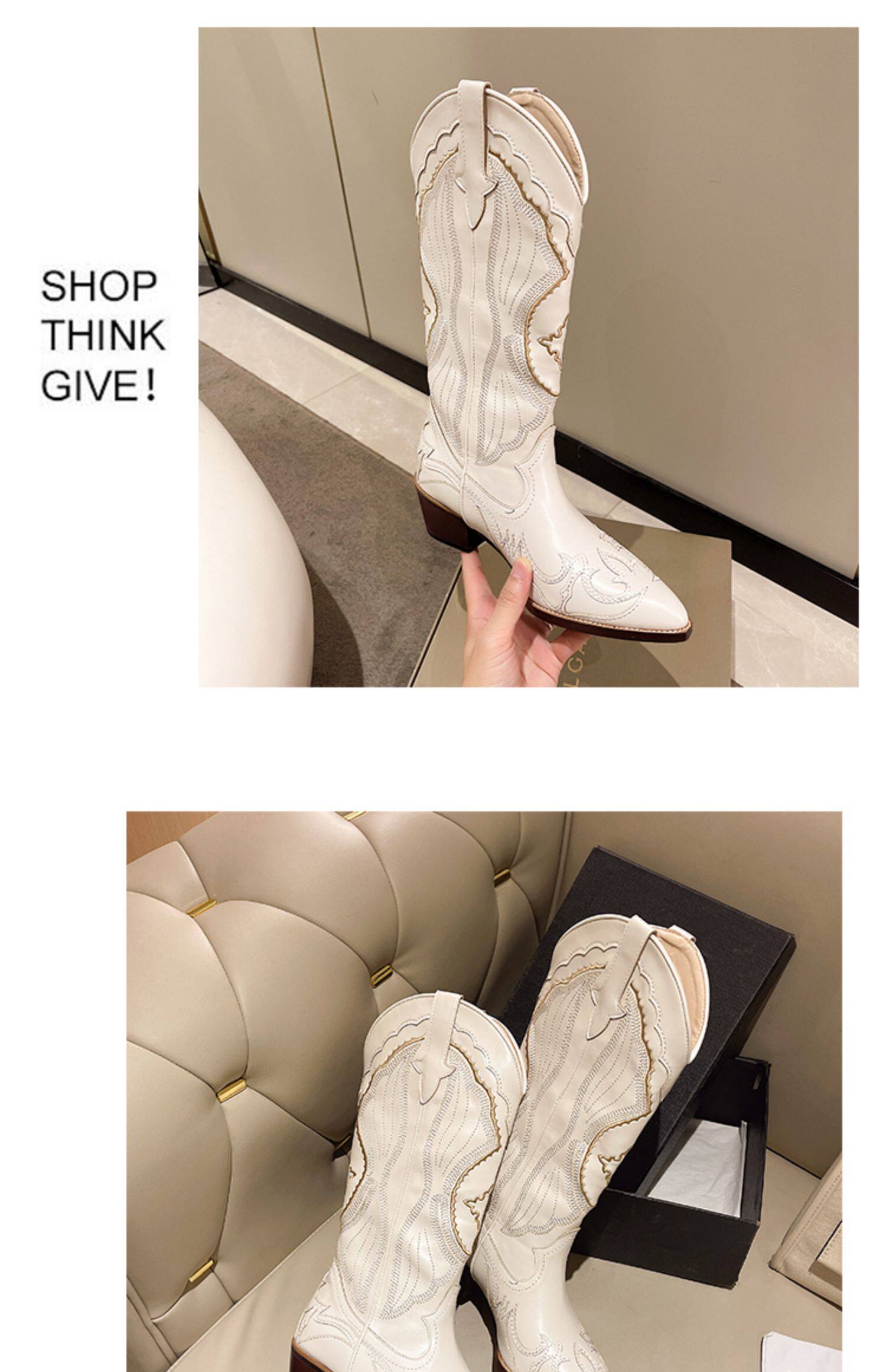歐美V口刺綉不過膝西部牛仔靴女2024新款高跟復古白色騎士時裝靴
