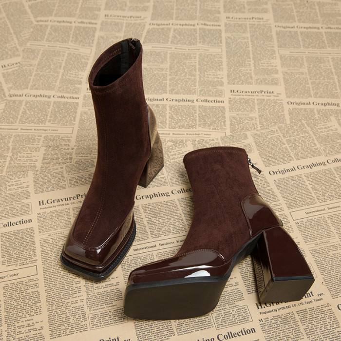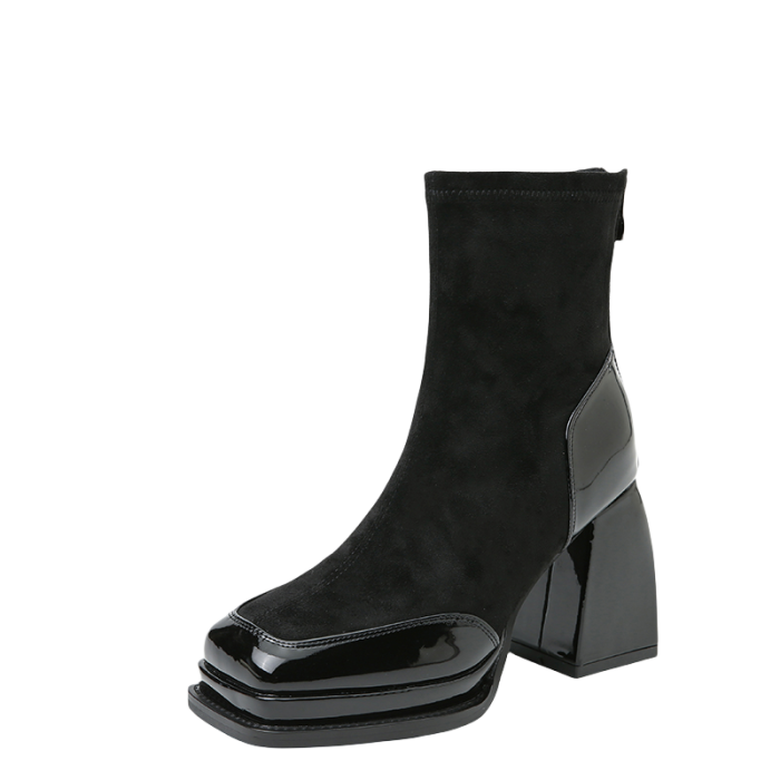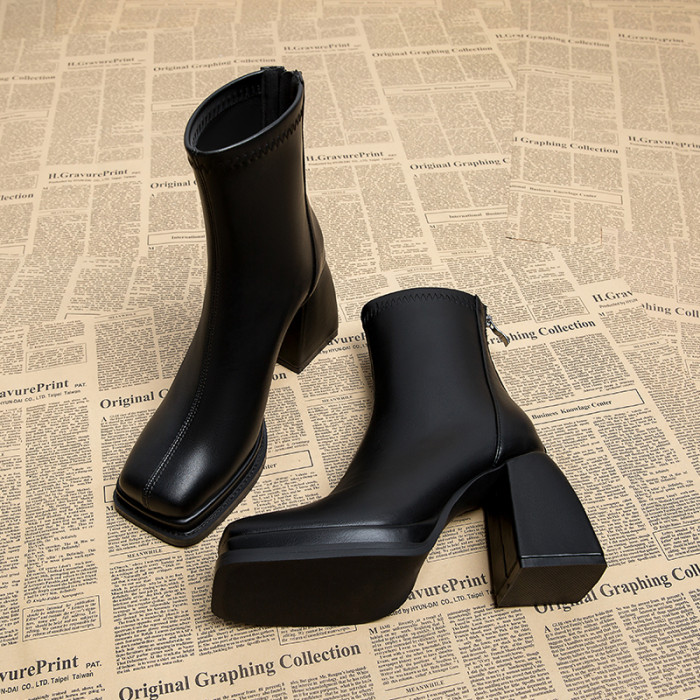 真皮超高跟鞋女秋冬款2026新款方頭粗跟小個子配裙子高級感小短靴