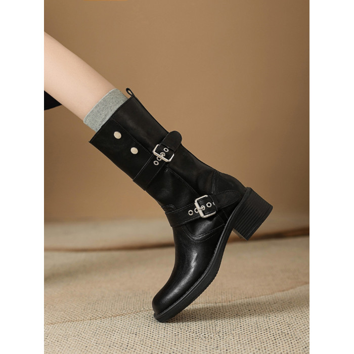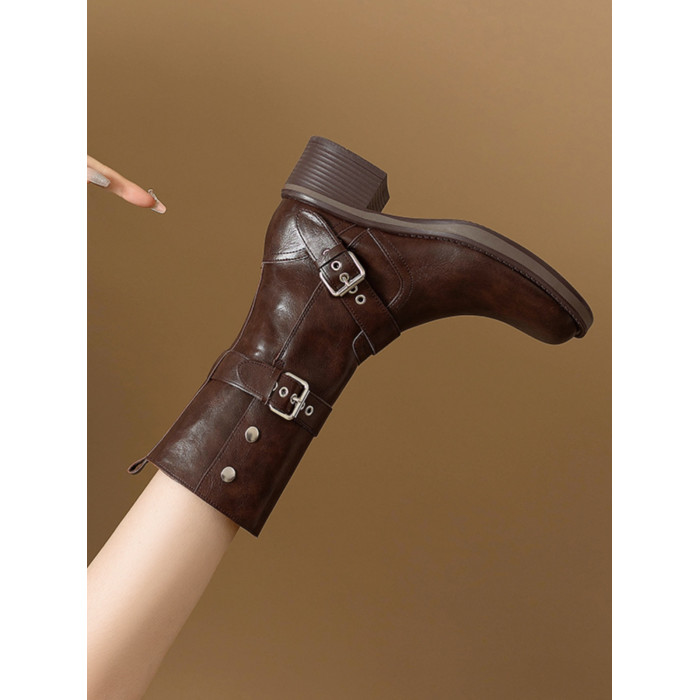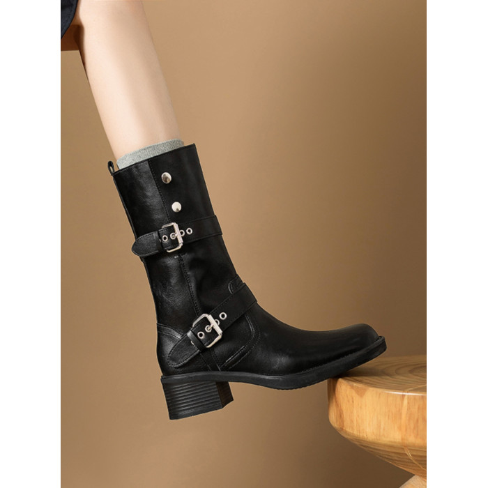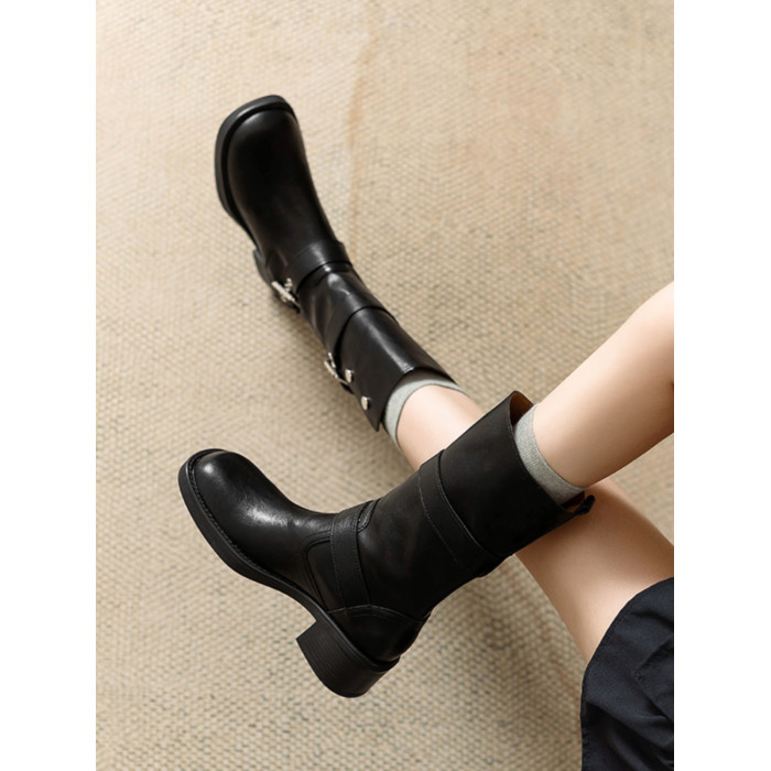 閉眼入秋冬新款復古皮帶釦西部騎士靴鉚釘厚底真皮粗跟中筒馬丁靴