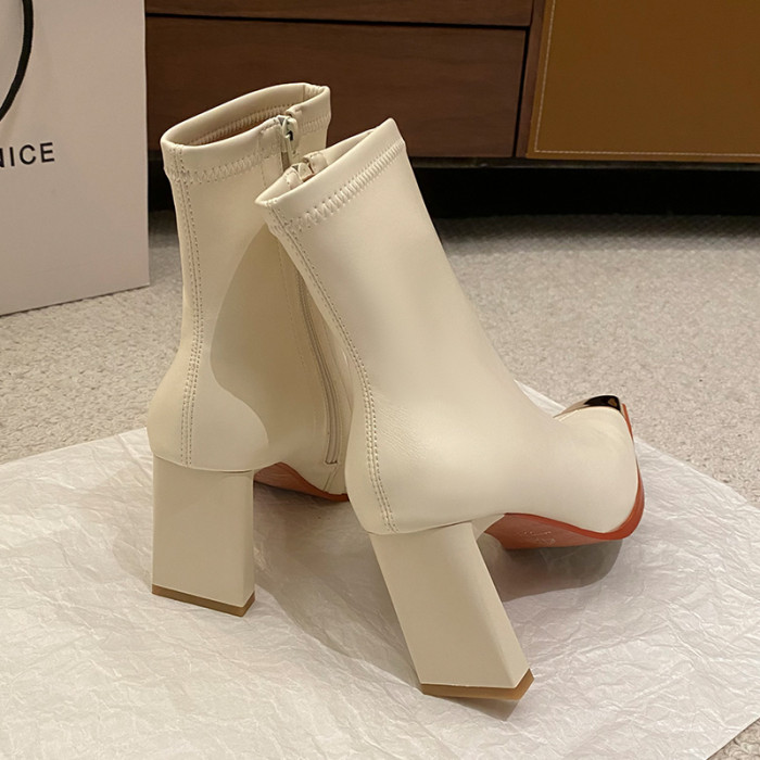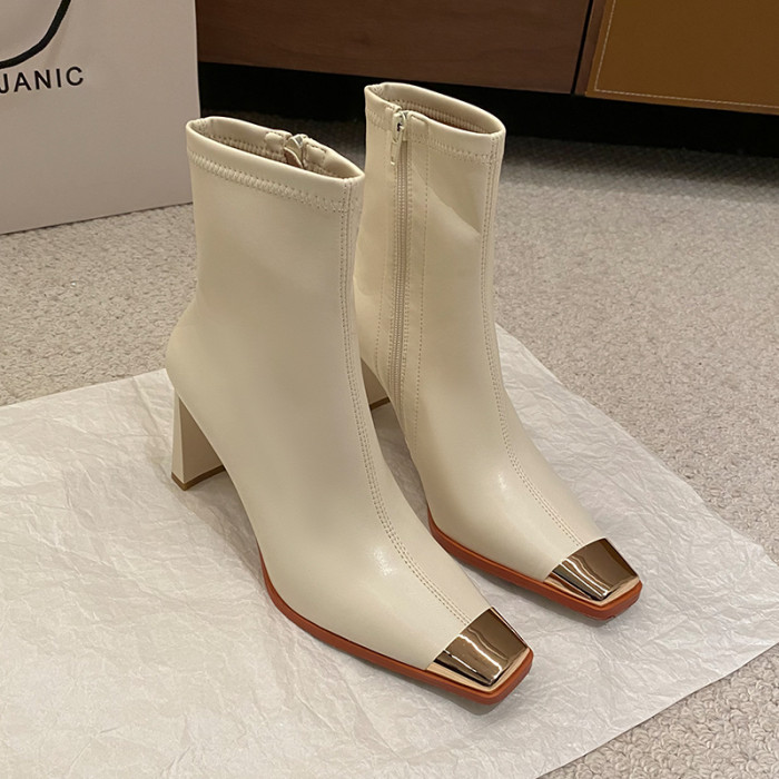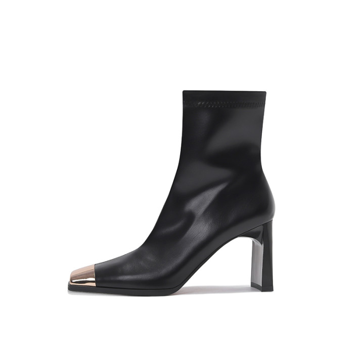 迪麗米迪 靴子女秋冬粗跟金屬方頭短靴女2025新款爆款高跟瘦瘦靴