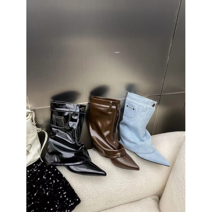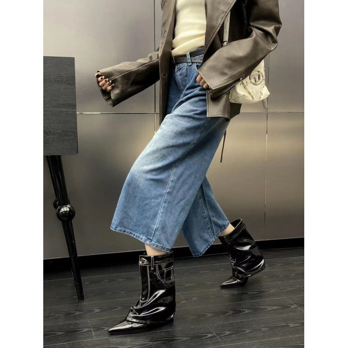 2024秋冬季新款褲琯短靴尖頭西部牛仔靴坡跟百搭時裝前拉鍊馬丁靴