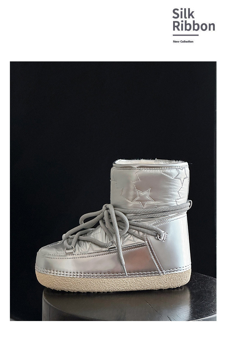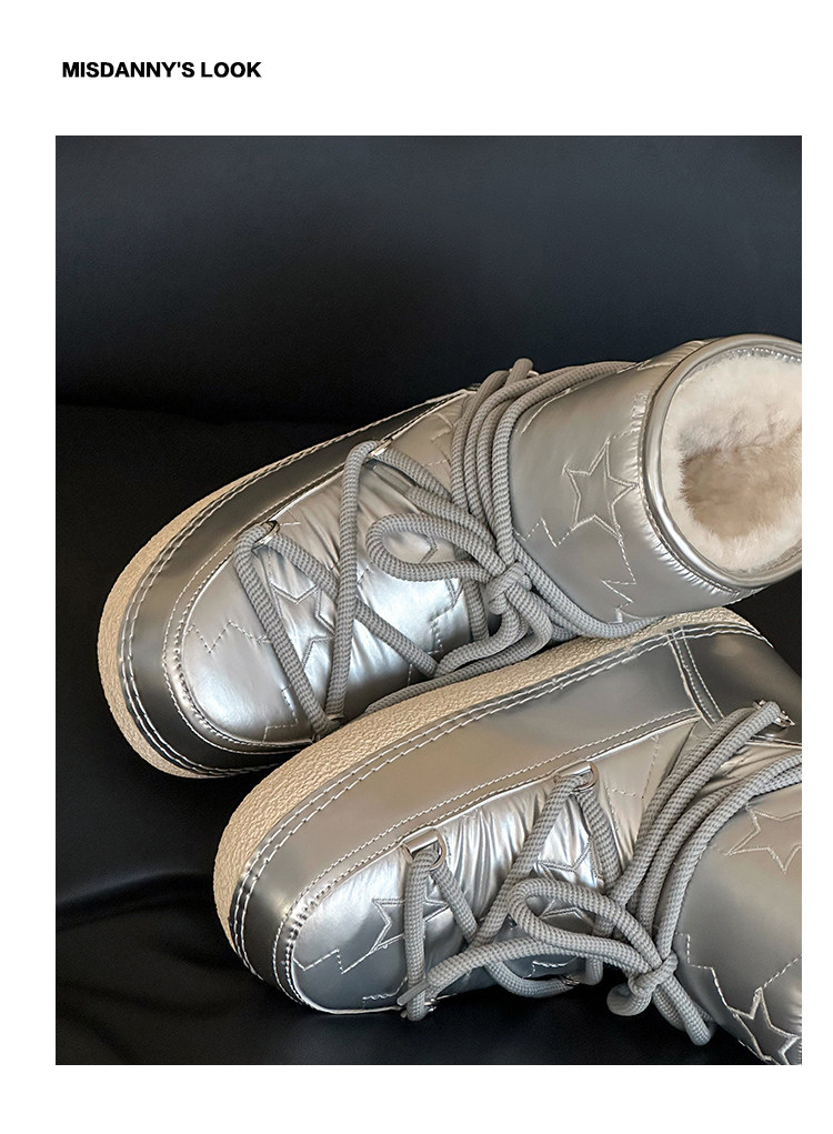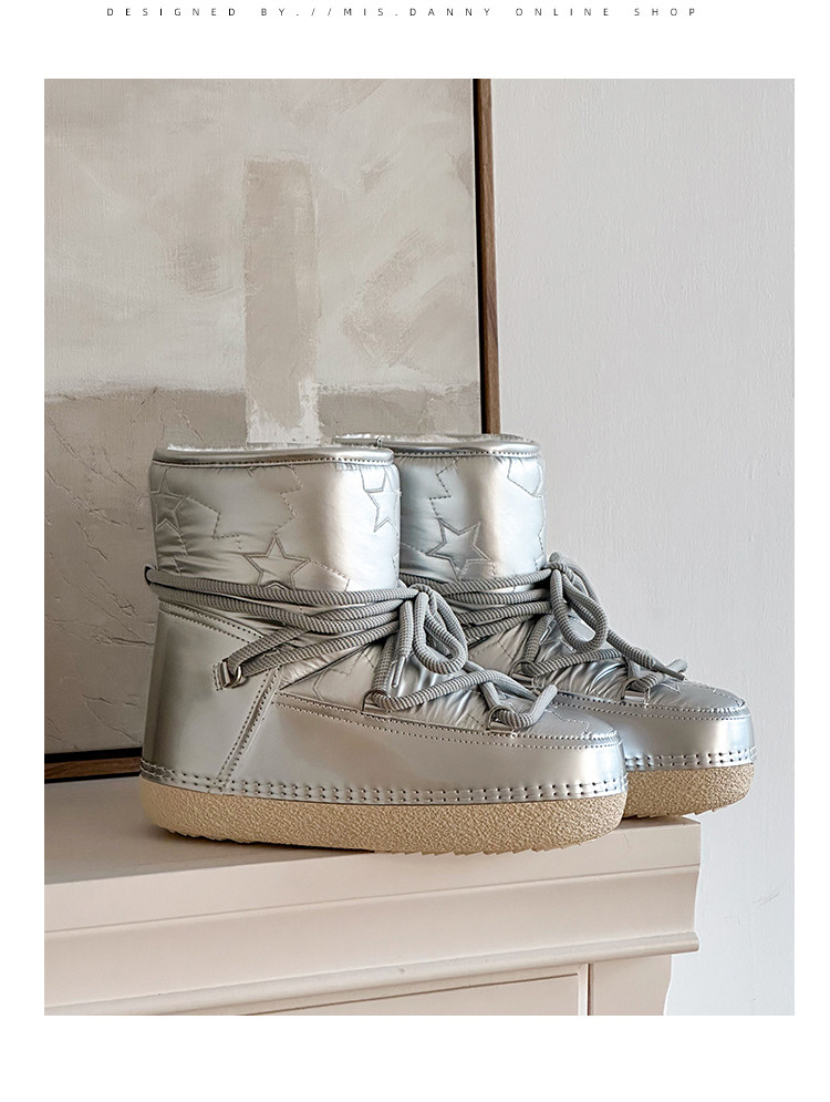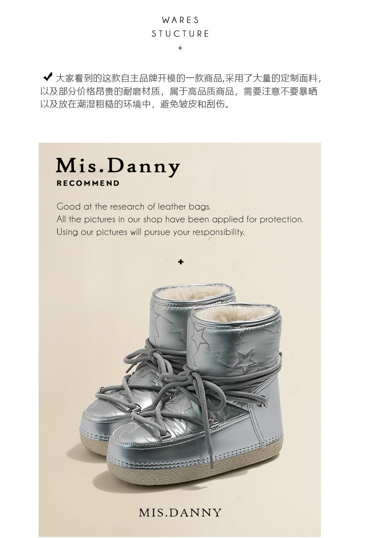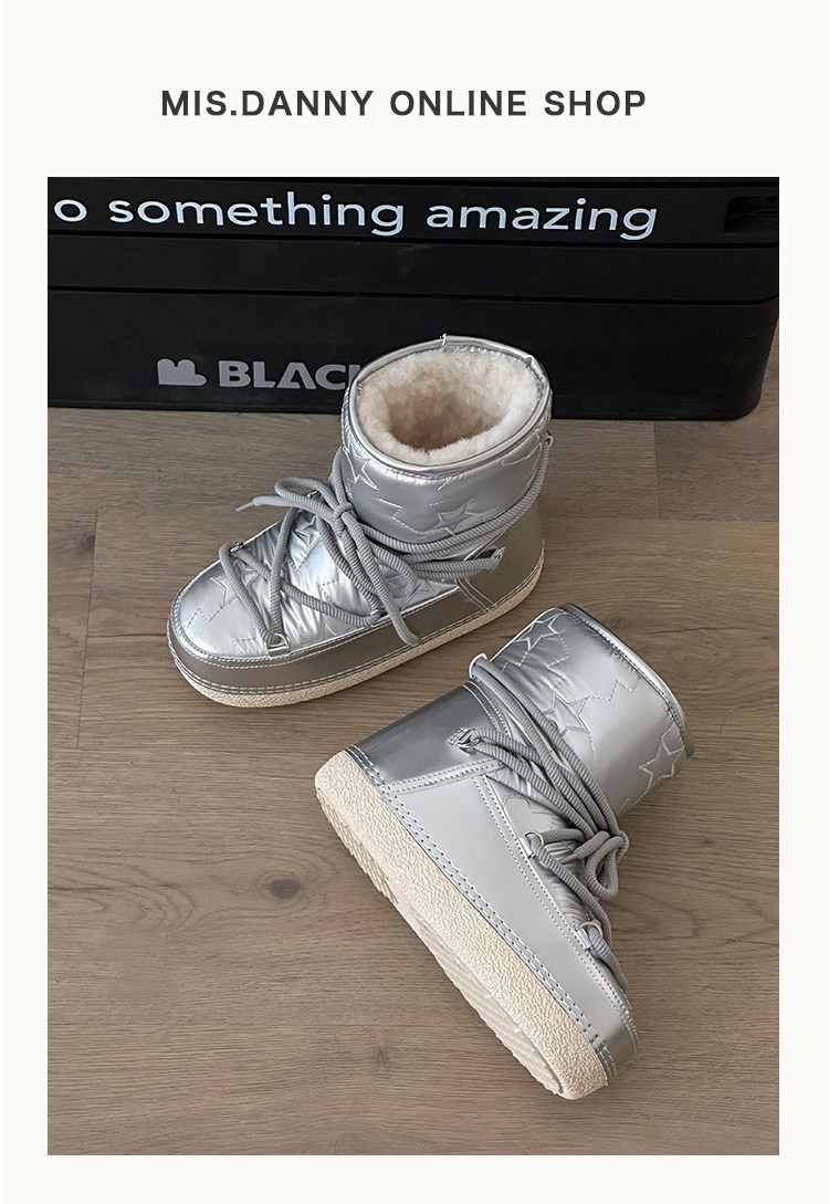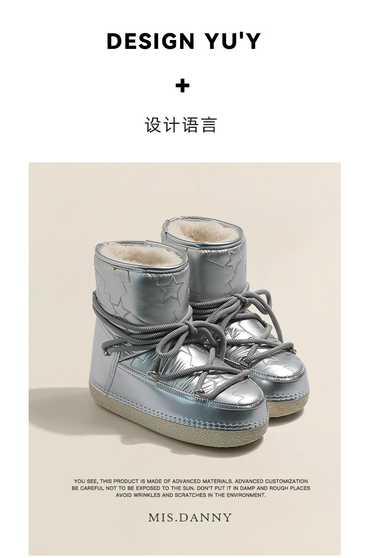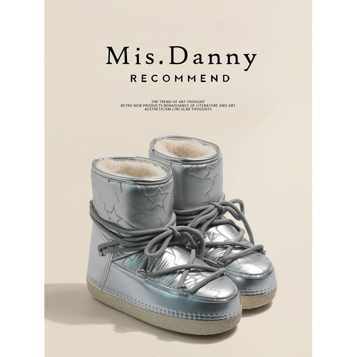 Misdanny~防水防滑雪地靴女2025冬軟底銀色月亮短靴加絨加厚棉鞋
