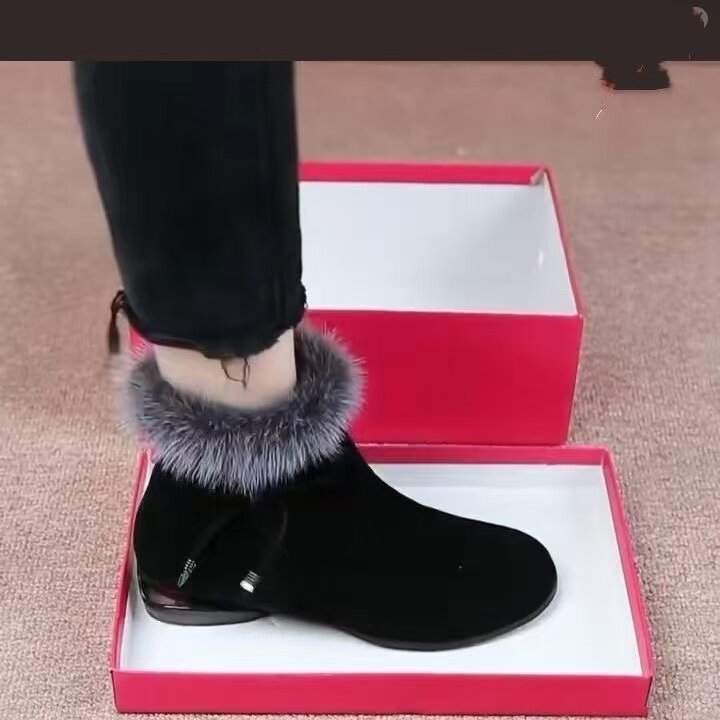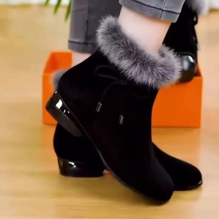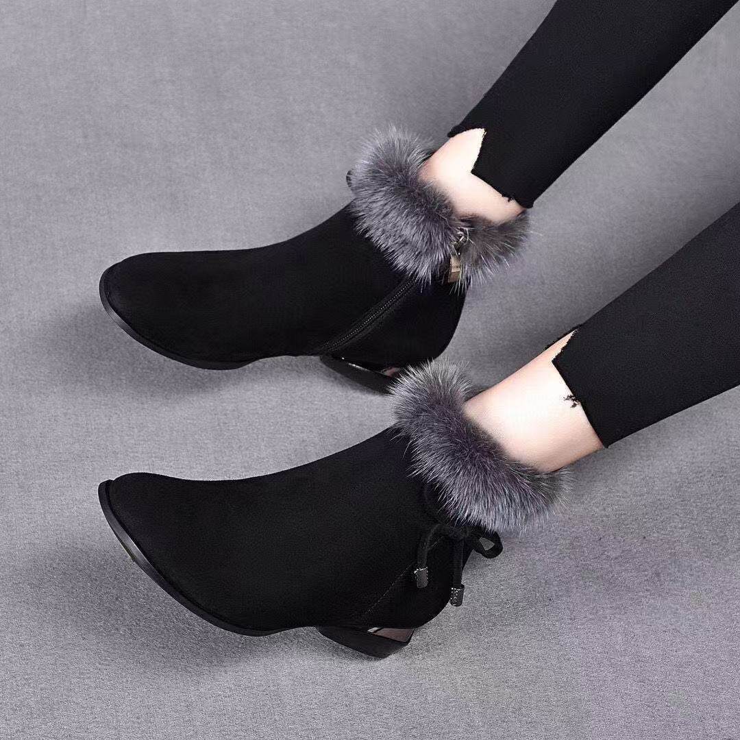 軟皮磨砂毛毛短靴細跟高跟鞋2025新款秋冬季氣質尖頭女棉皮鞋加絨