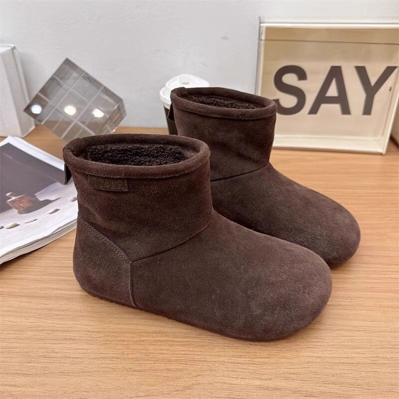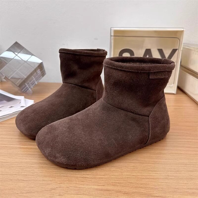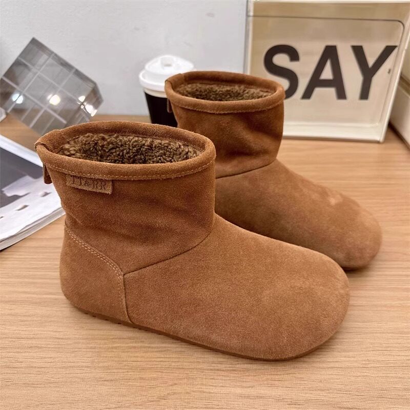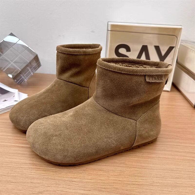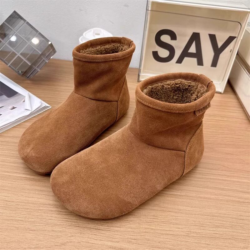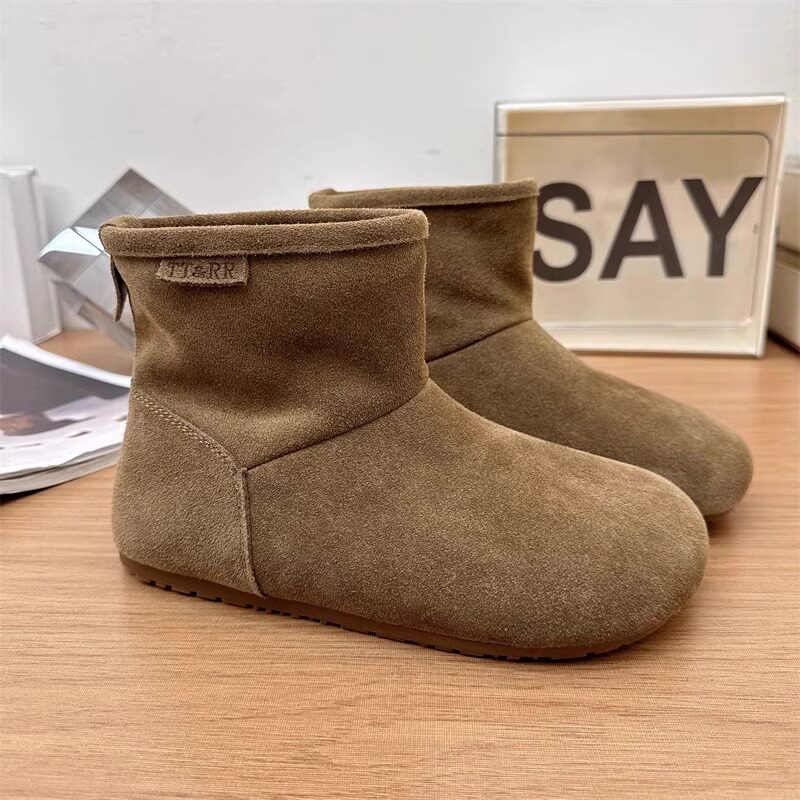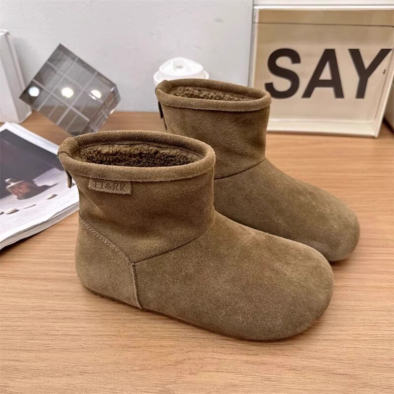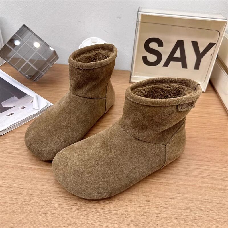 2025冬季新款磨砂真皮平底復古馬丁靴女加絨保暖醜萌大頭雪地棉靴