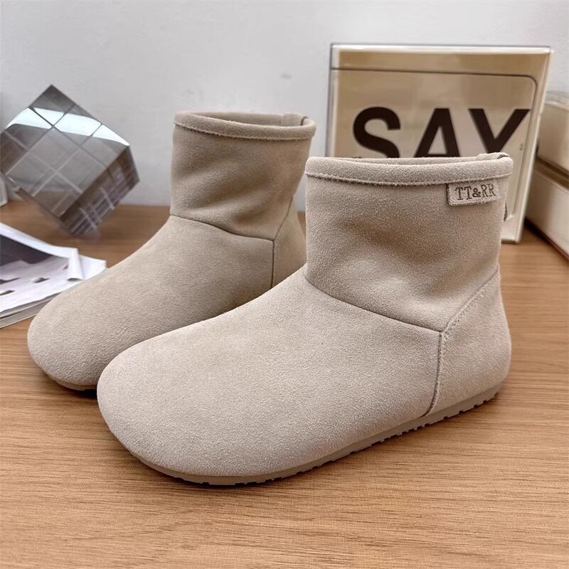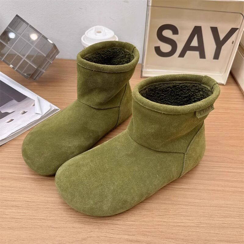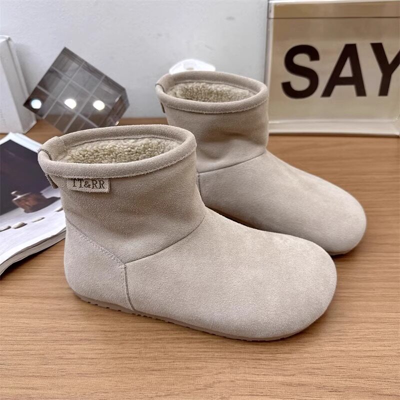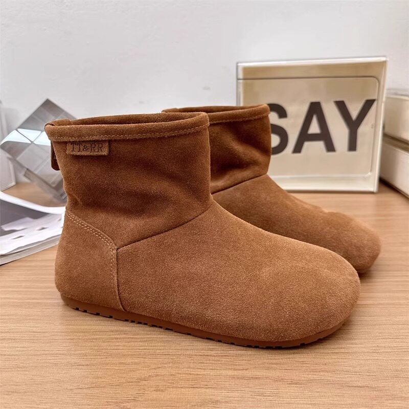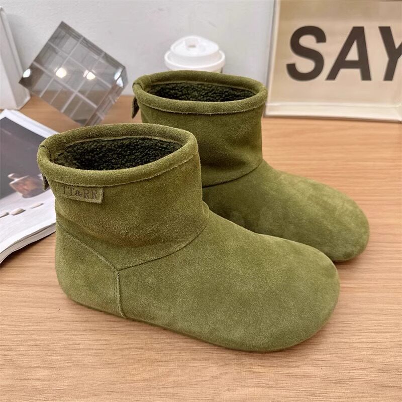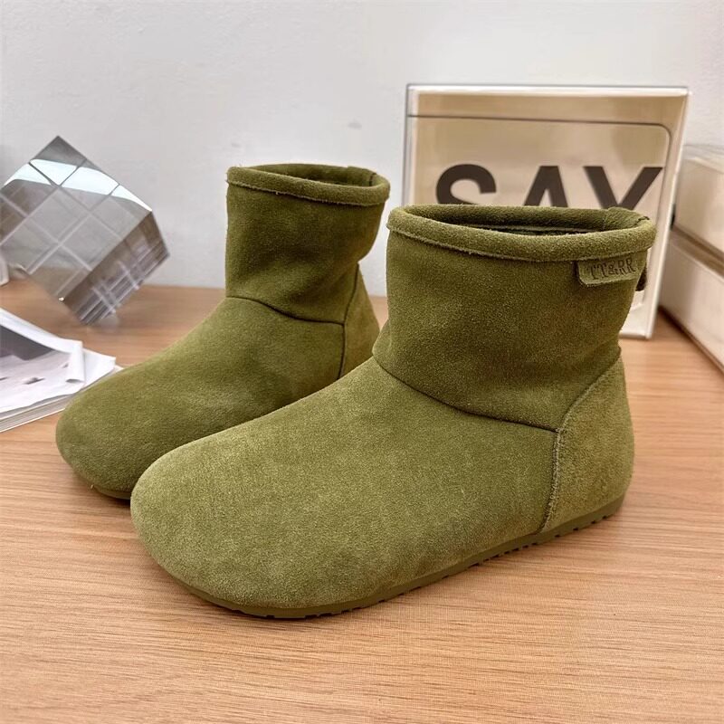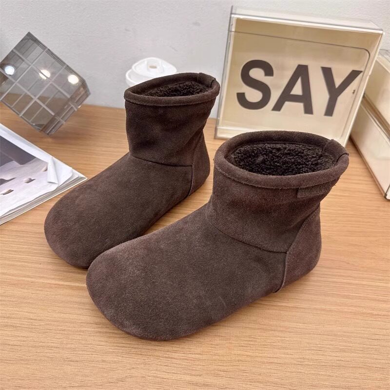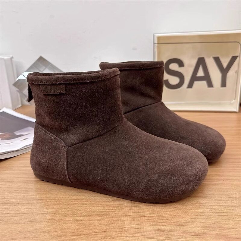2025冬季新款磨砂真皮平底復古馬丁靴女加絨保暖醜萌大頭雪地棉靴