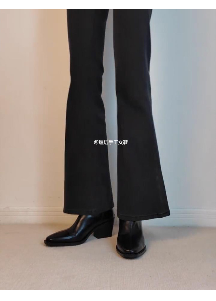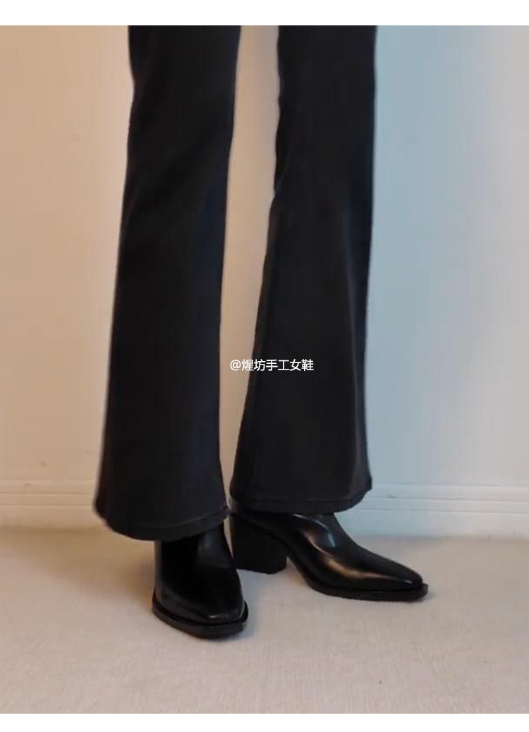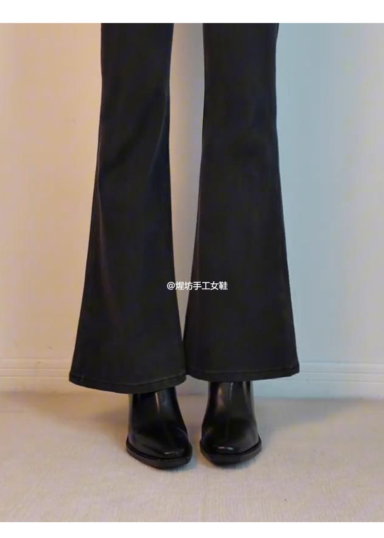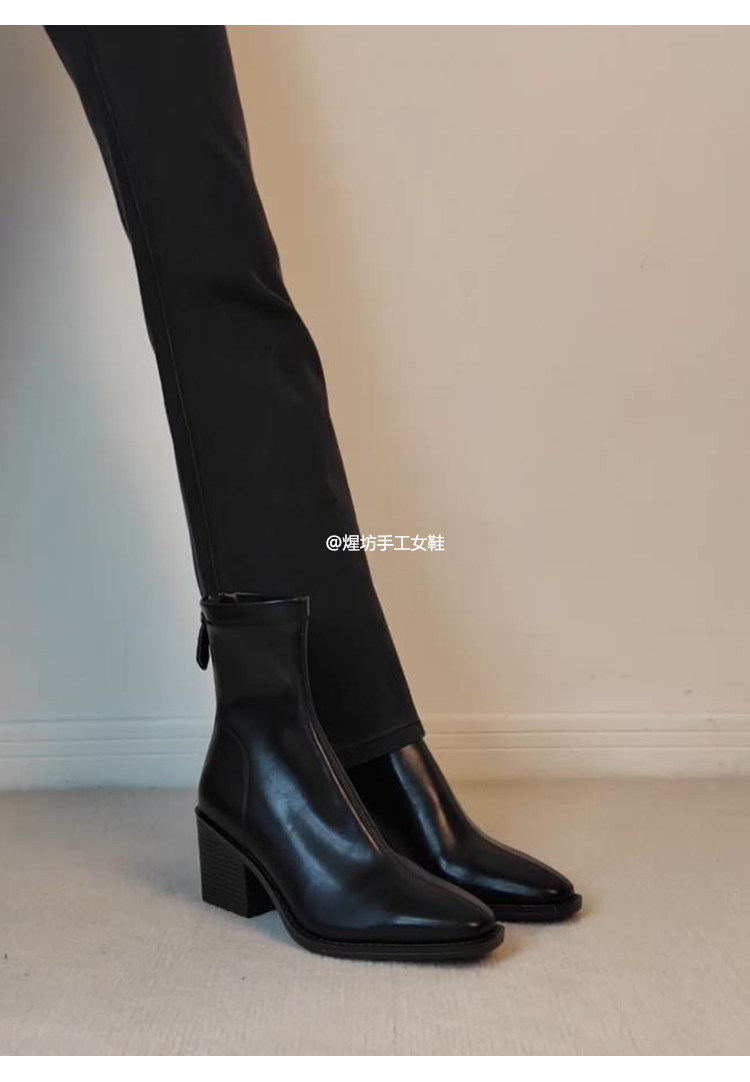 牛皮版~高跟方頭彈力瘦瘦靴女秋冬新款法式粗跟黑色馬丁靴子短靴