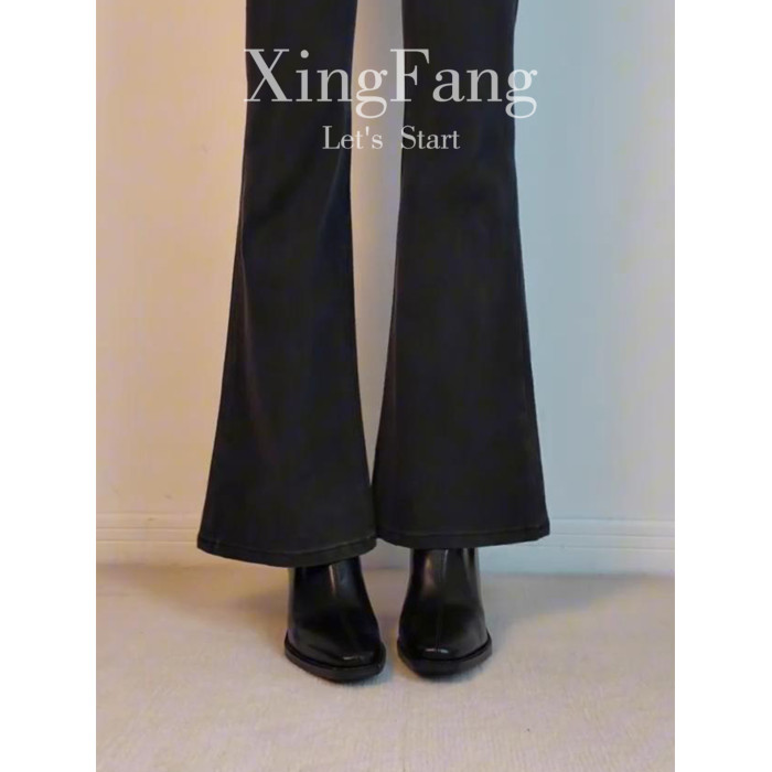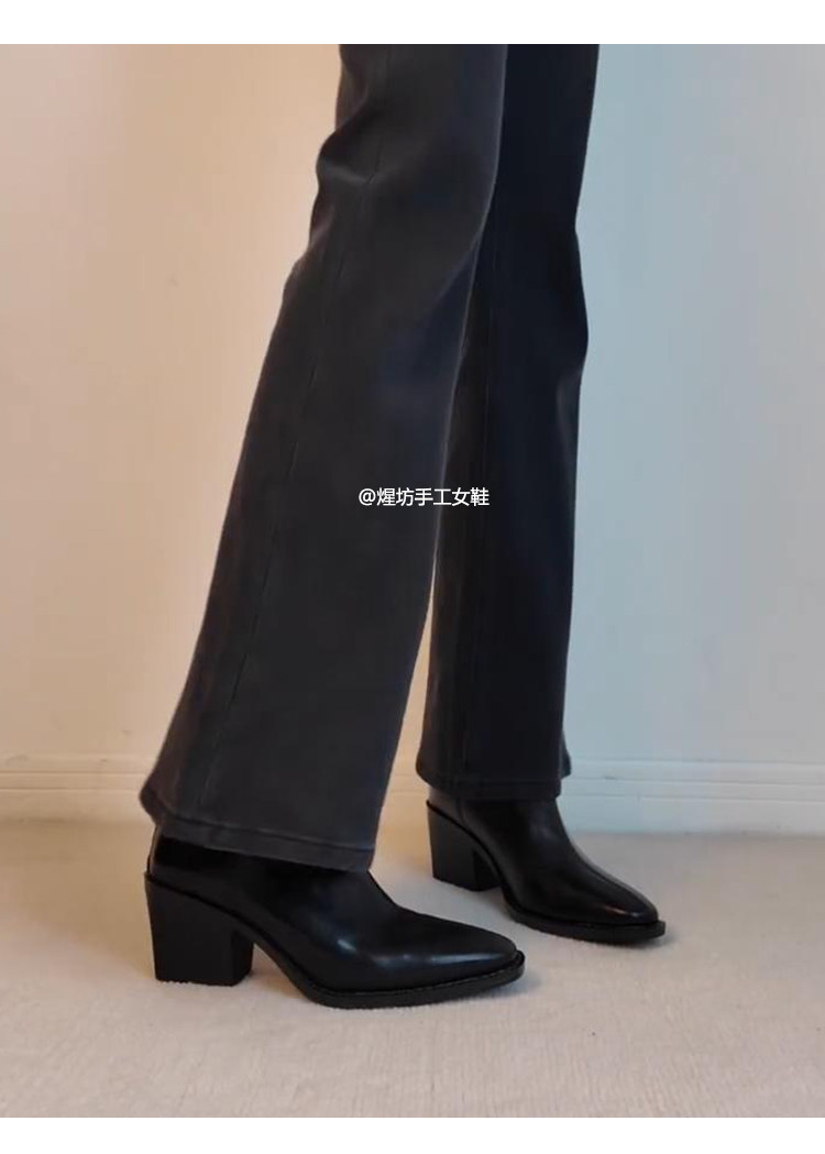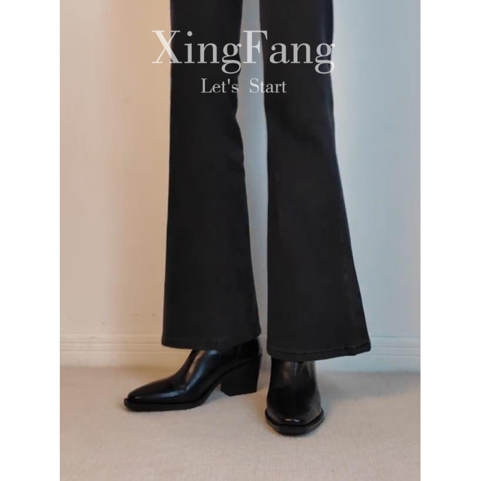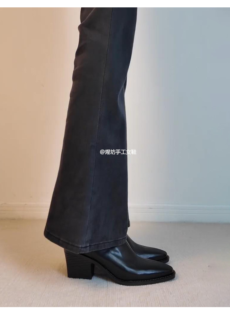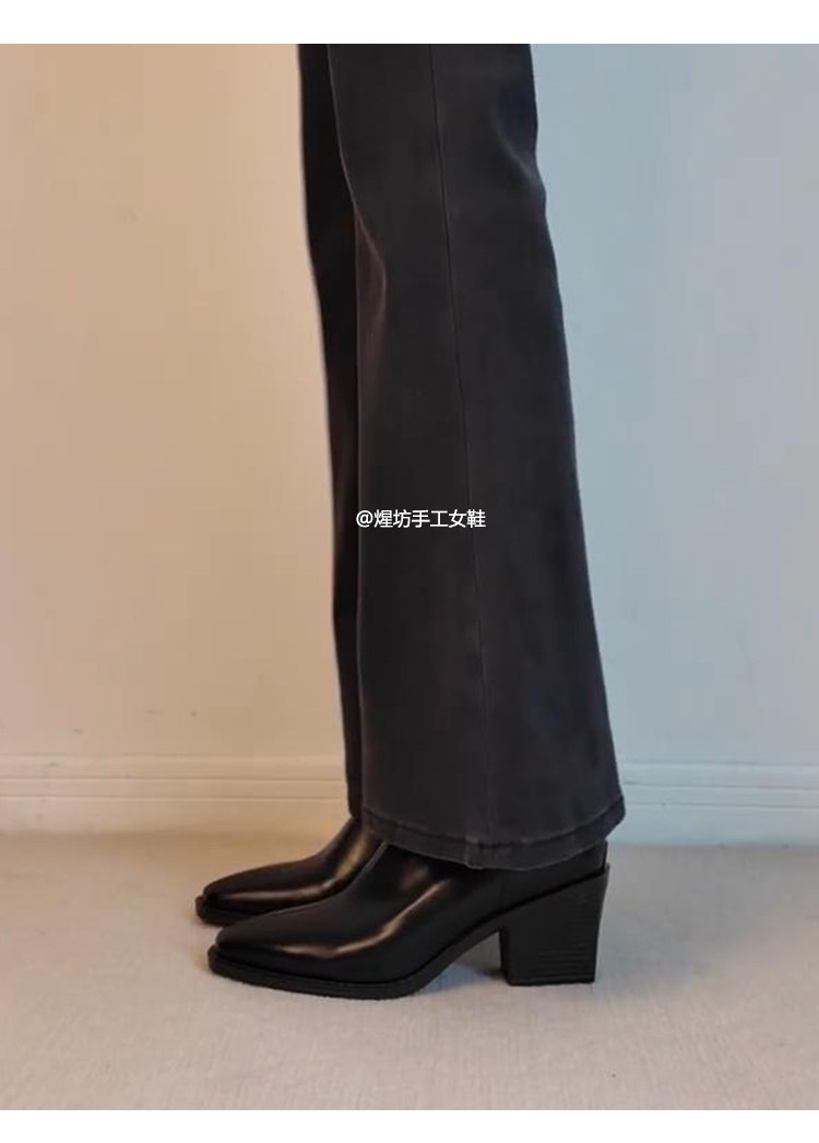 牛皮版~高跟方頭彈力瘦瘦靴女秋冬新款法式粗跟黑色馬丁靴子短靴