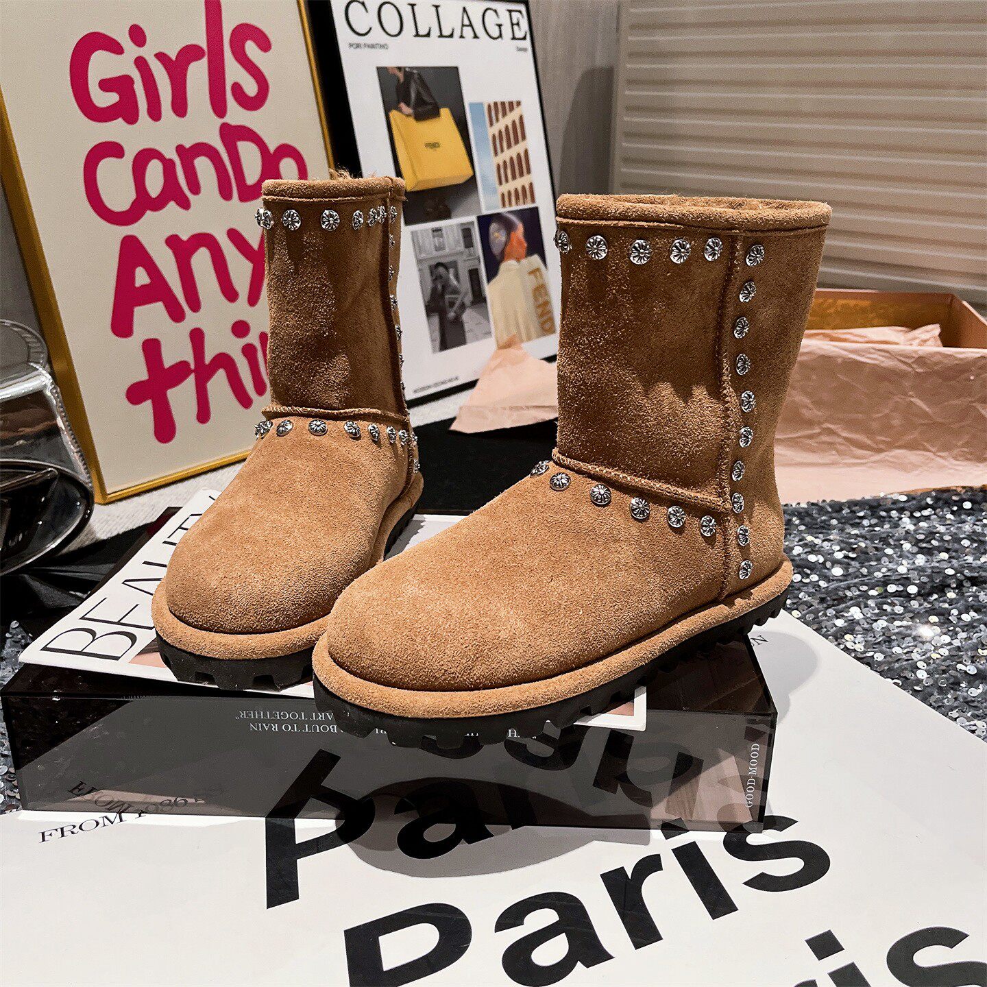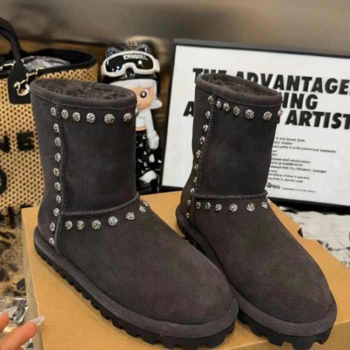 歐美風鉚釘毛毛雪地靴女冬季保暖加厚短靴圓頭棉靴