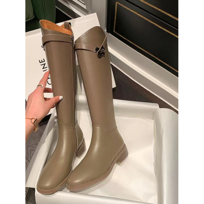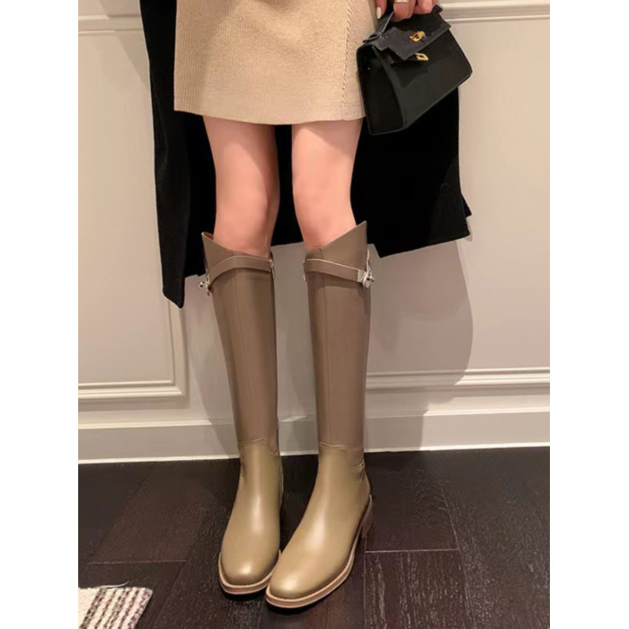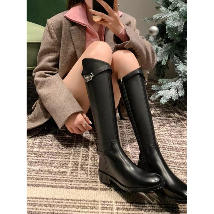 羊皮版~2025金屬鎖釦騎士靴小圓頭不過膝長靴女斜口釦帶高筒靴女