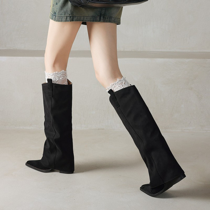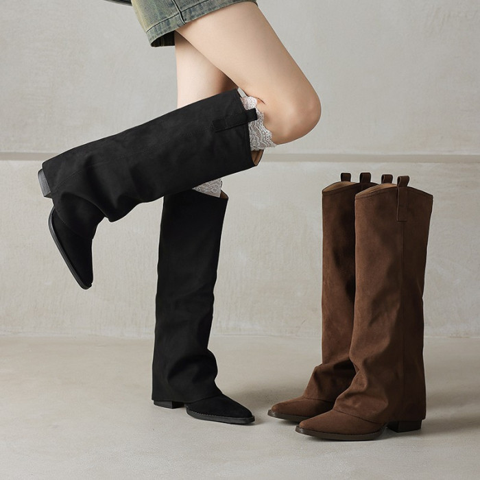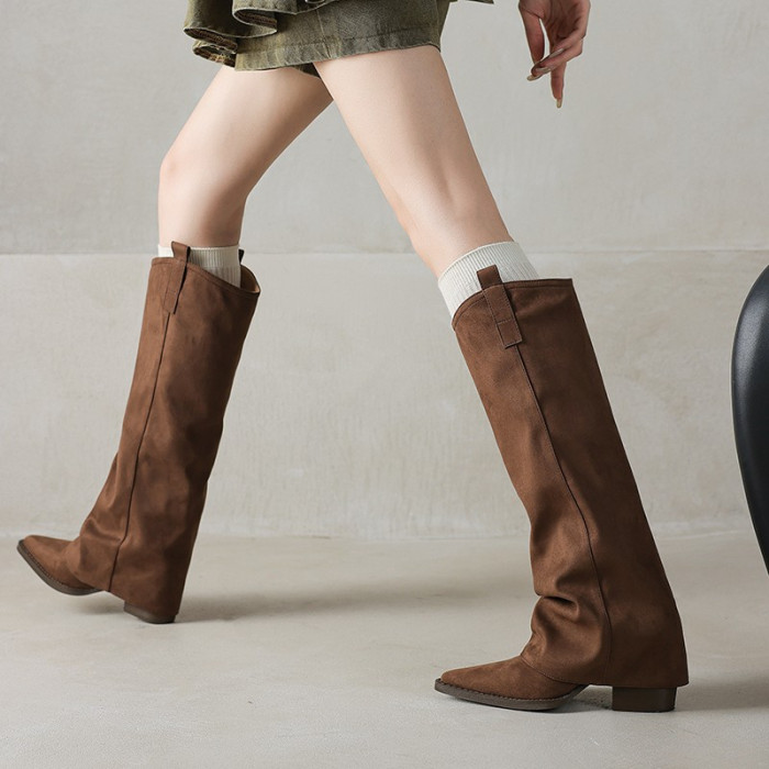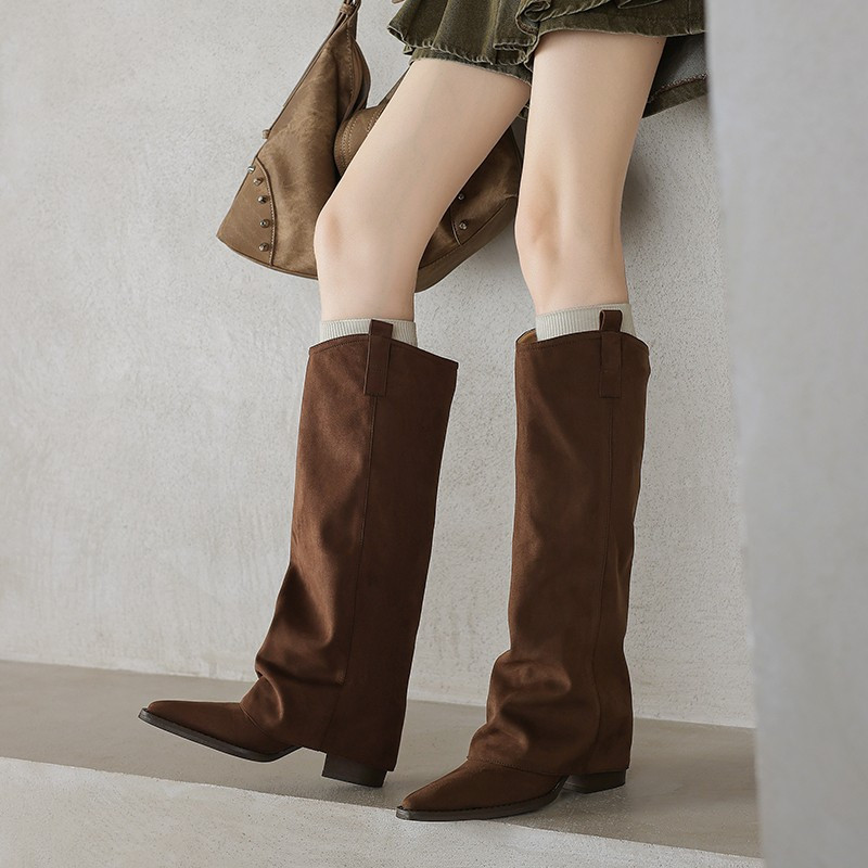 復古美拉德粗跟長筒靴女棕色尖頭顯瘦褲琯靴騎士靴