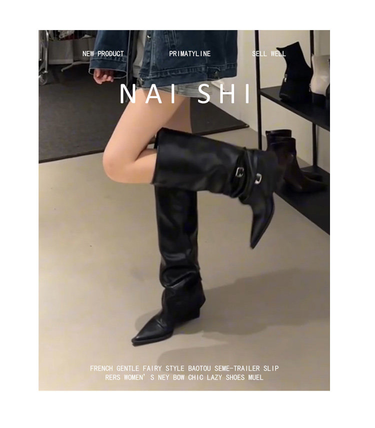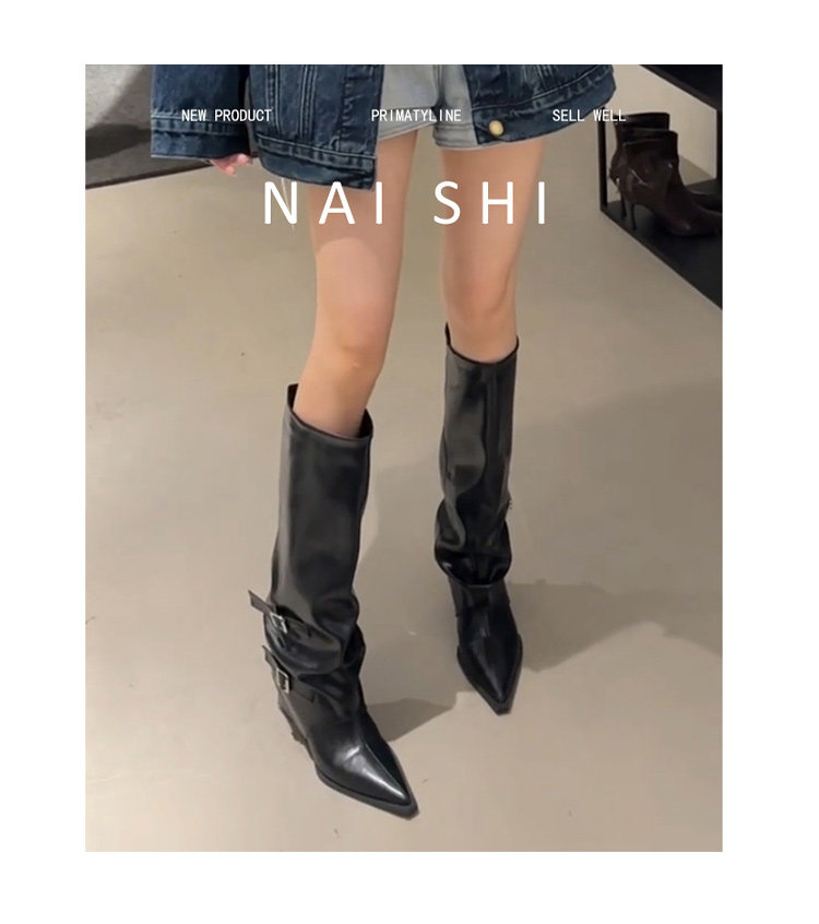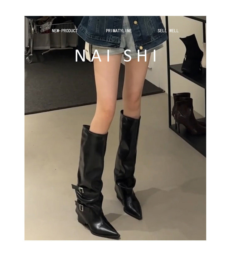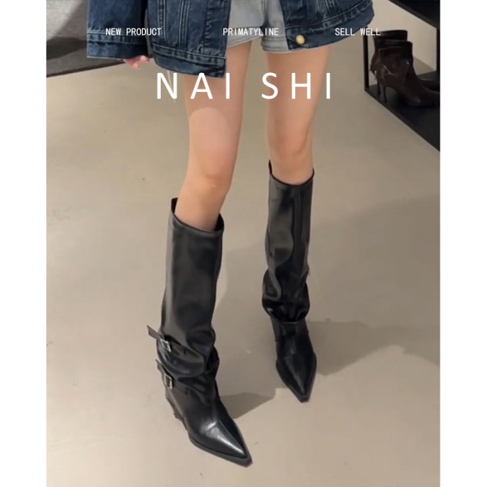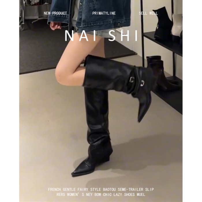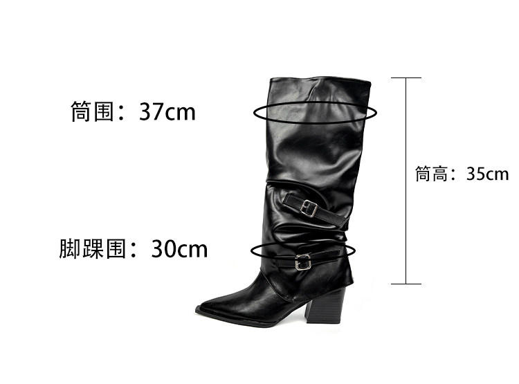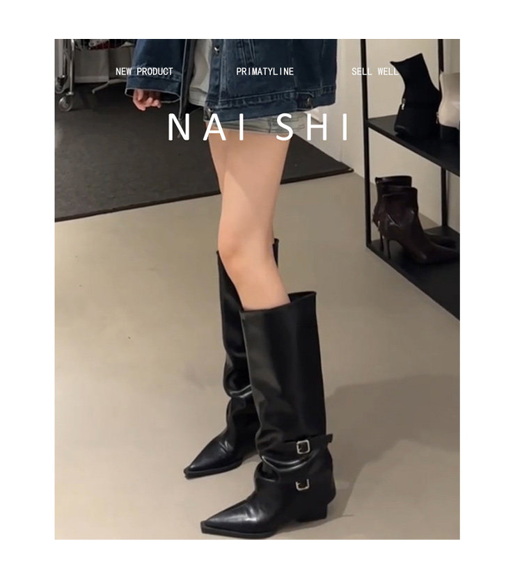 羊皮版!尖頭粗跟褲琯靴女設計感皮帶釦高筒騎士靴不過膝牛仔長靴