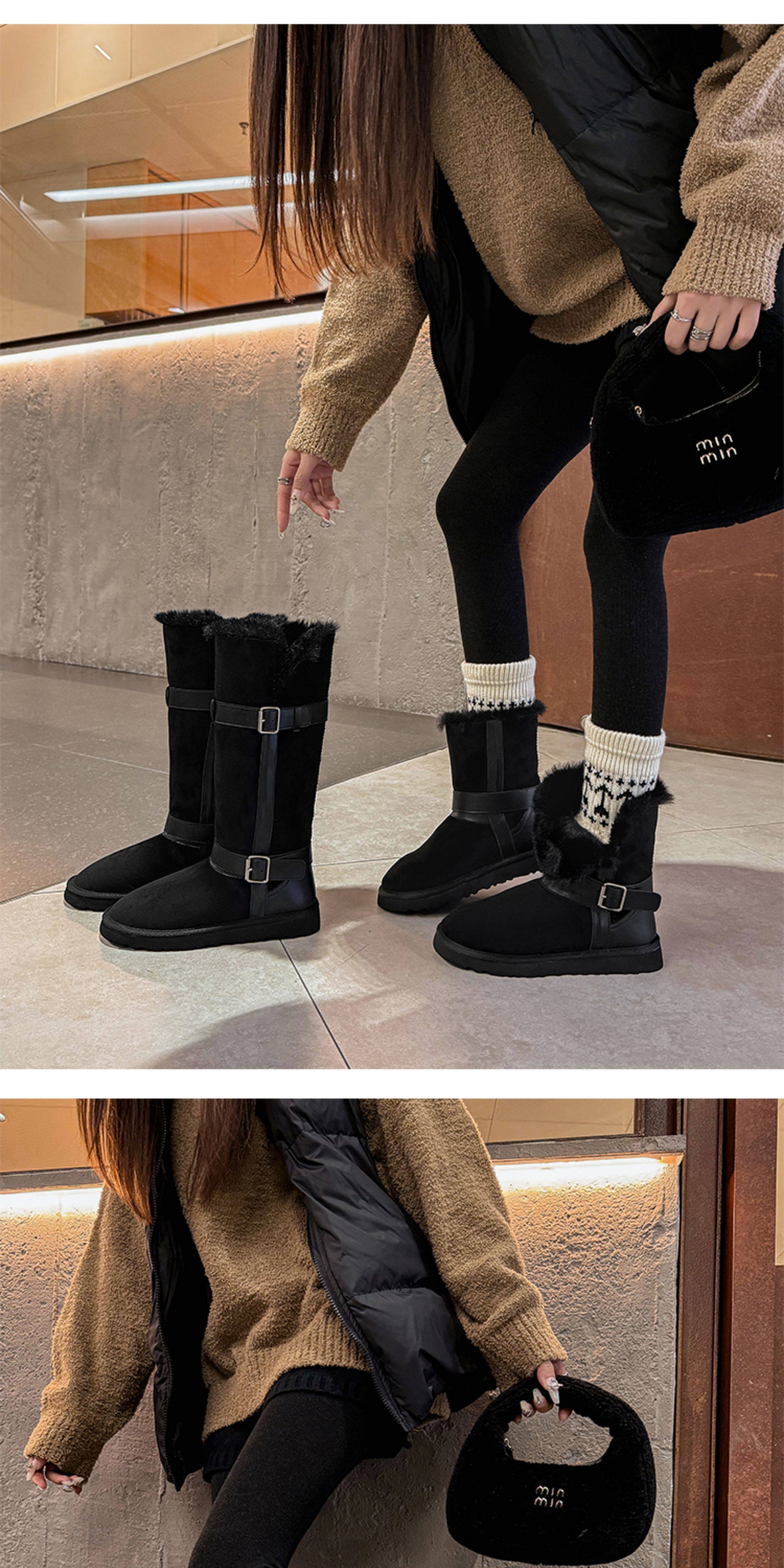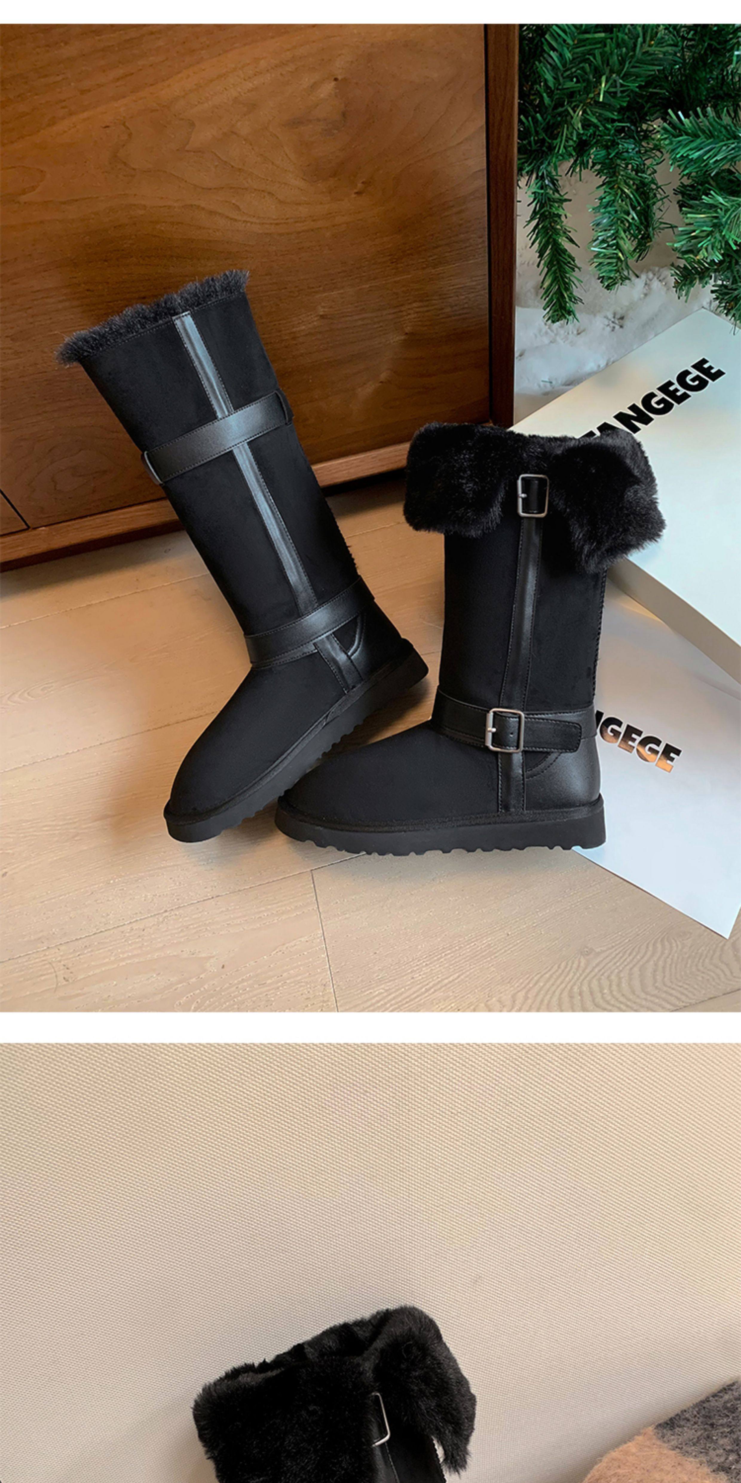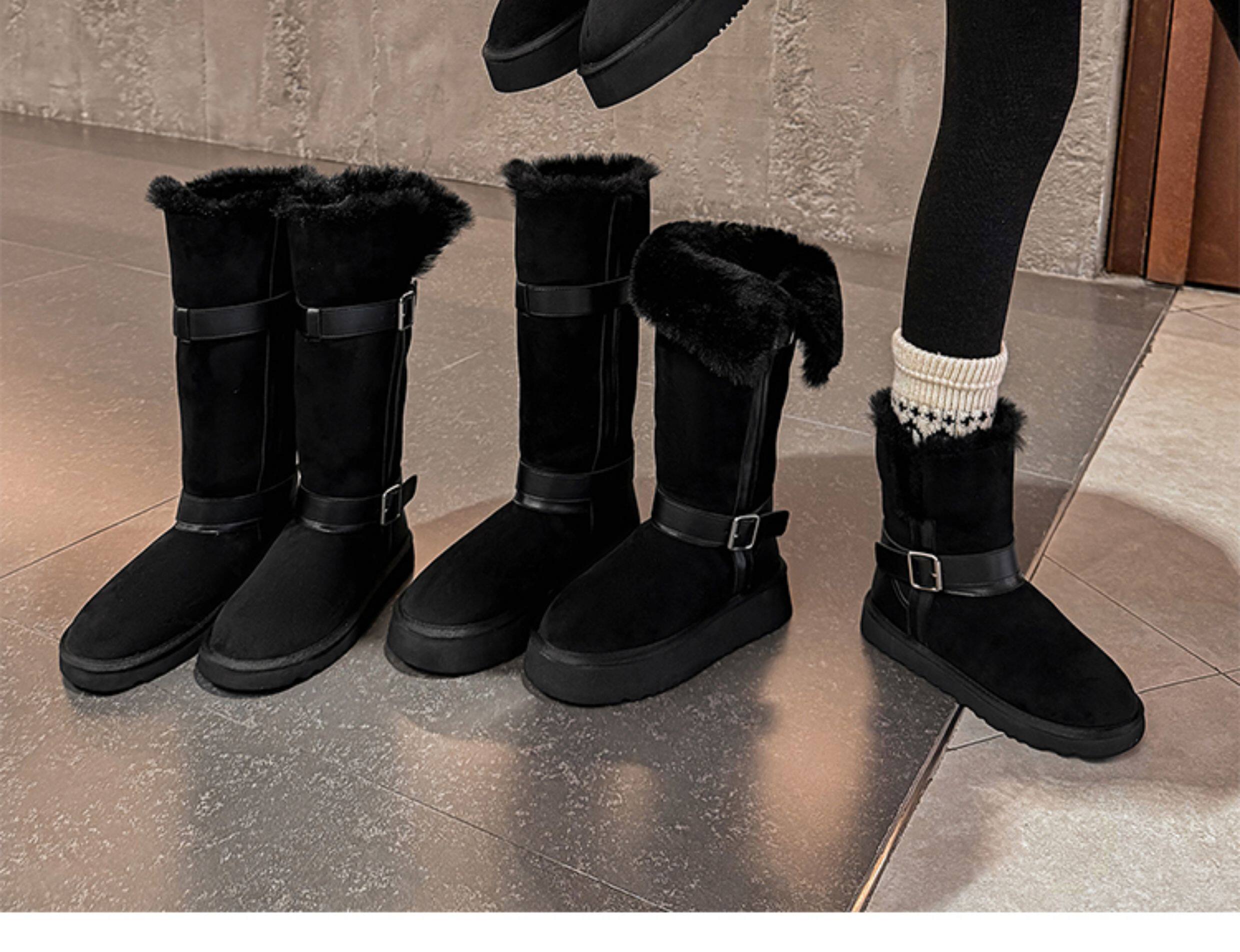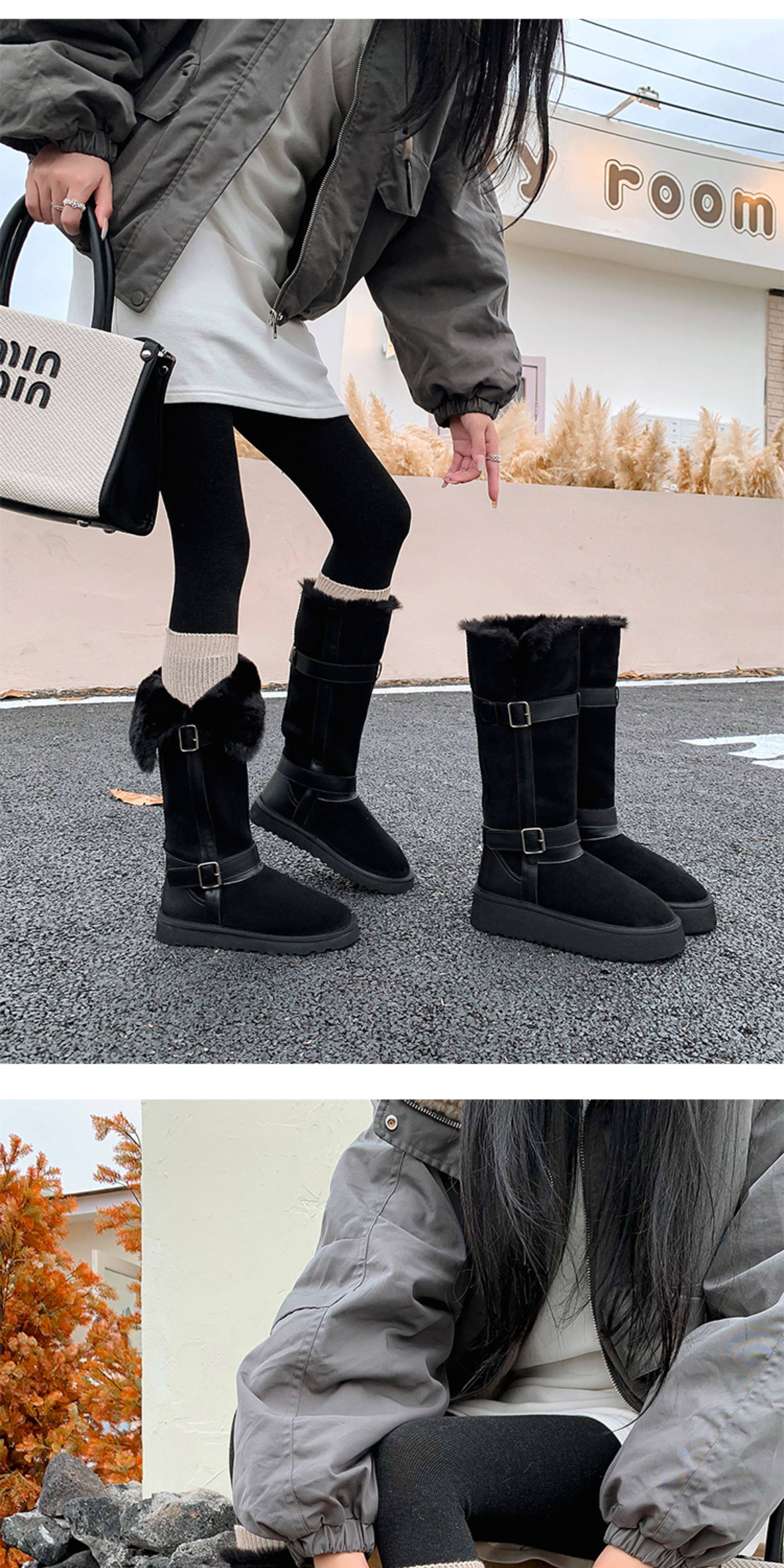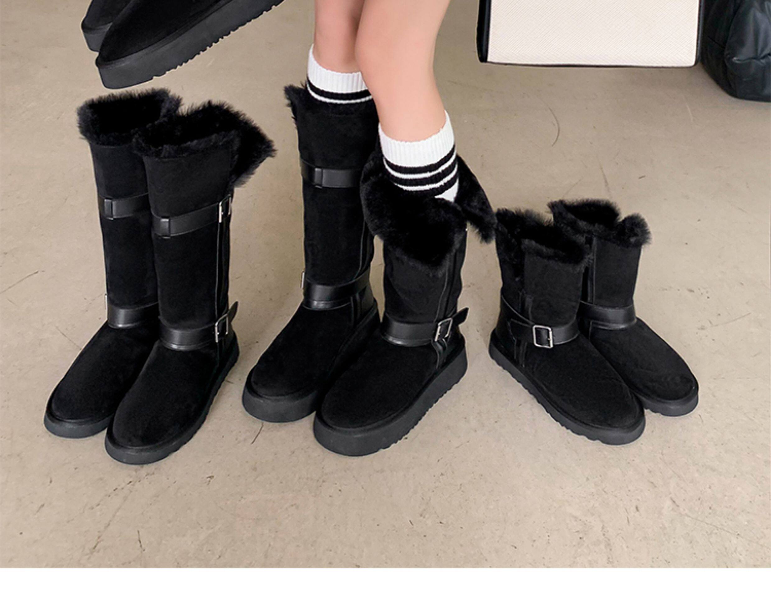不二橘 秋冬皮帶釦加絨長筒雪地靴厚底防滑保暖毛毛靴百搭舒適