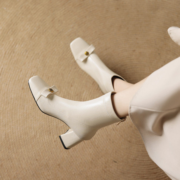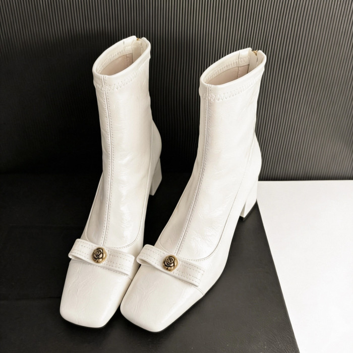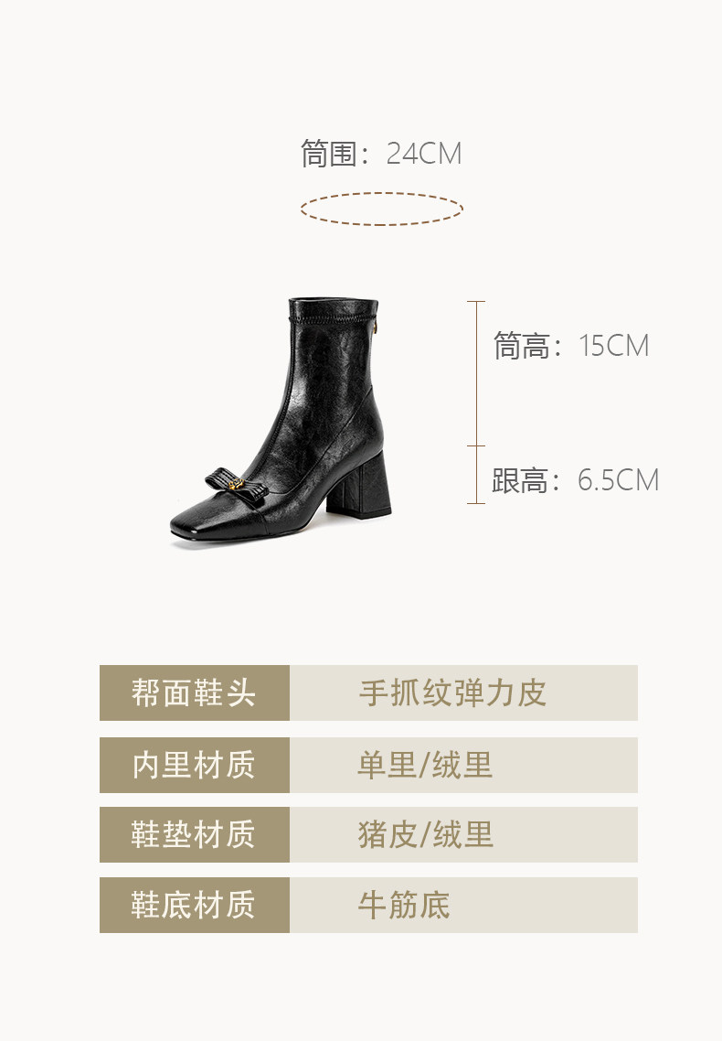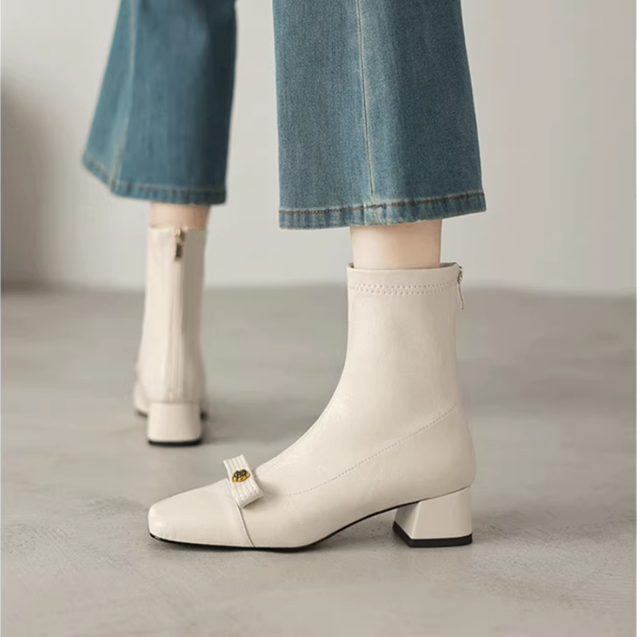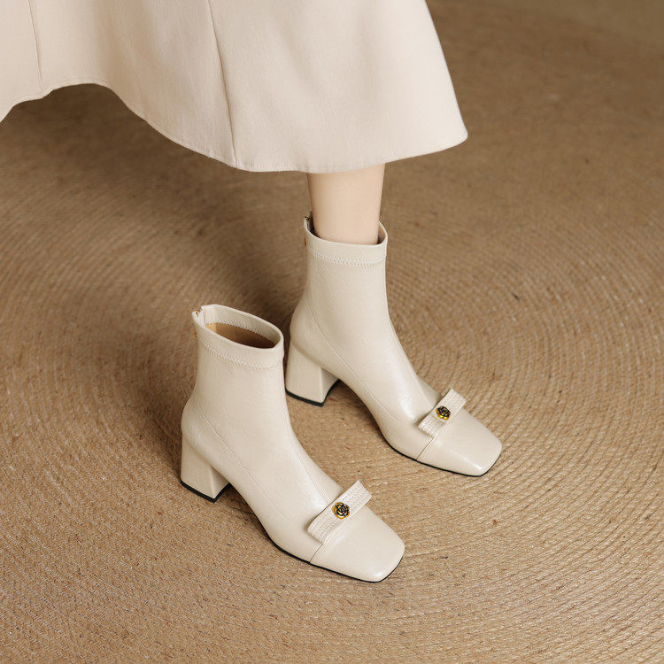 白色方頭彈力瘦瘦靴短靴秋冬新款粗跟法式小香風山茶花蝴蝶結女靴