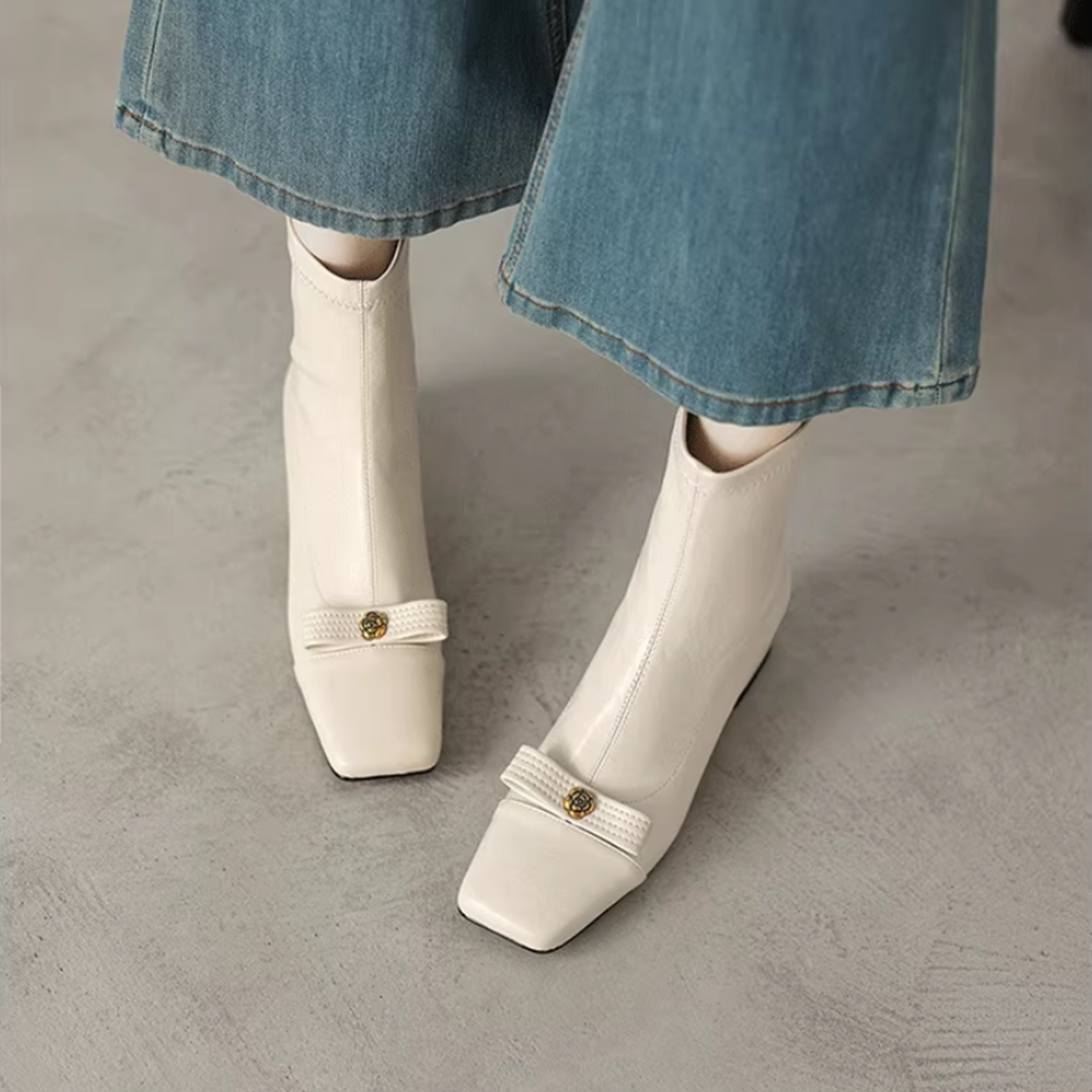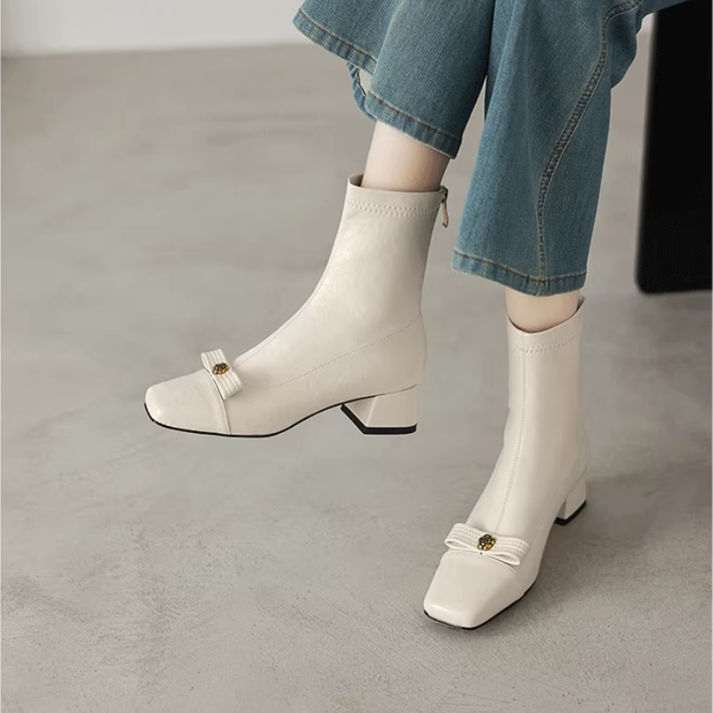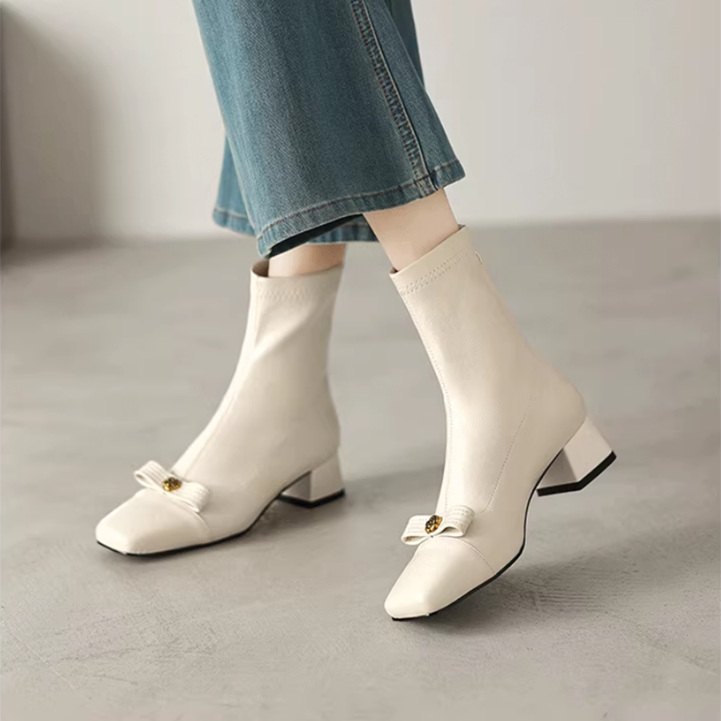 白色方頭彈力瘦瘦靴短靴秋冬新款粗跟法式小香風山茶花蝴蝶結女靴