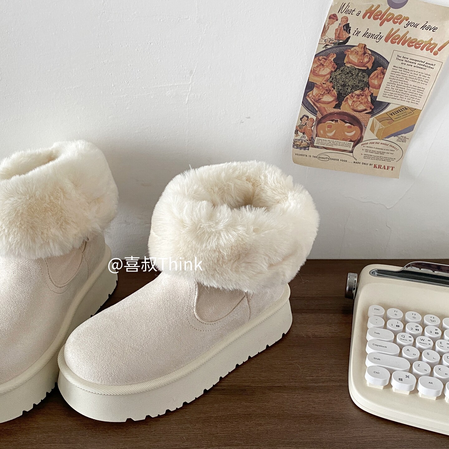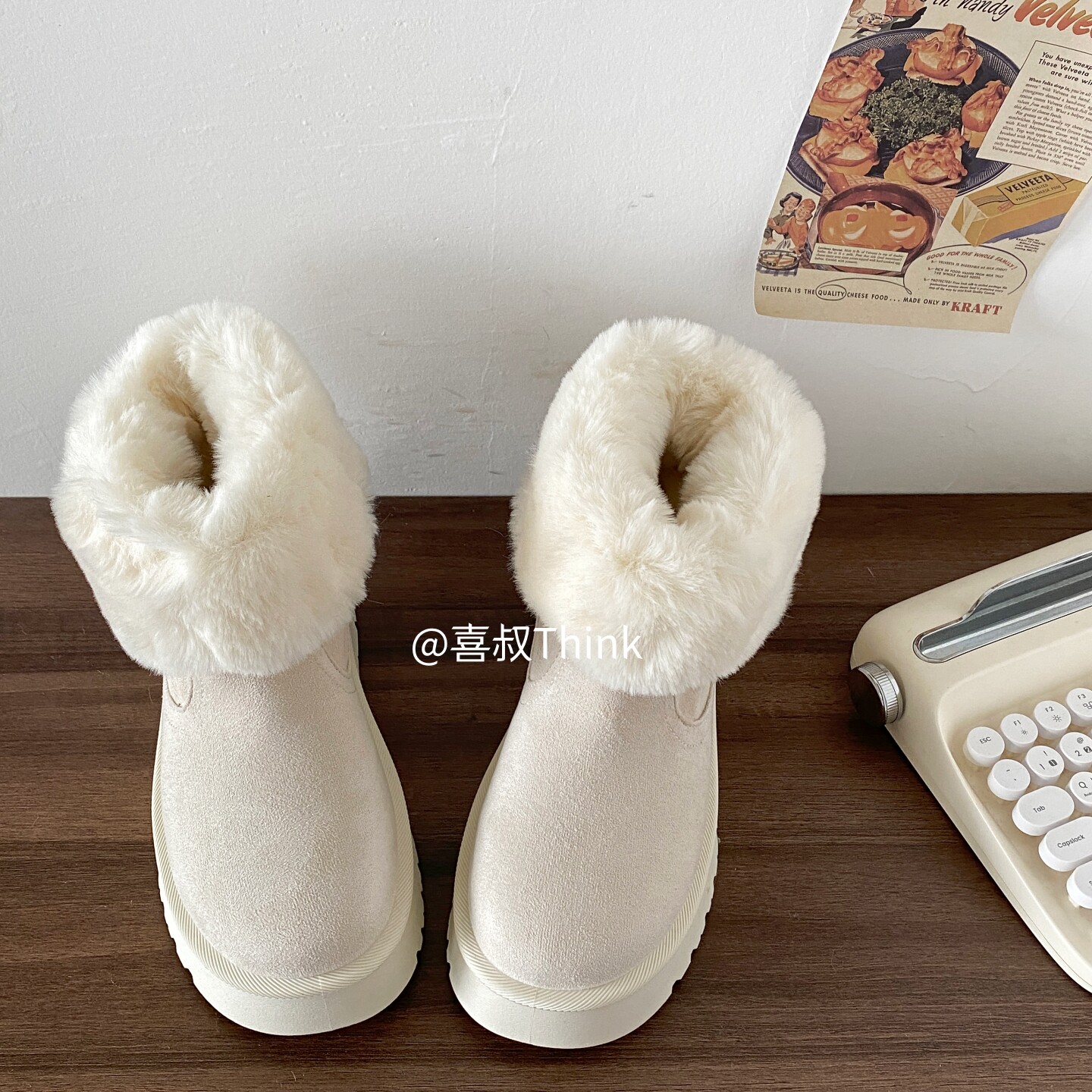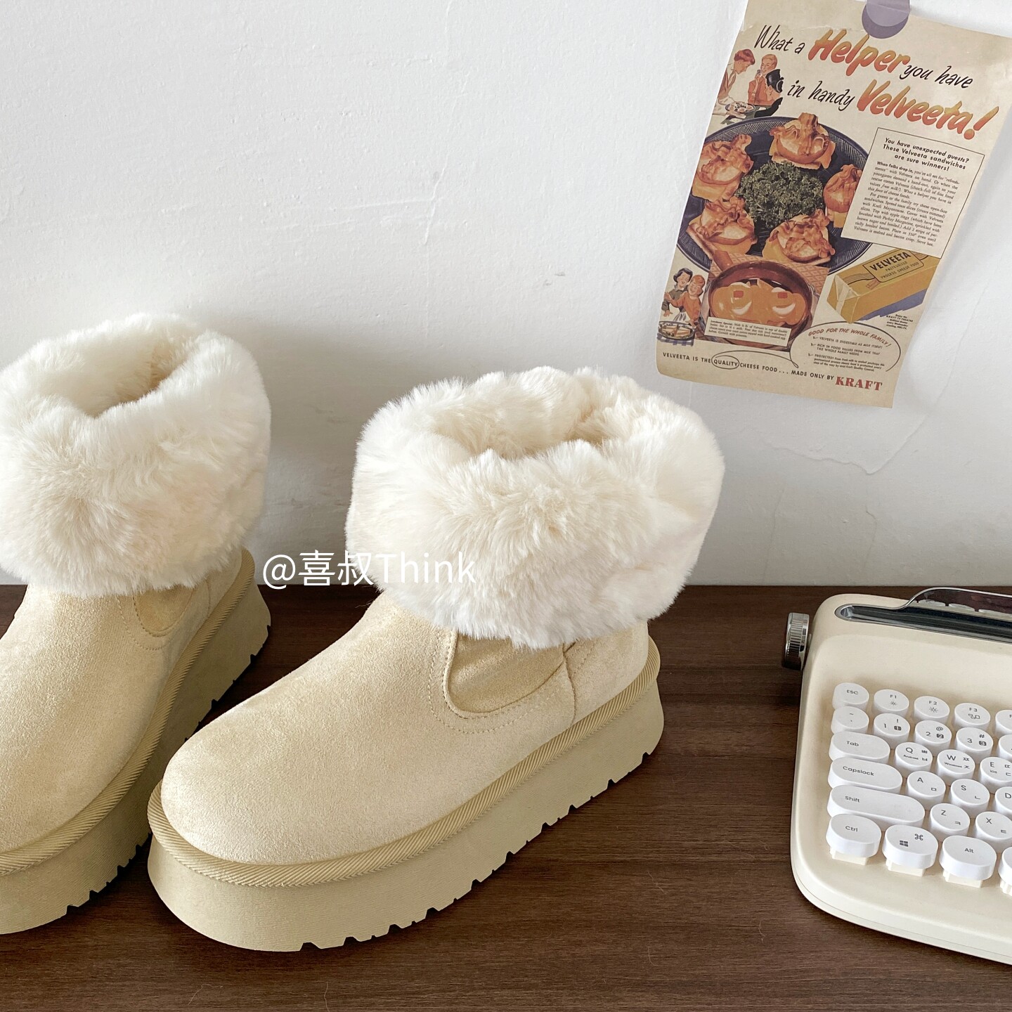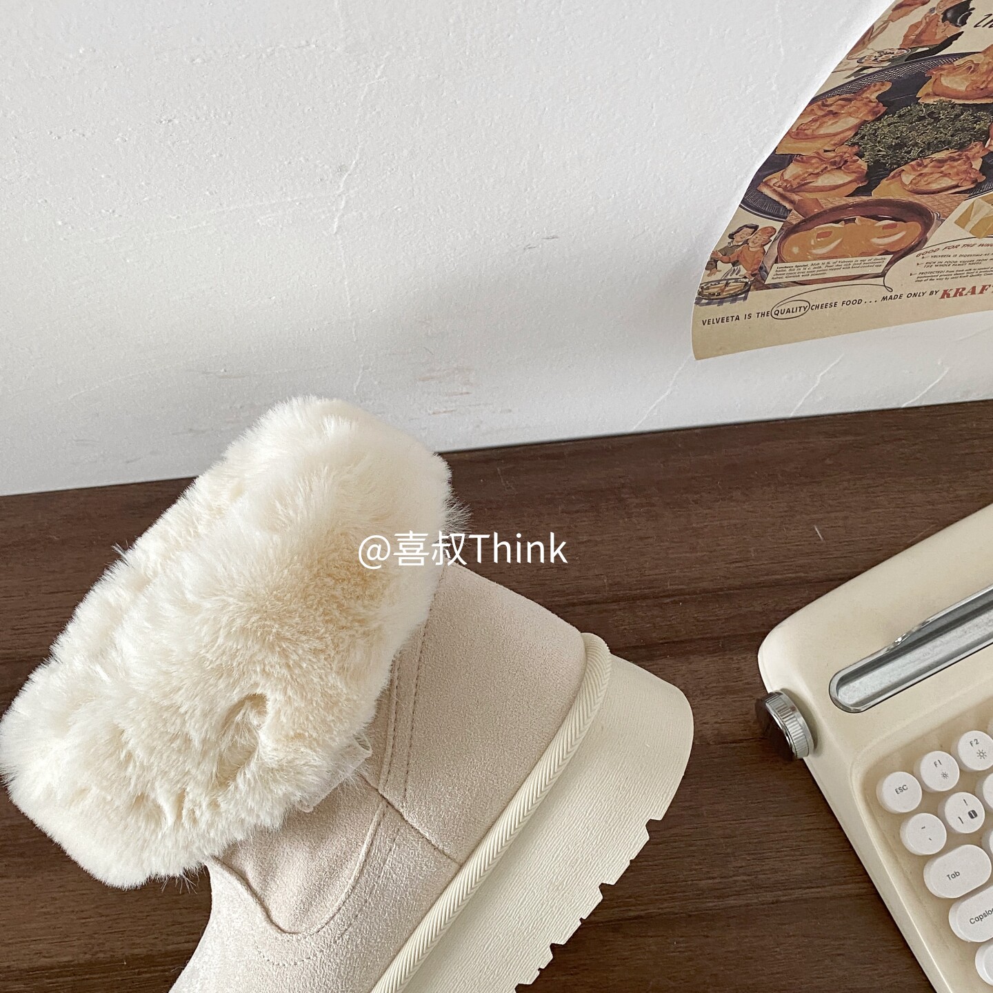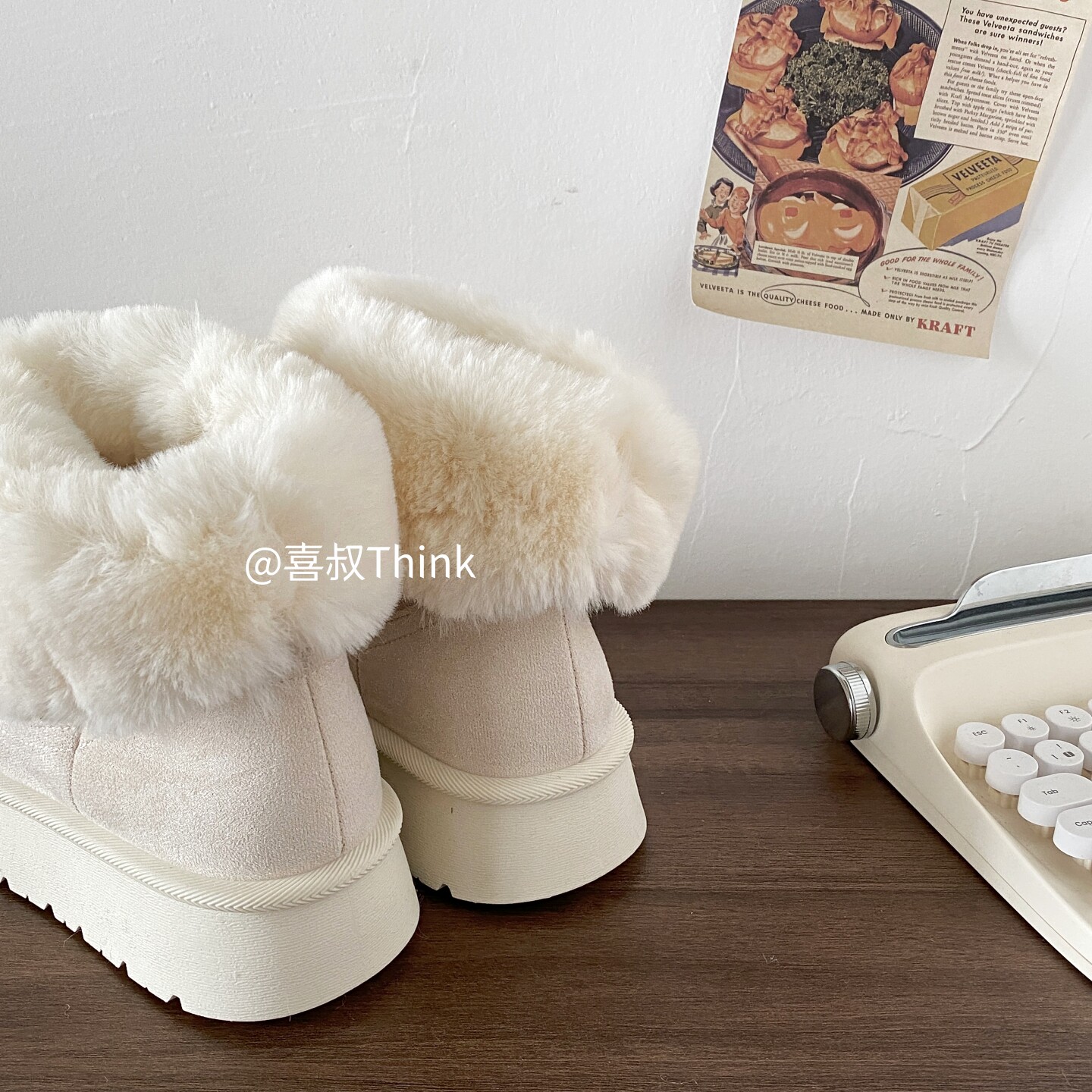 喜叔奶白色兩穿厚底毛絨雪地靴女冬季加絨保暖短筒棉靴東北大棉鞋
