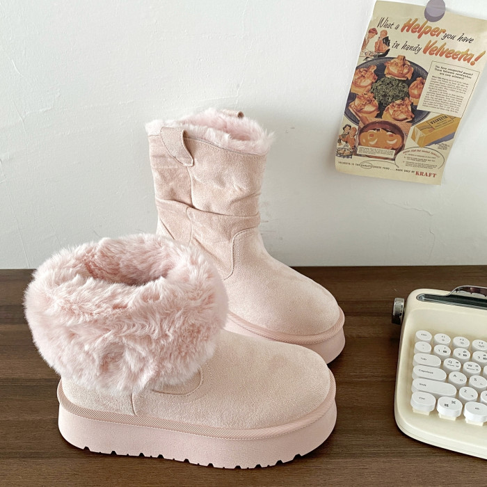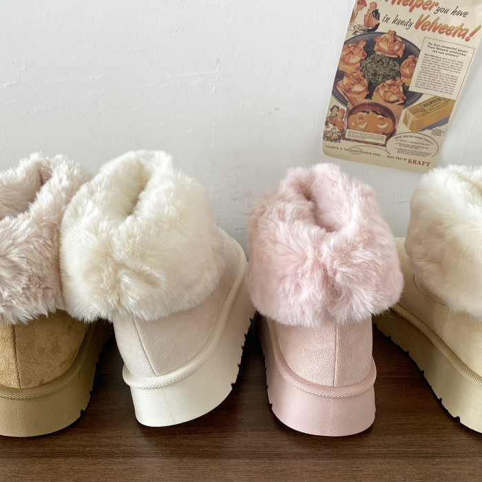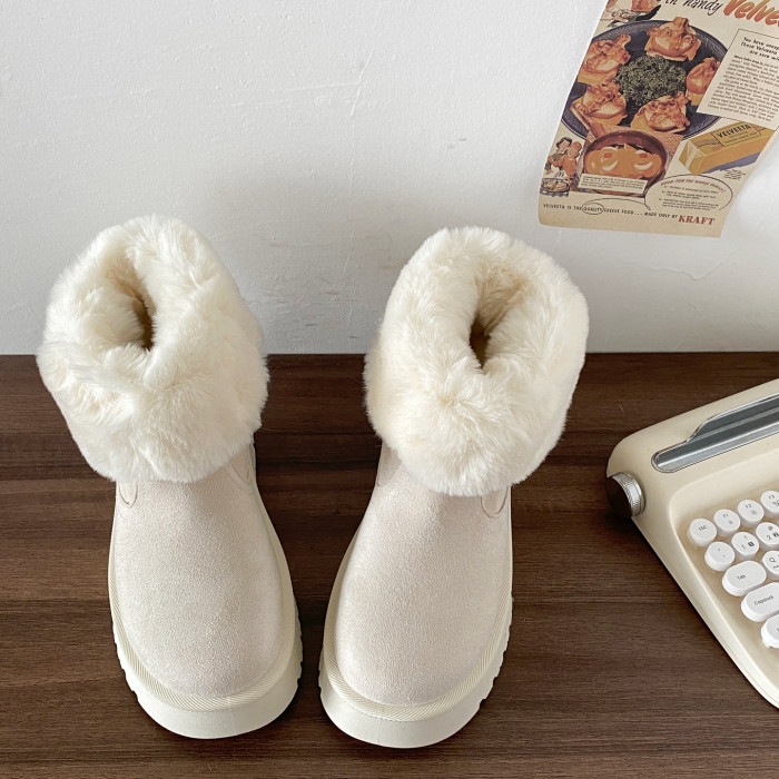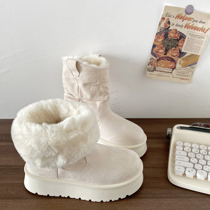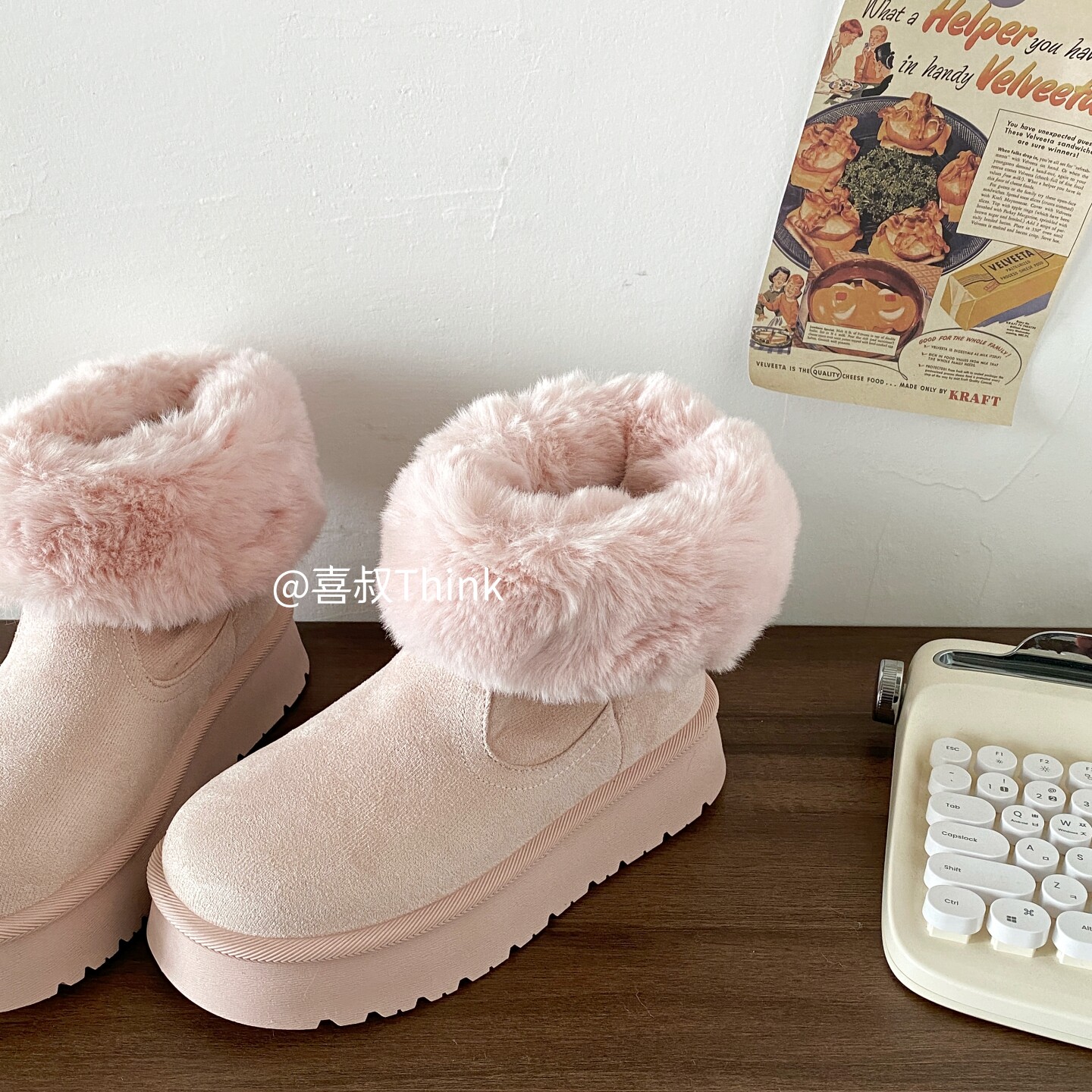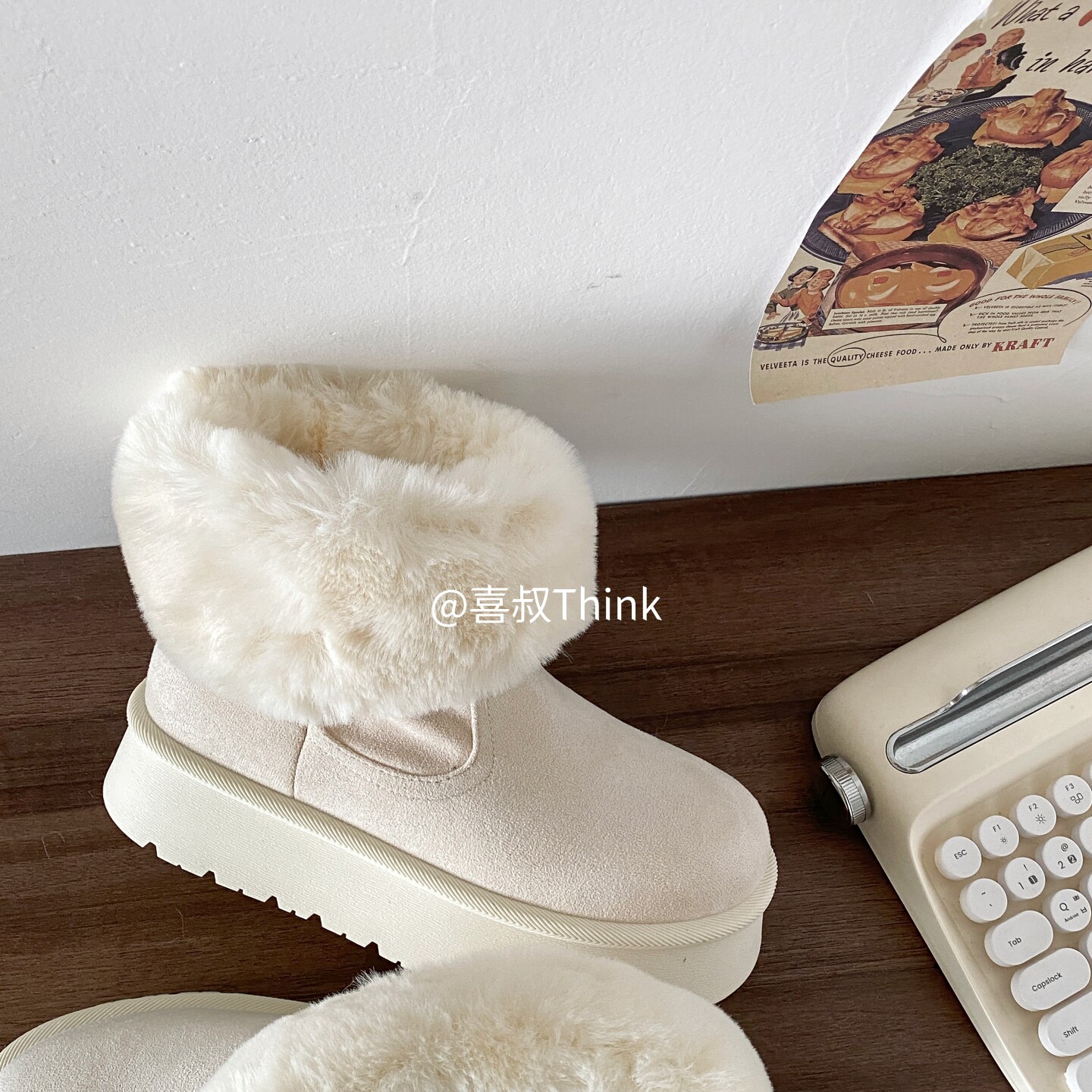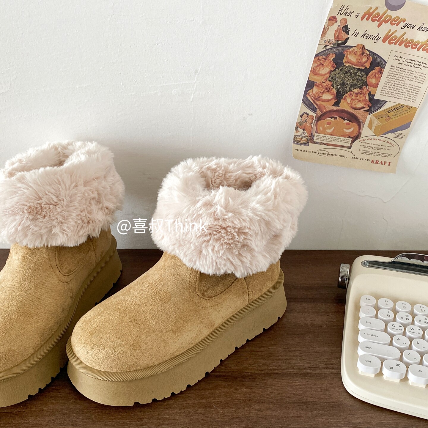 喜叔奶白色兩穿厚底毛絨雪地靴女冬季加絨保暖短筒棉靴東北大棉鞋