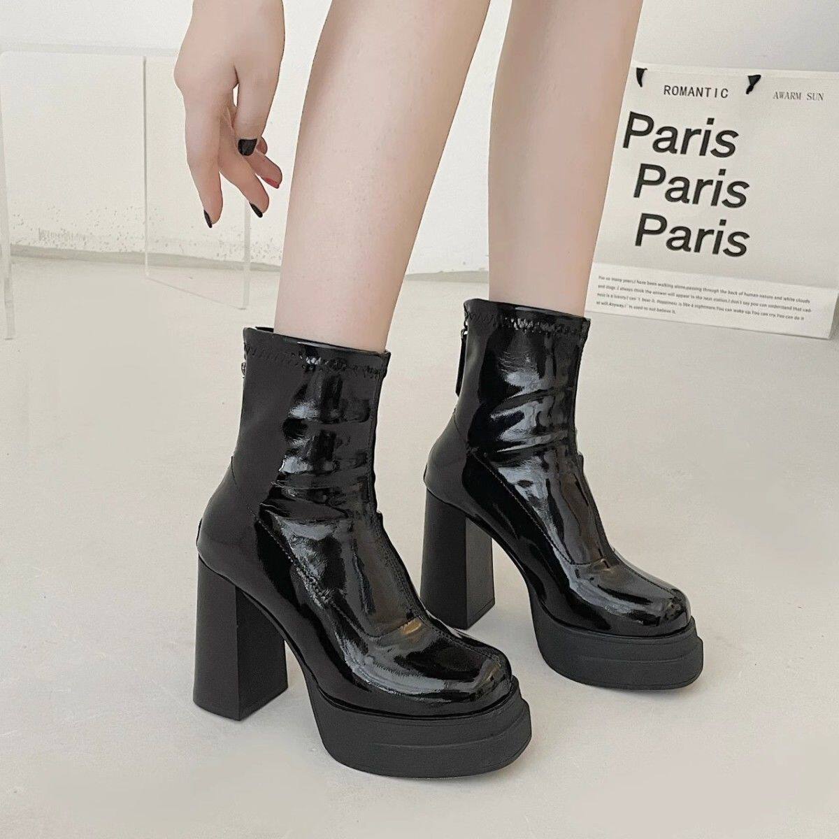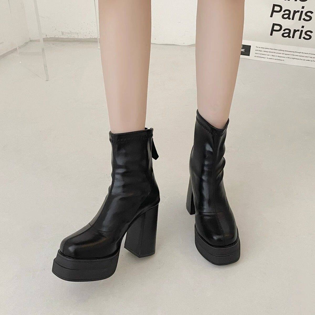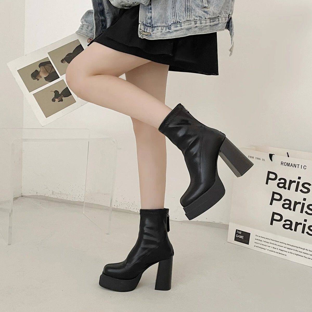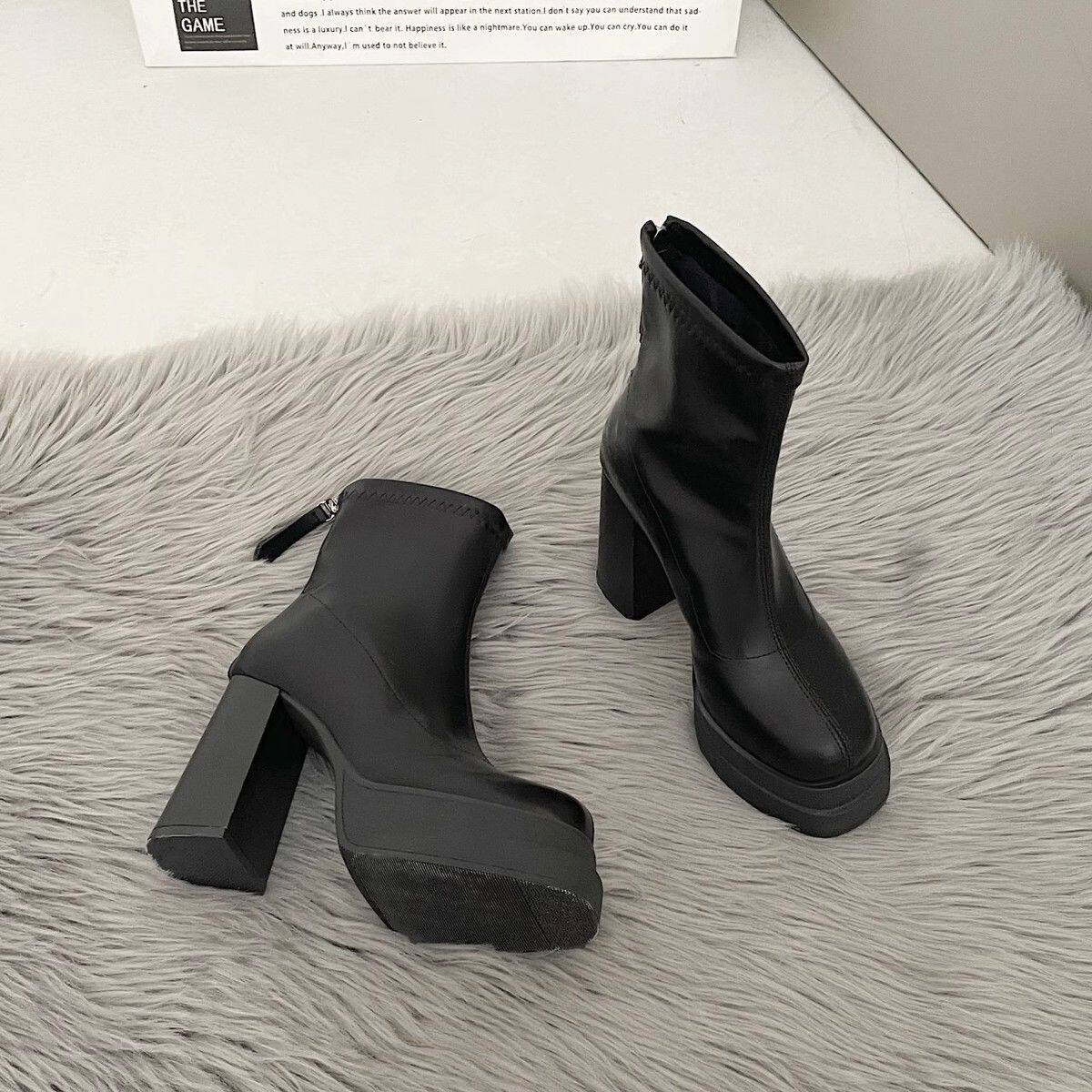 英倫風超高跟瘦瘦靴韓版時尚粗跟防滑後拉鍊短靴2024年秋冬季新款