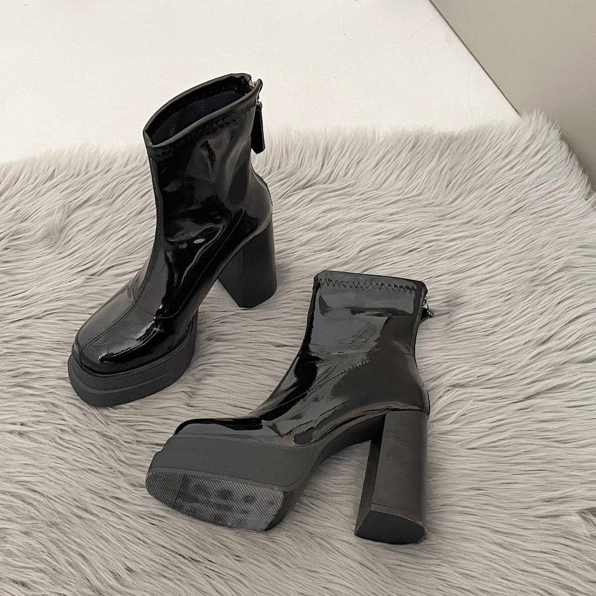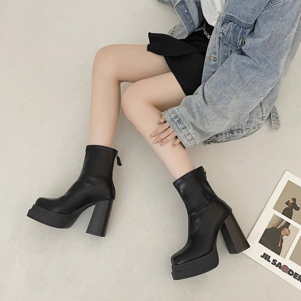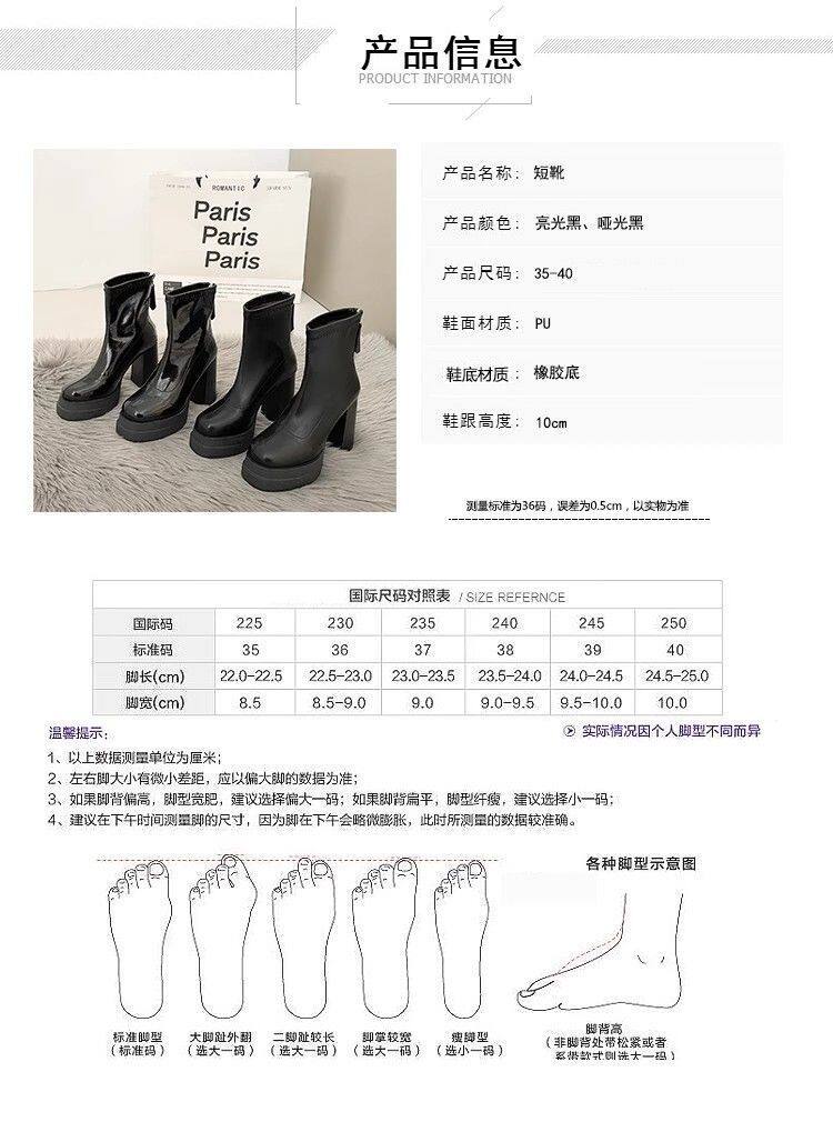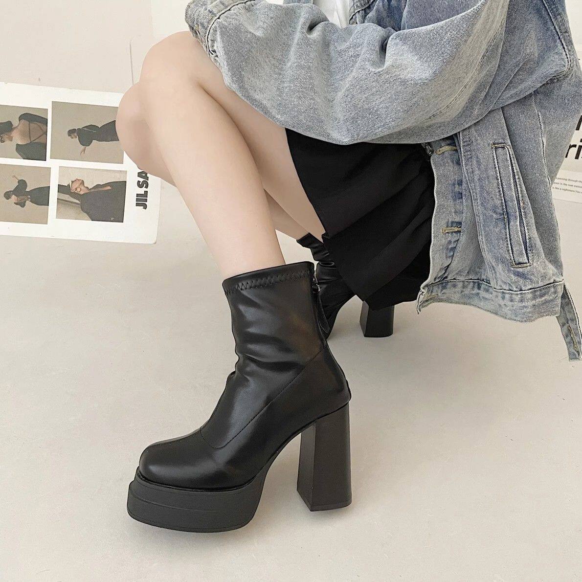 英倫風超高跟瘦瘦靴韓版時尚粗跟防滑後拉鍊短靴2024年秋冬季新款