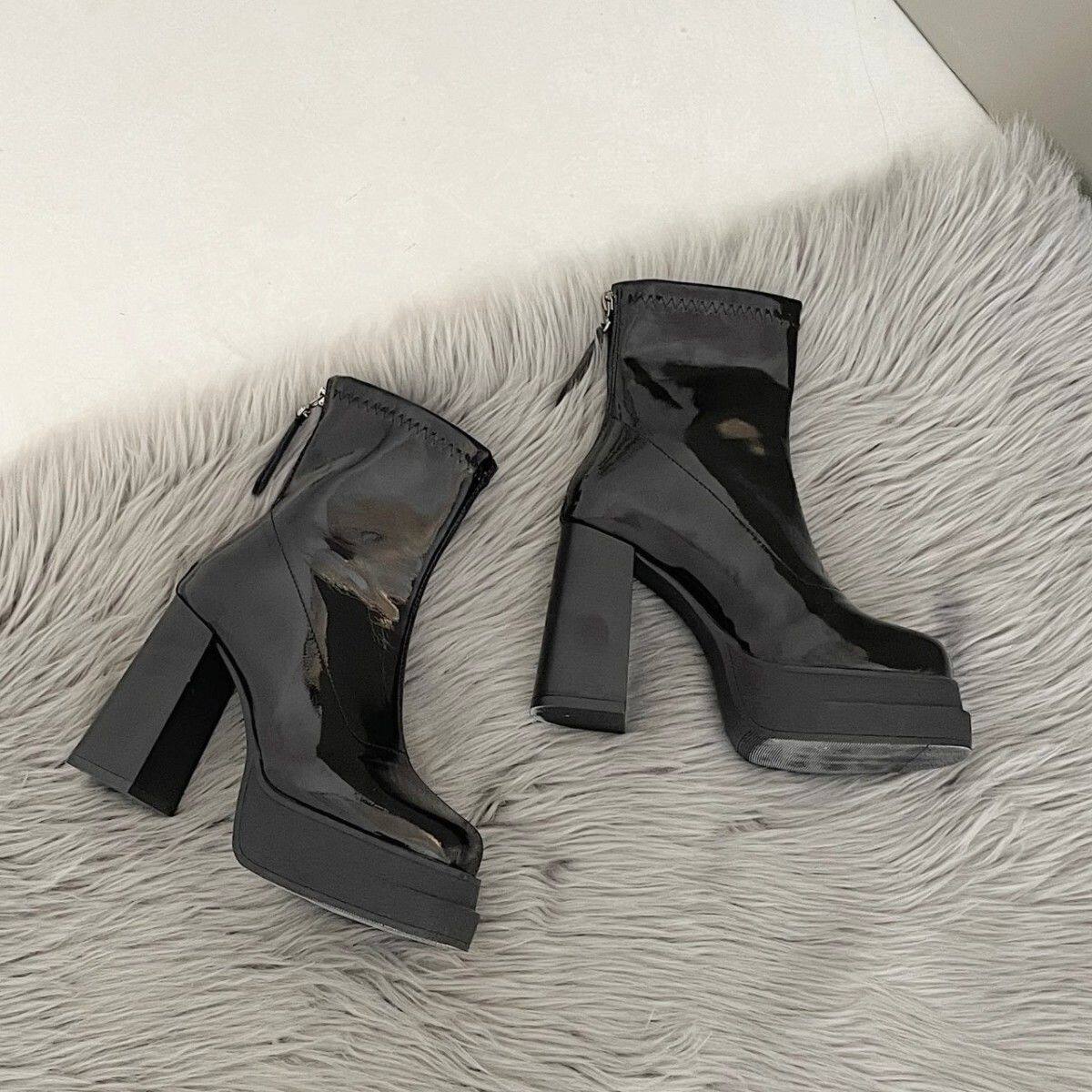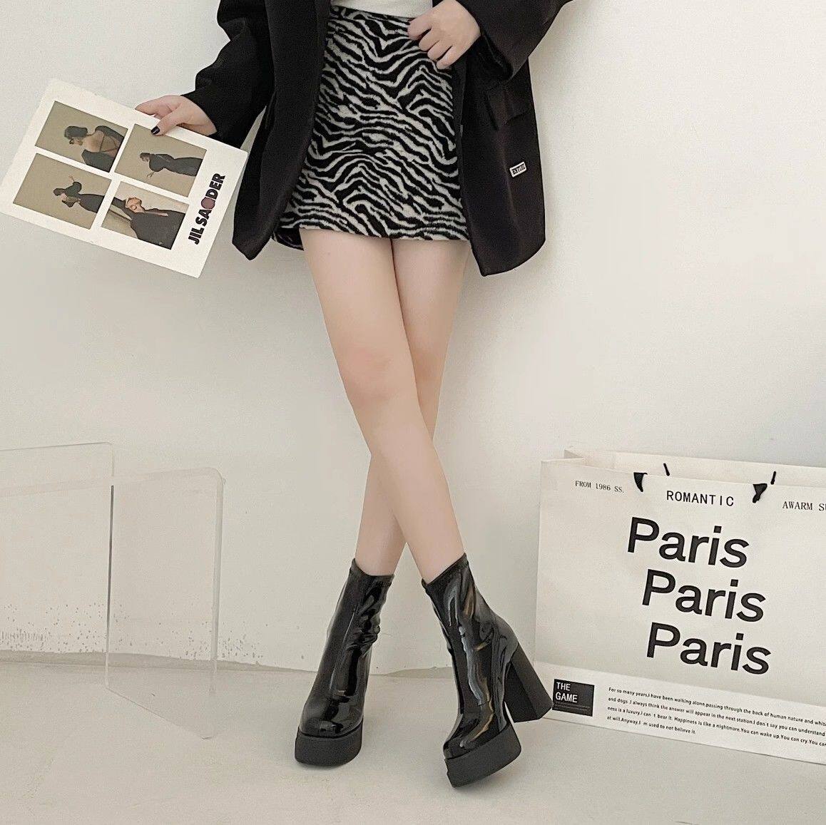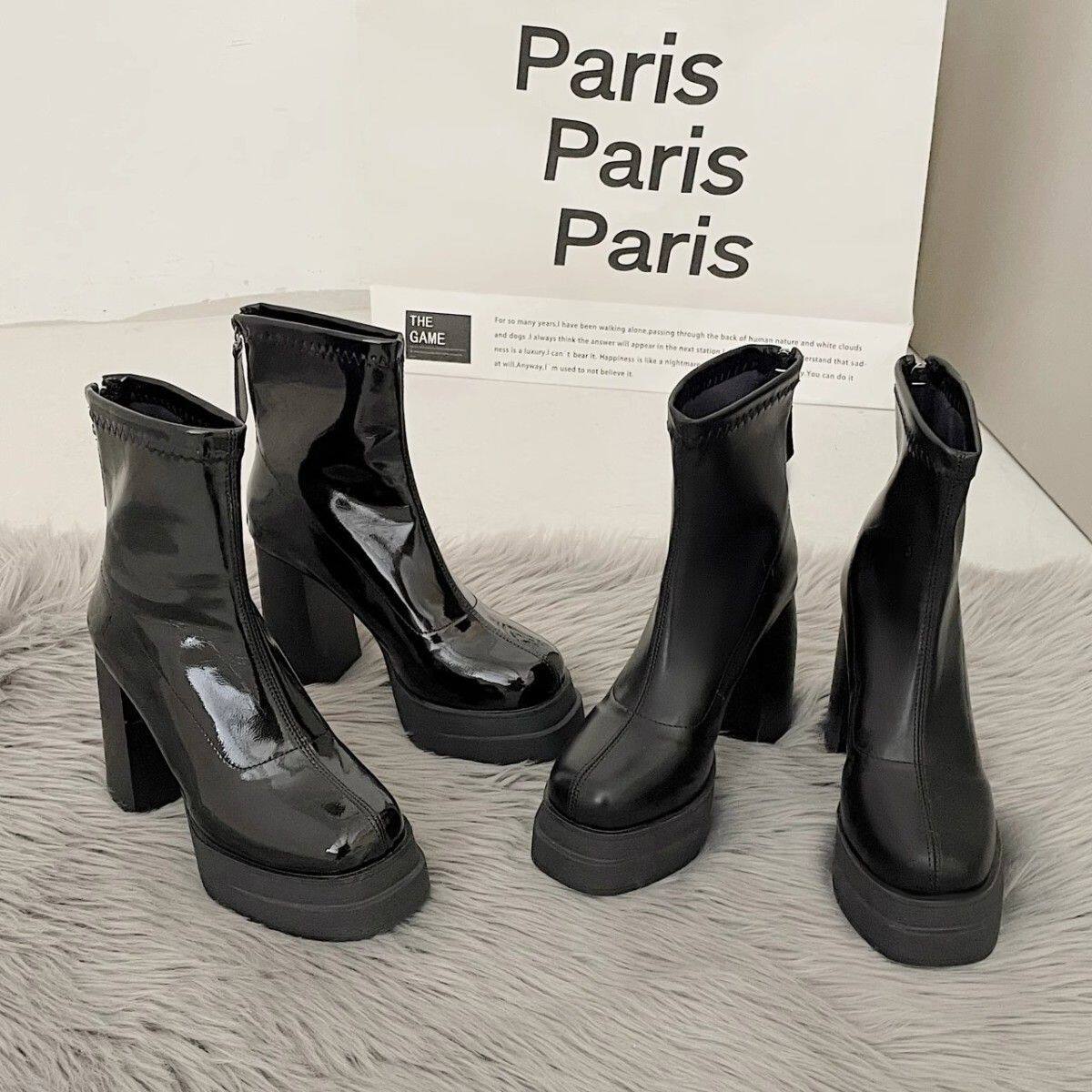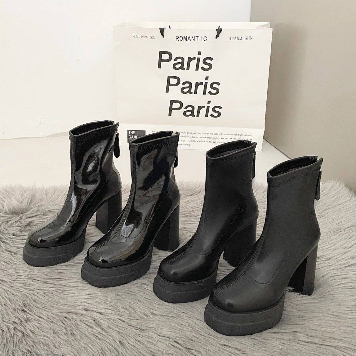 英倫風超高跟瘦瘦靴韓版時尚粗跟防滑後拉鍊短靴2024年秋冬季新款