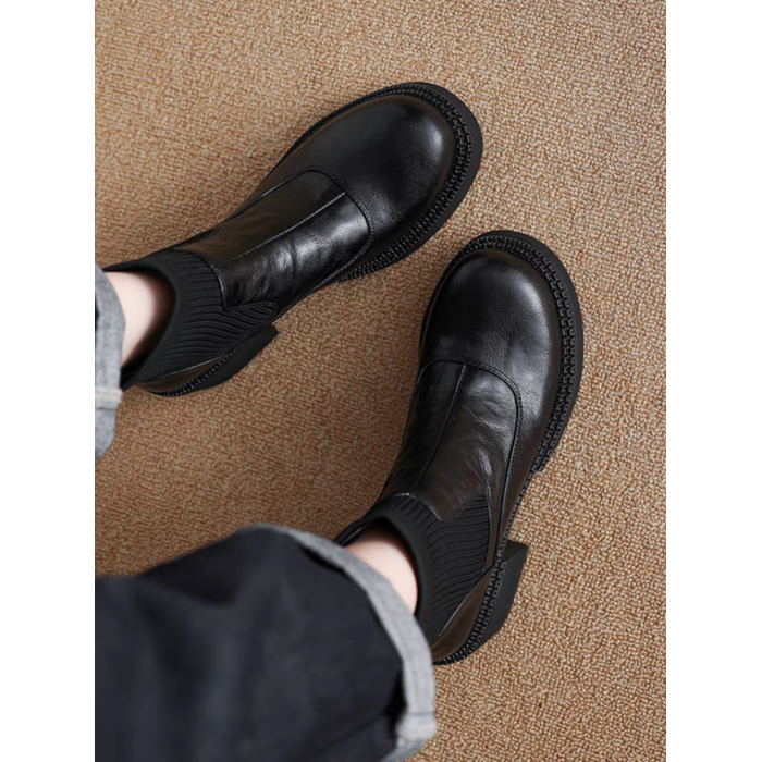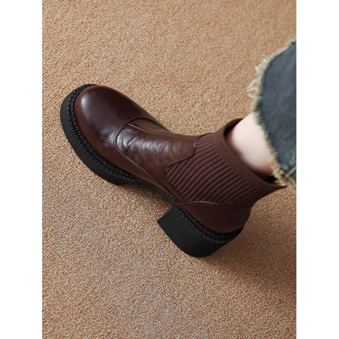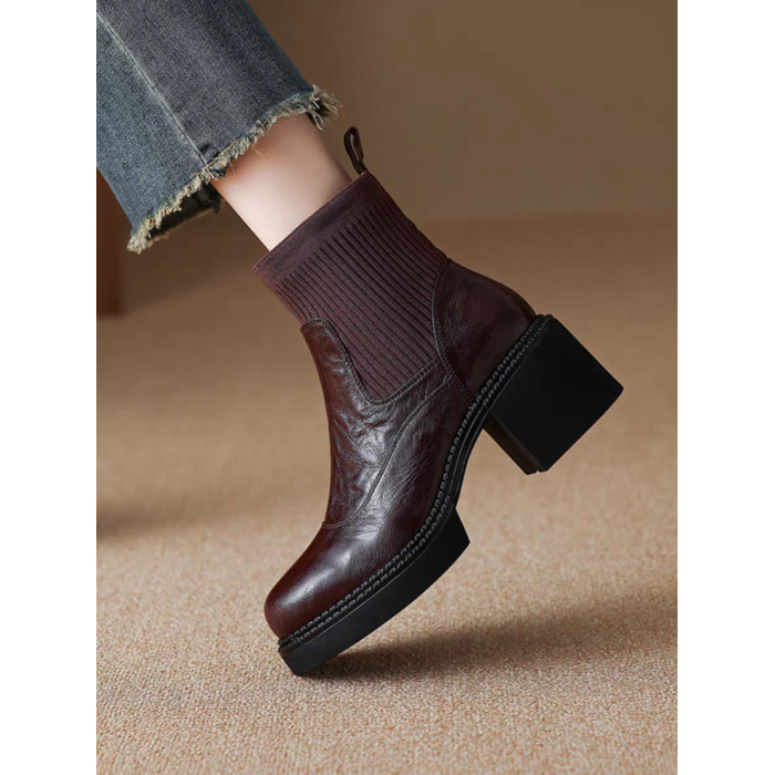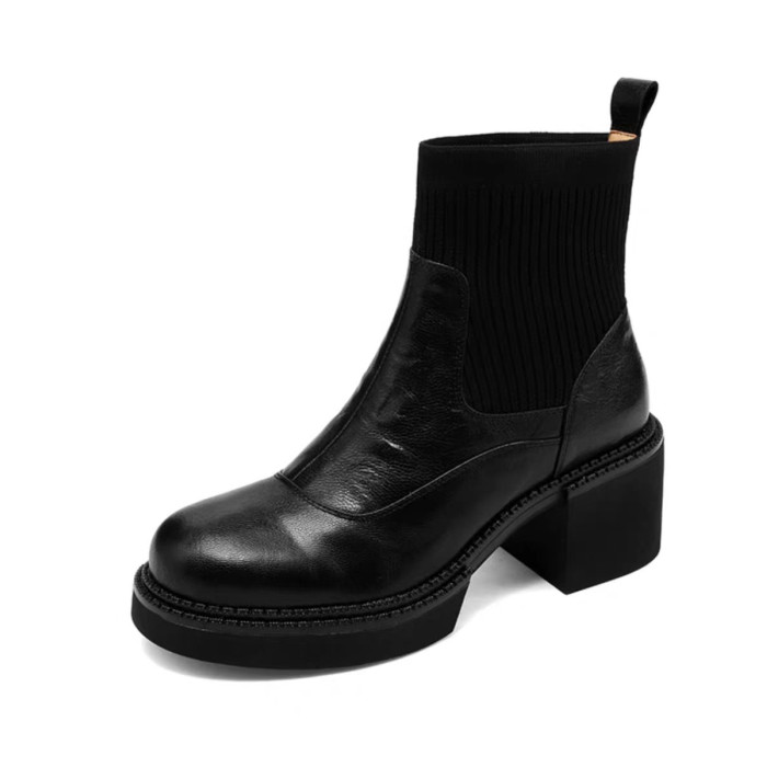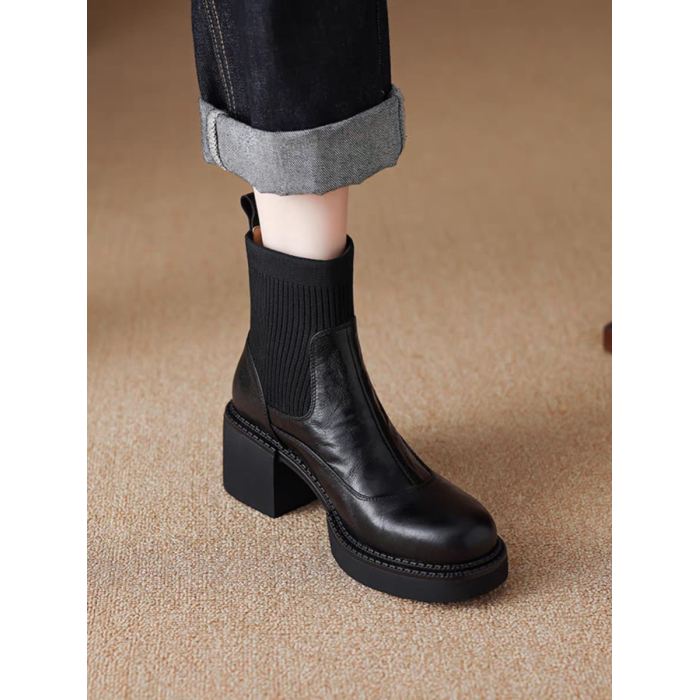 小羊皮復古粗跟高跟短靴女2024秋冬新款厚底圓頭拼接針織彈力襪靴