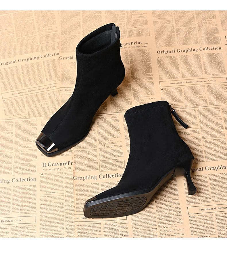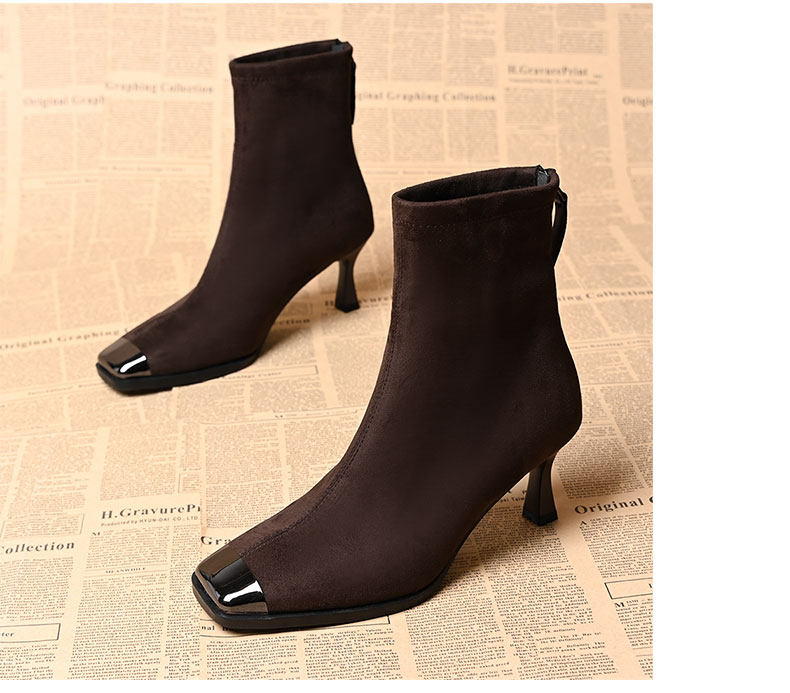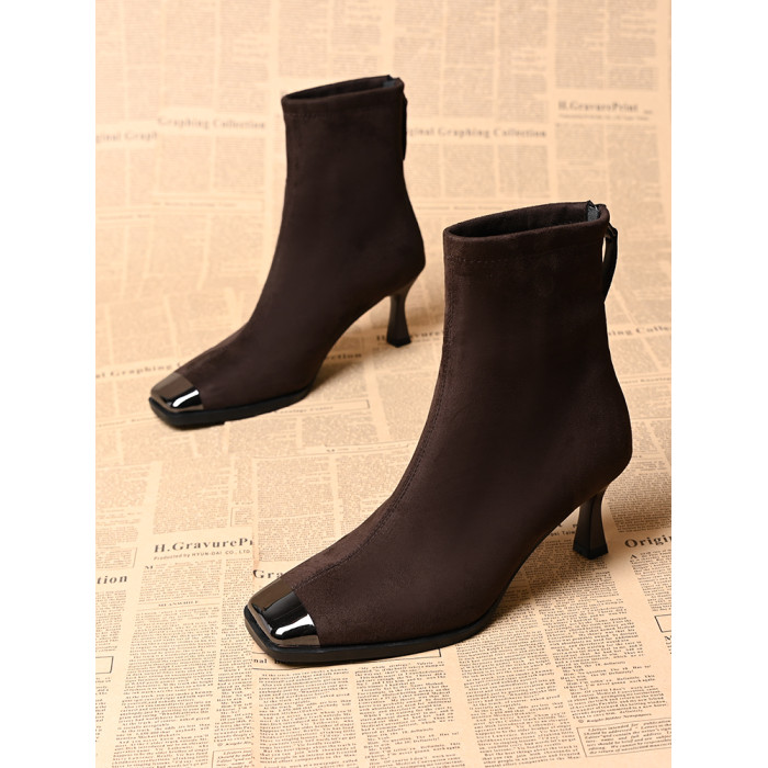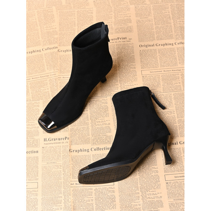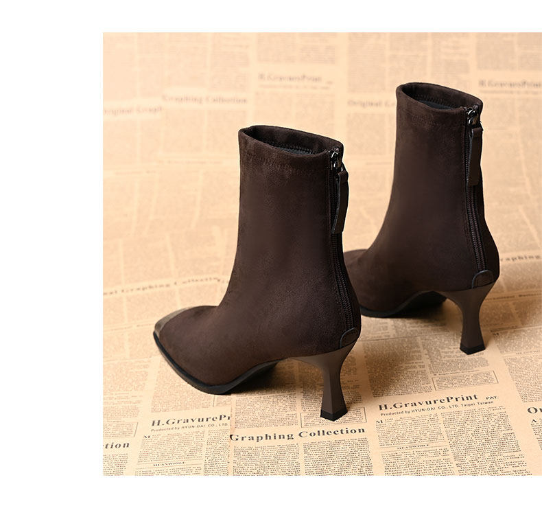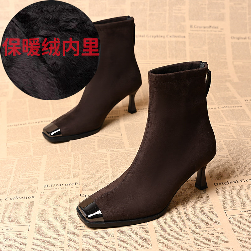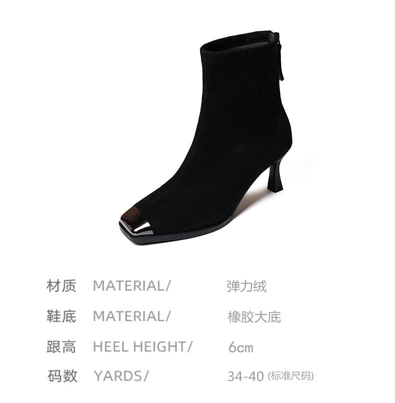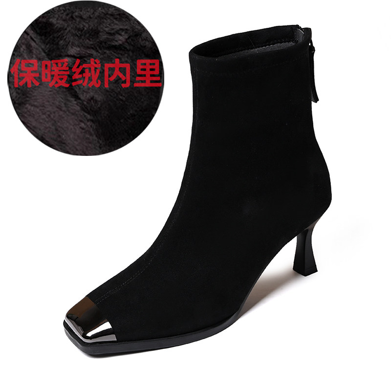 品牌真皮方頭短靴女新款高跟絨面後拉鍊氣質馬丁靴秋冬百搭彈力靴