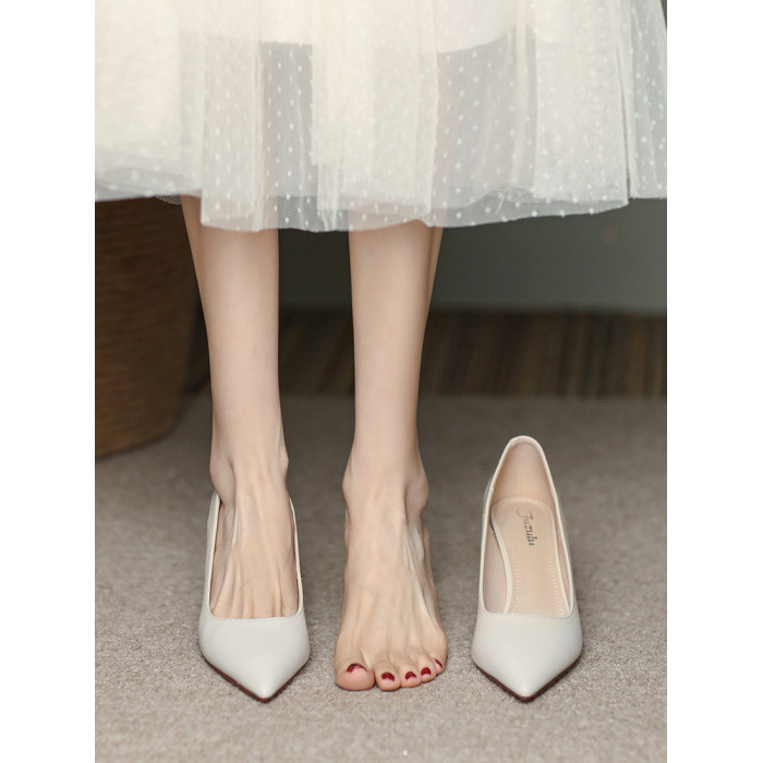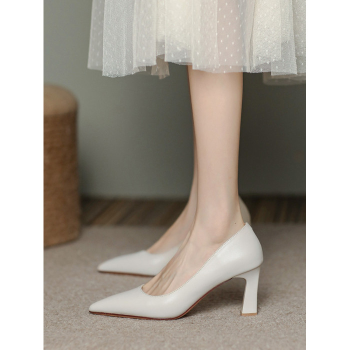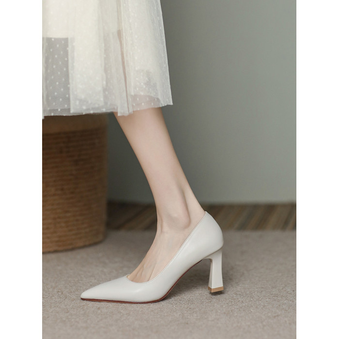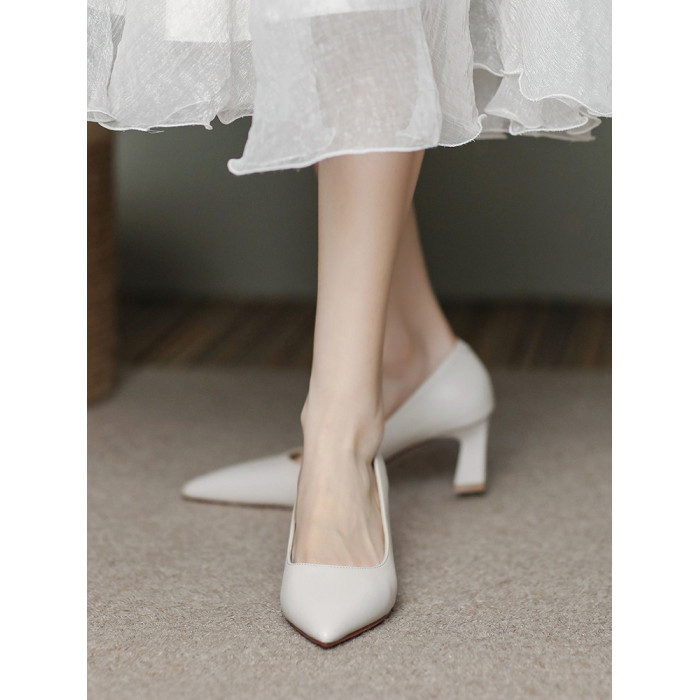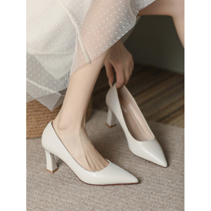 羊皮米白色尖頭高跟鞋女粗跟5公分2025年新款不累腳7公分面試單鞋