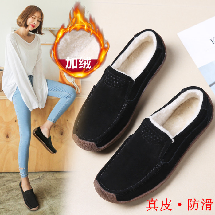 2024春季加絨平底鞋女士豆豆鞋真皮休閒單鞋孕婦媽媽防滑棉鞋大碼
