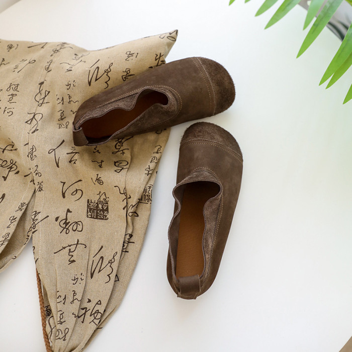 琢皮師 牛皮圓頭套腳森女日系低跟平底女鞋復古軟底懶人鞋高幫鞋