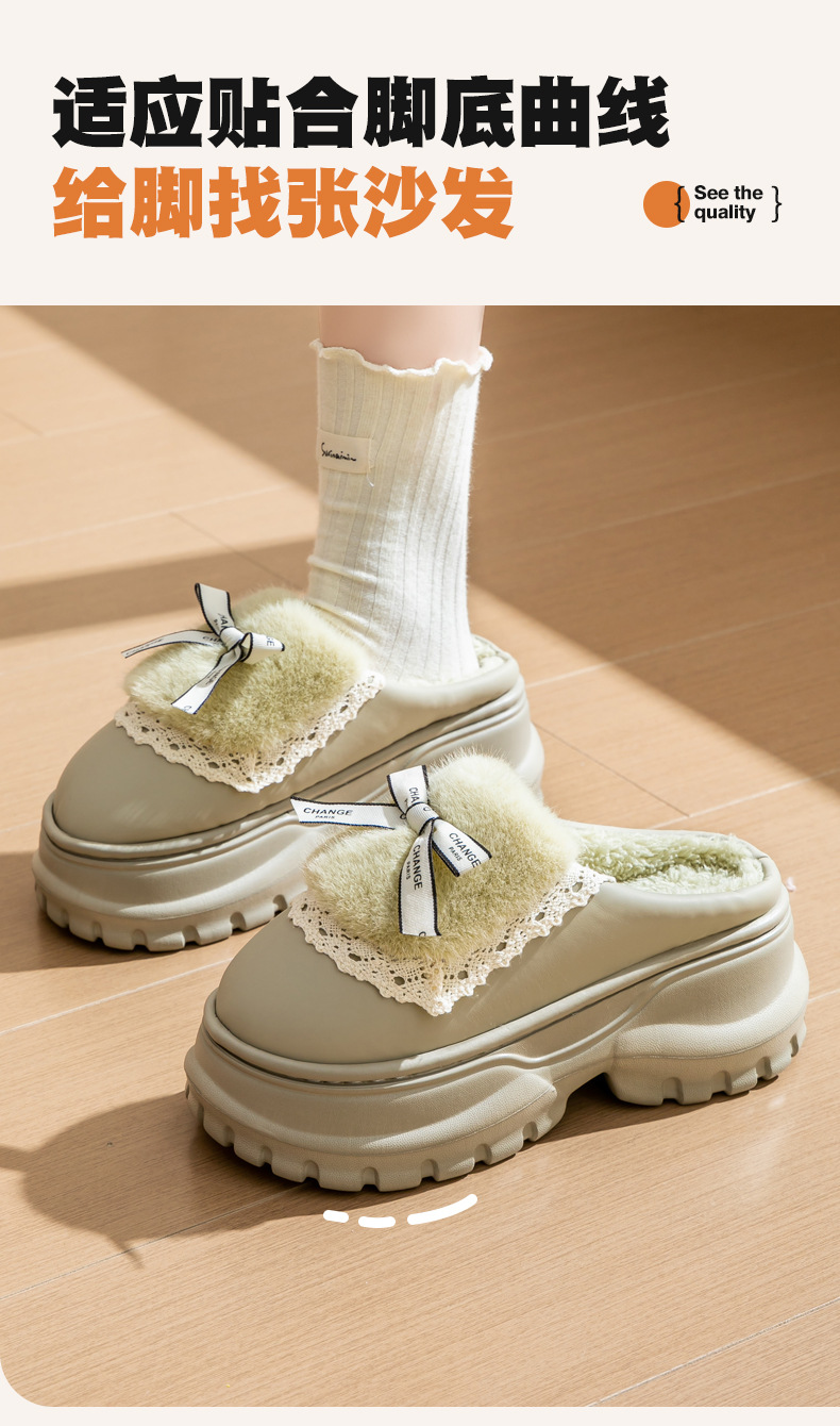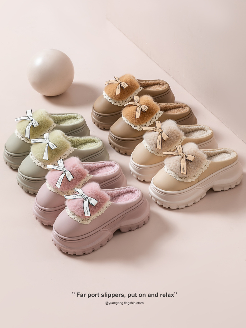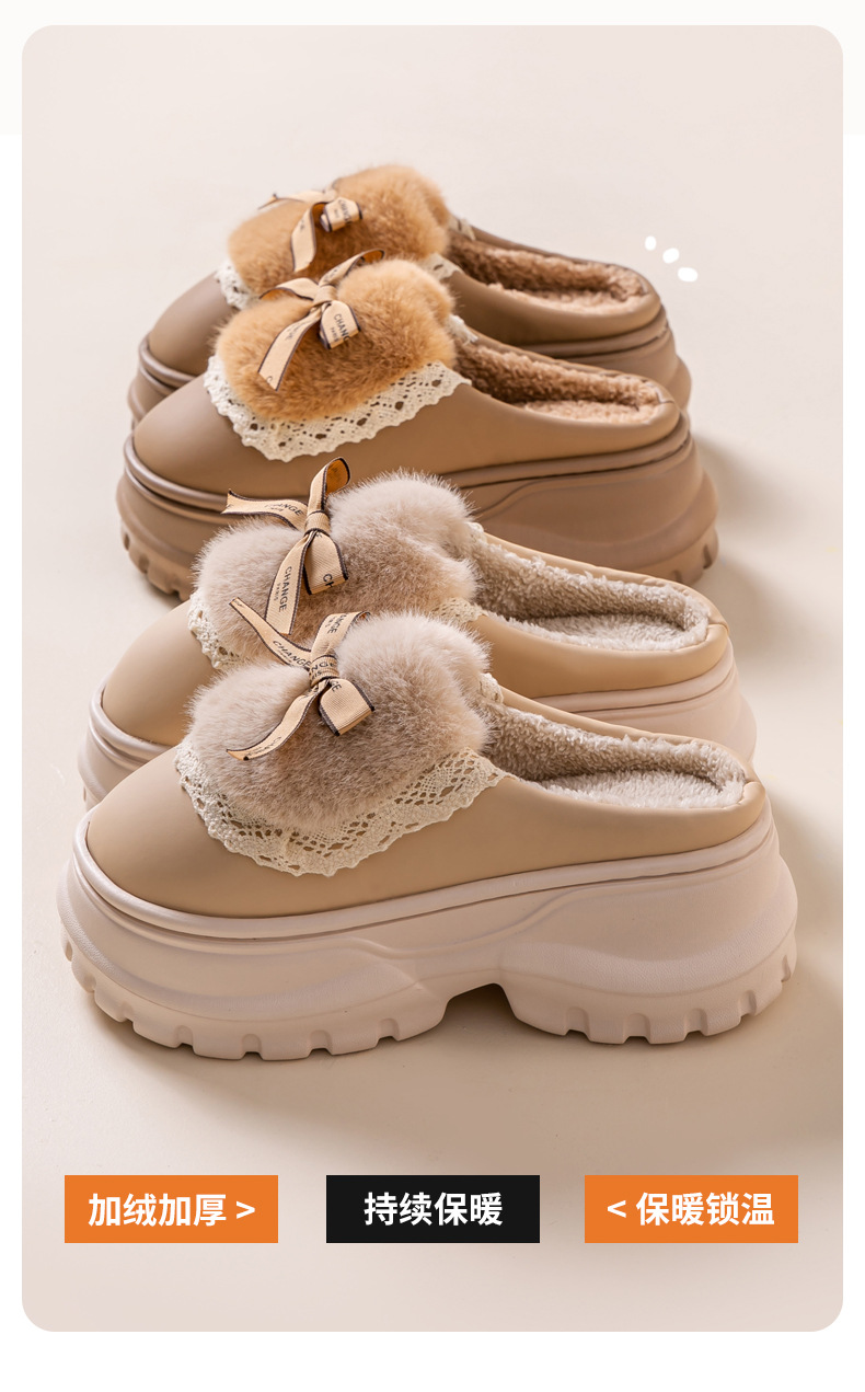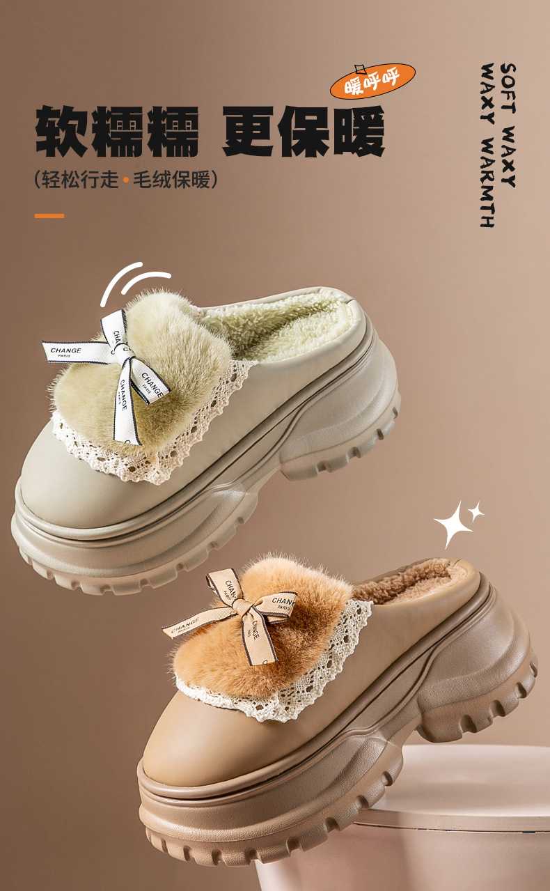 毛絨蝴蝶結棉拖鞋女士冬季包跟外穿室內家居可愛厚底款月子棉鞋女