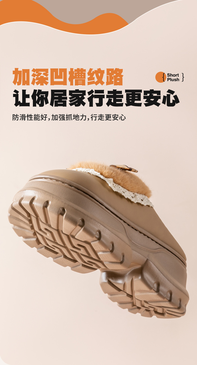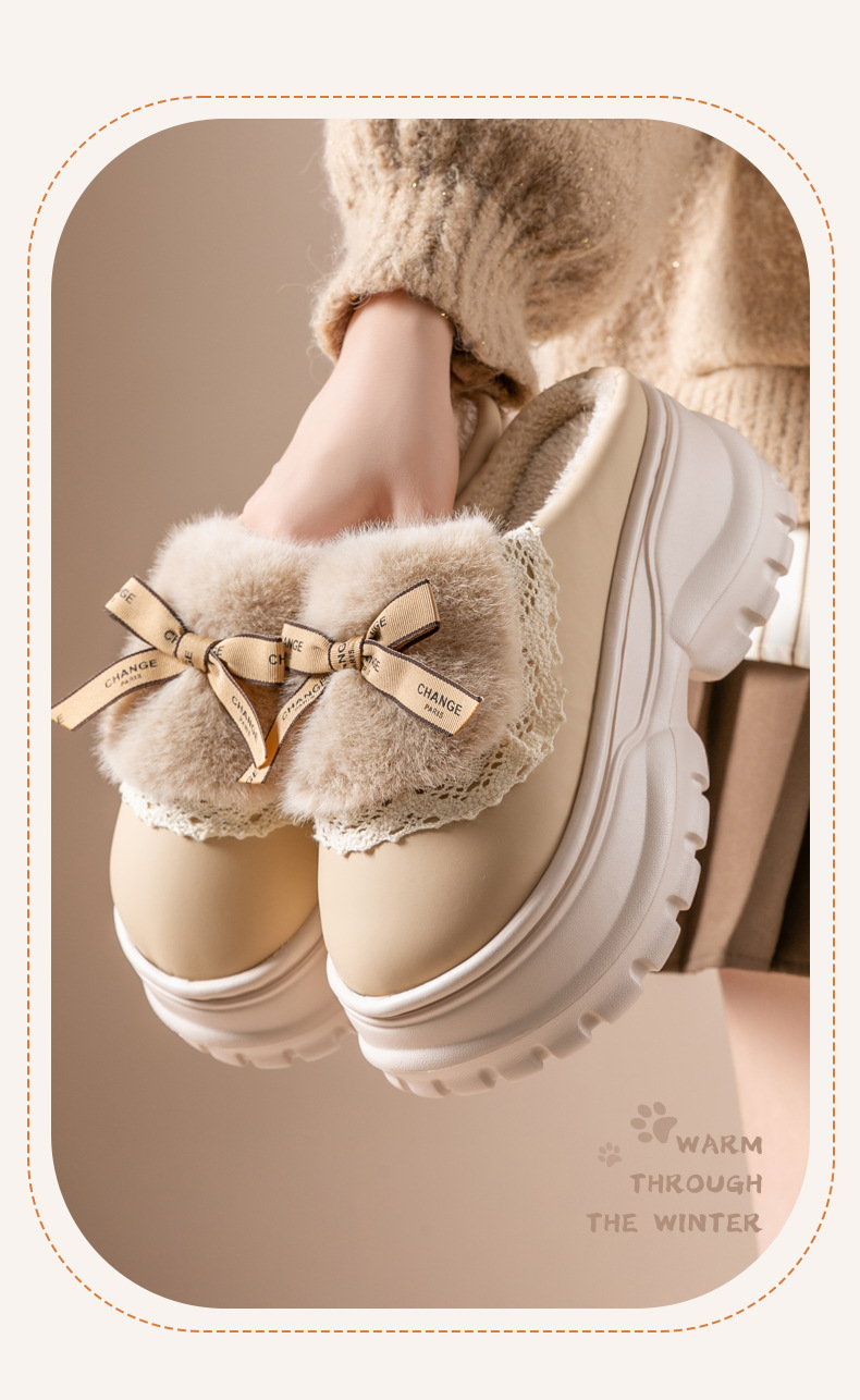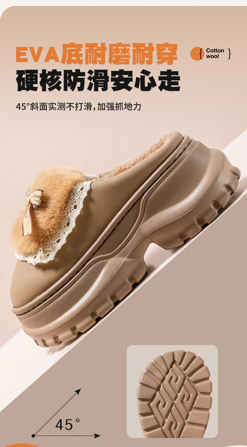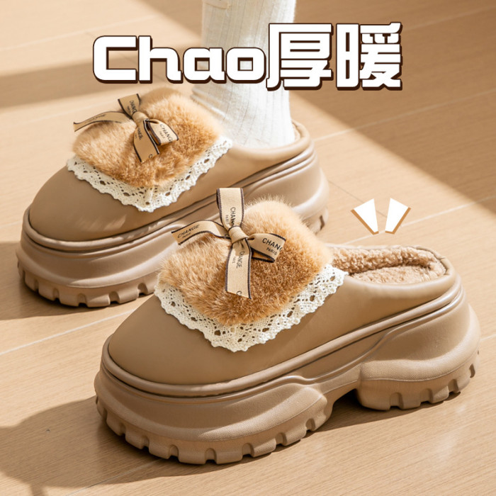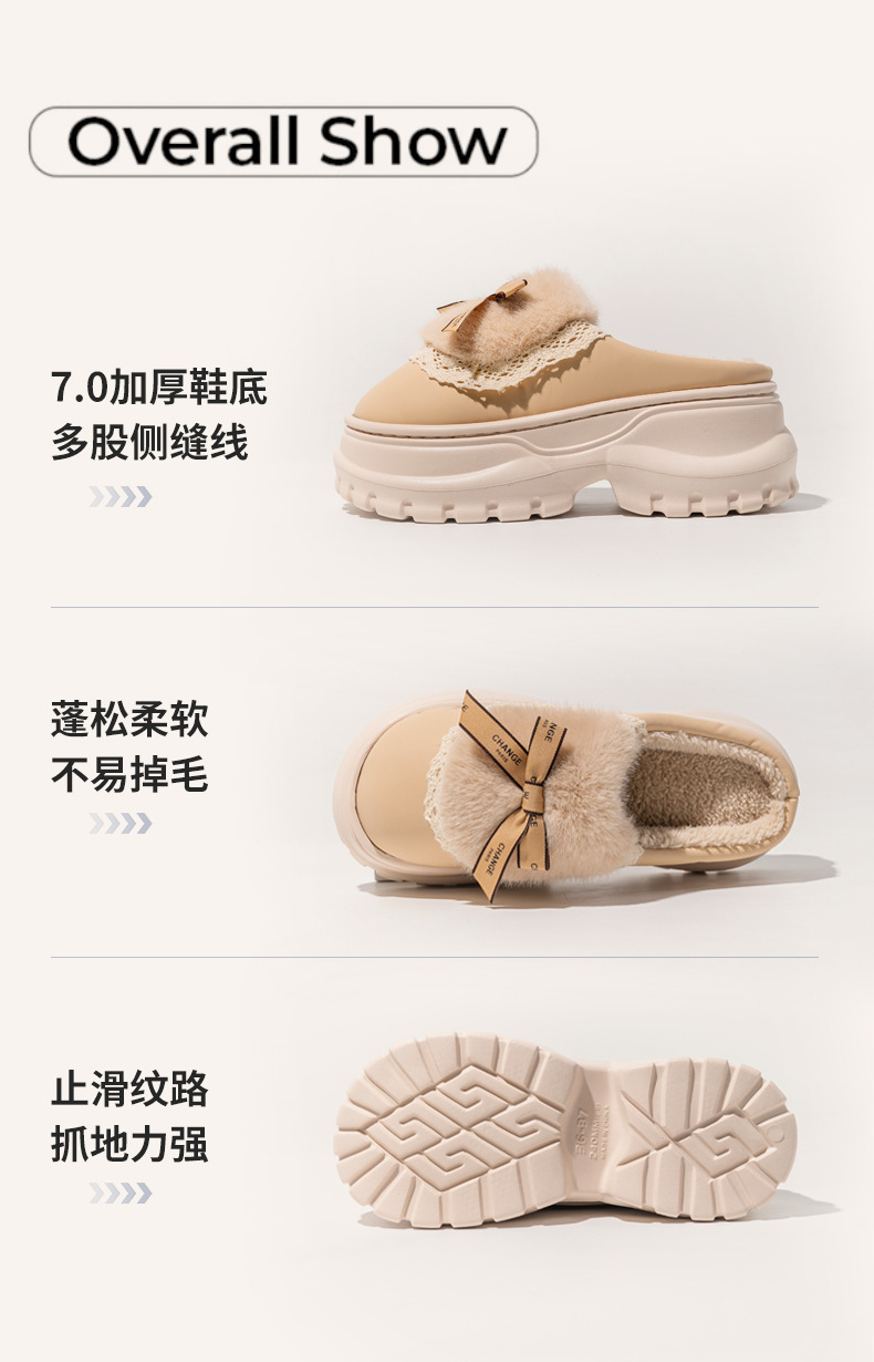 毛絨蝴蝶結棉拖鞋女士冬季包跟外穿室內家居可愛厚底款月子棉鞋女