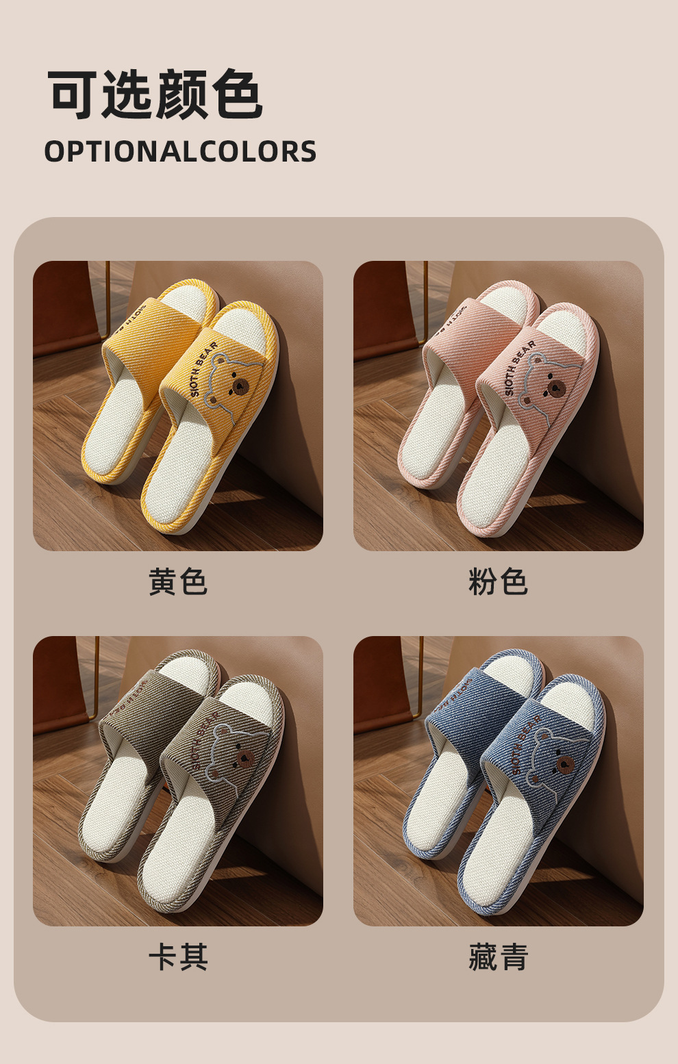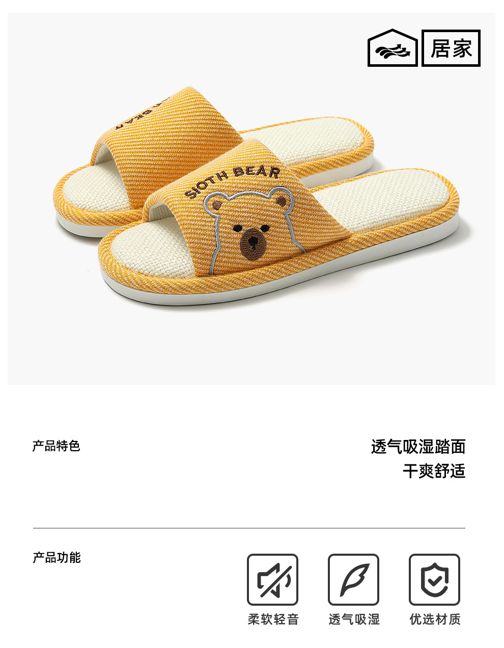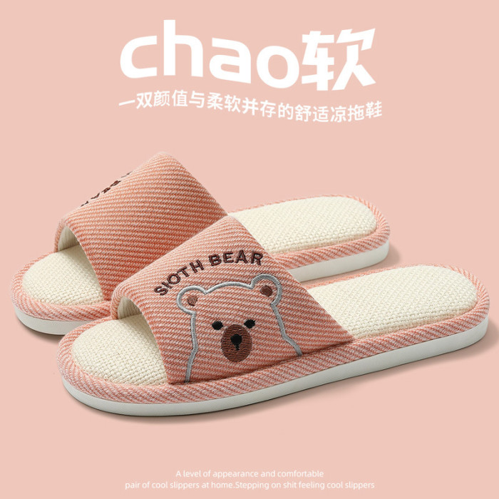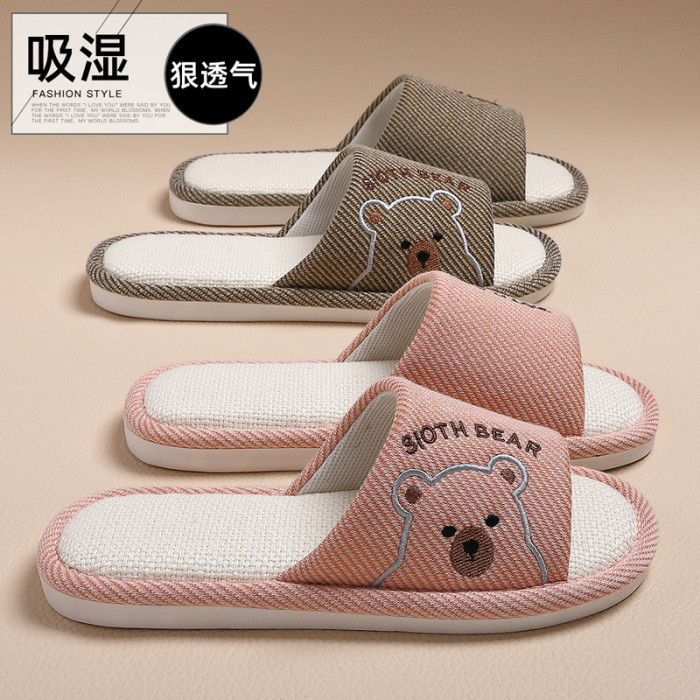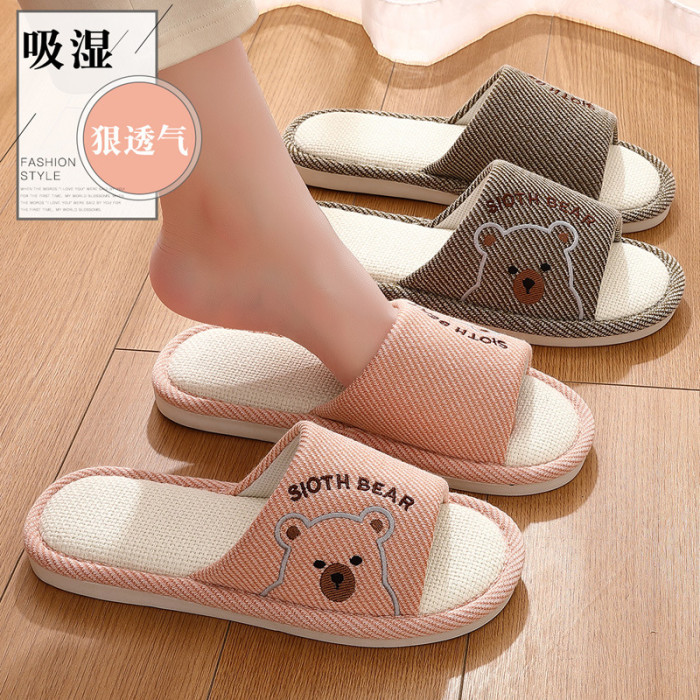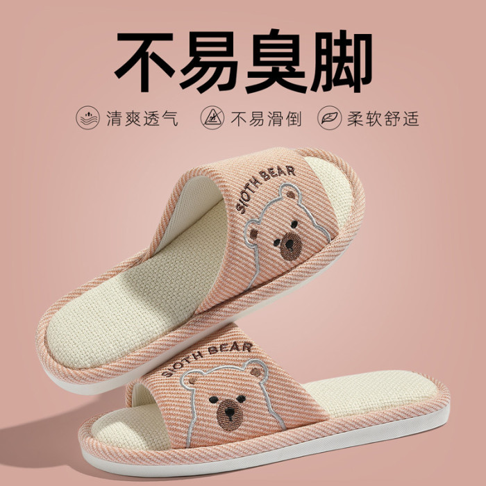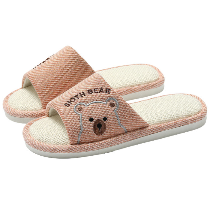 透氣亞麻拖鞋女春秋季卡通小熊家居室內防滑軟底家用地板拖男