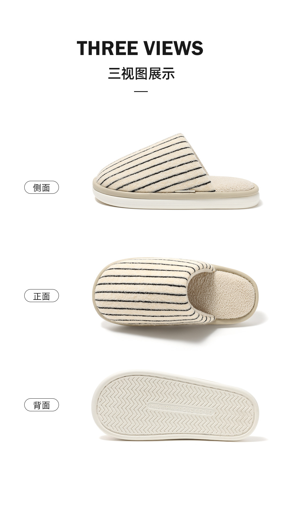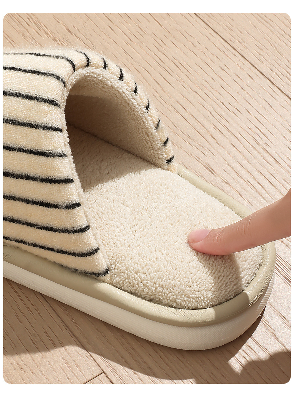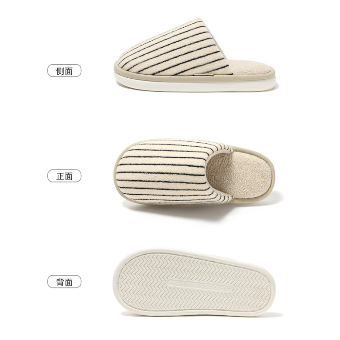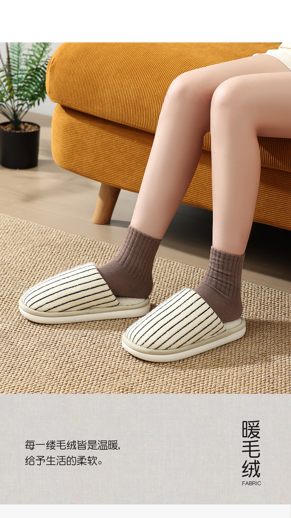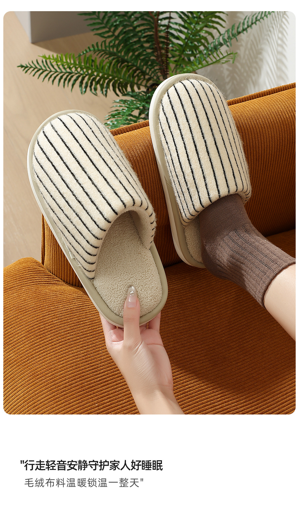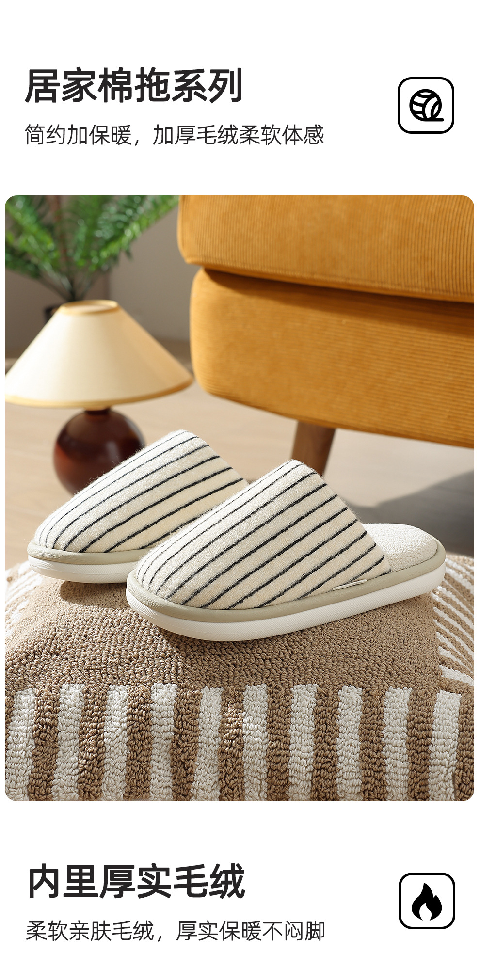 條紋棉拖鞋女秋冬季家居室內毛絨保暖情侶家用軟底防滑棉拖男