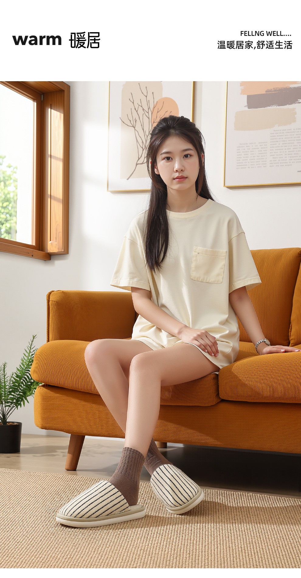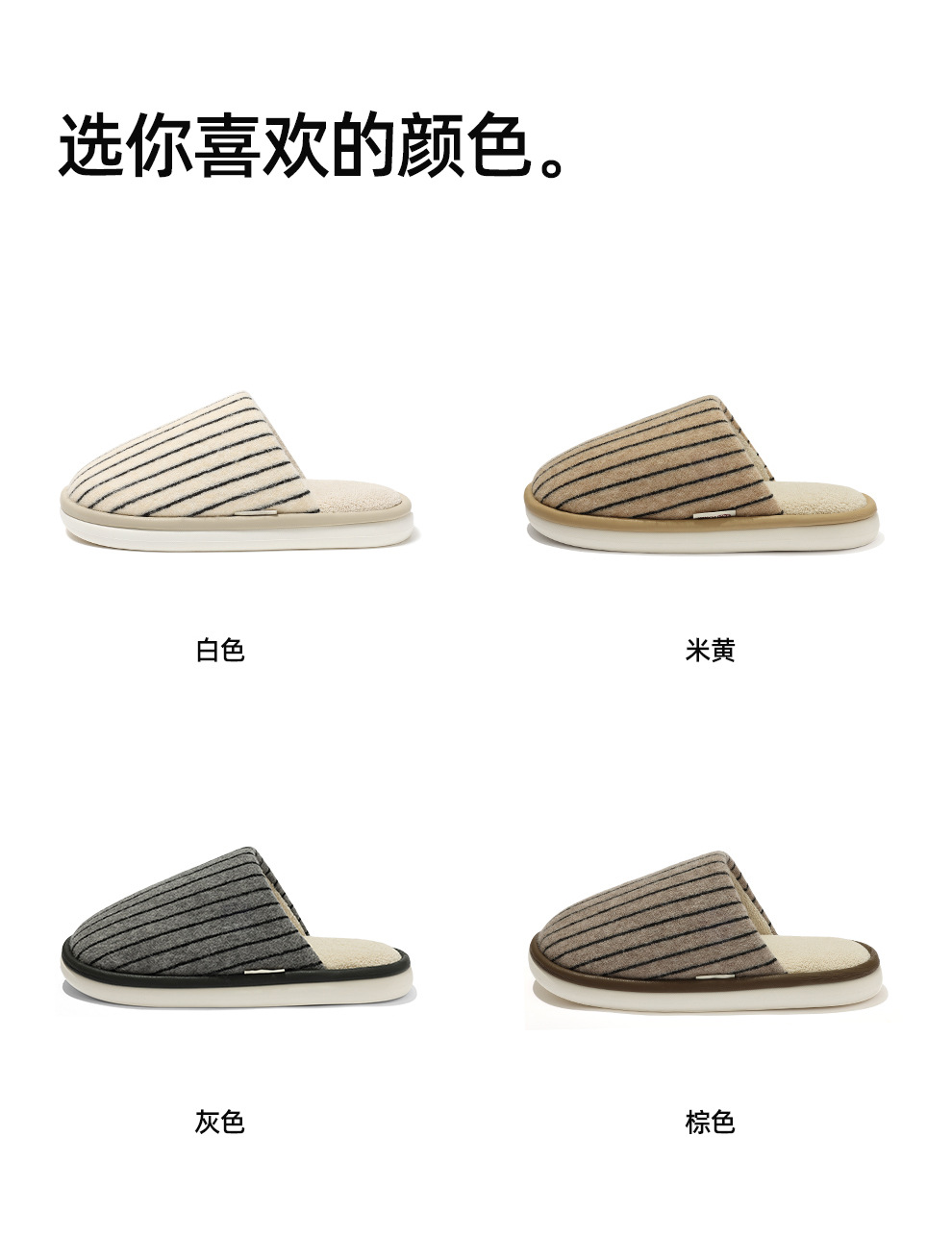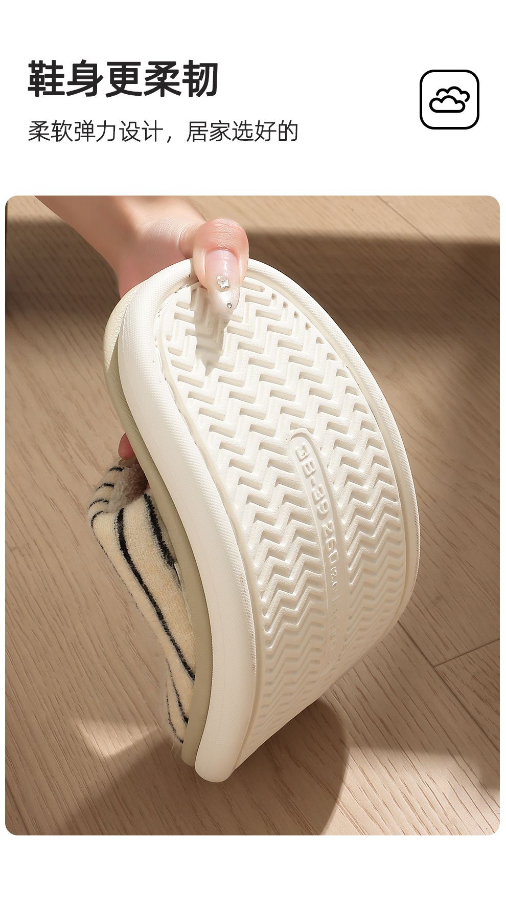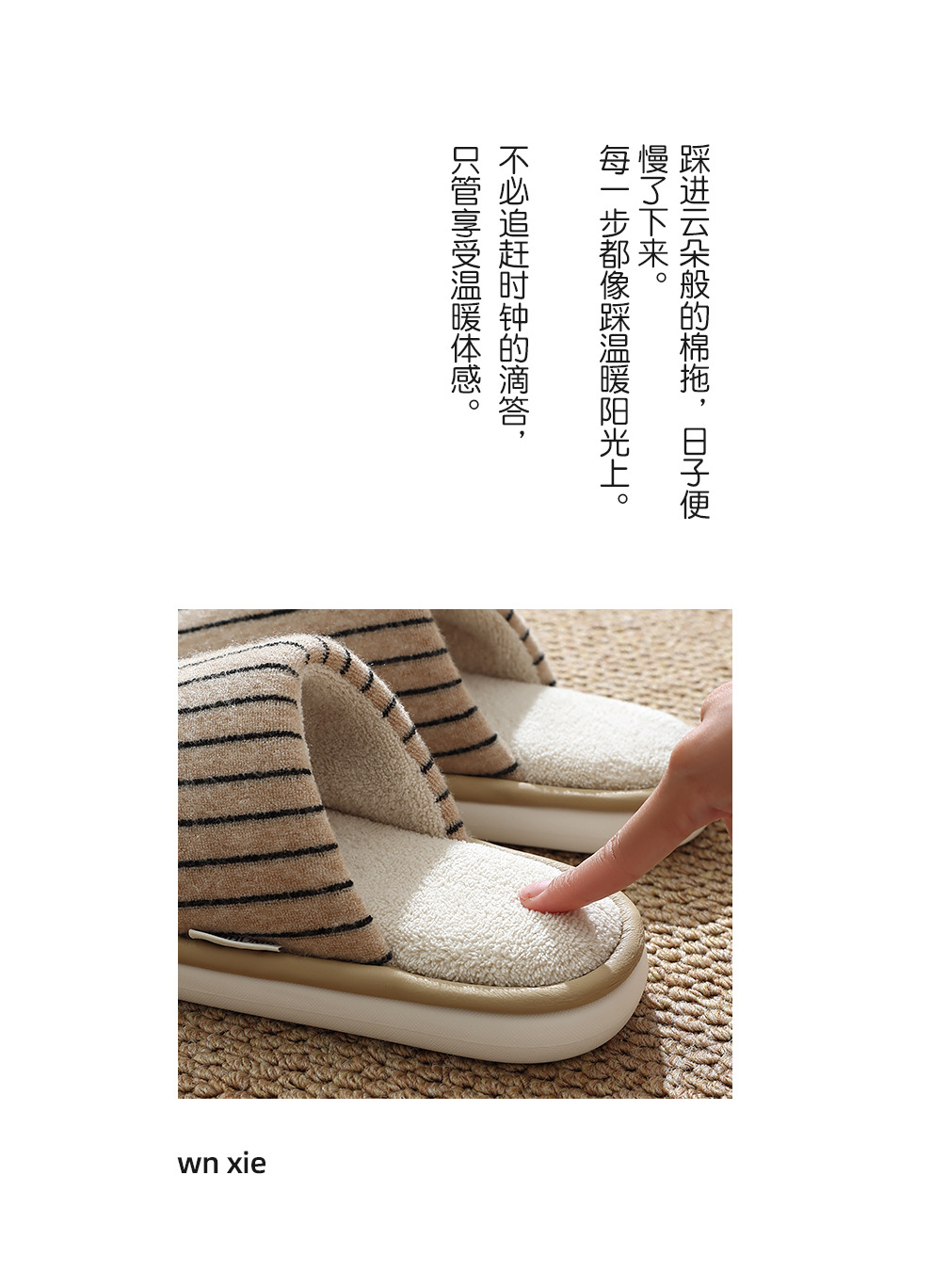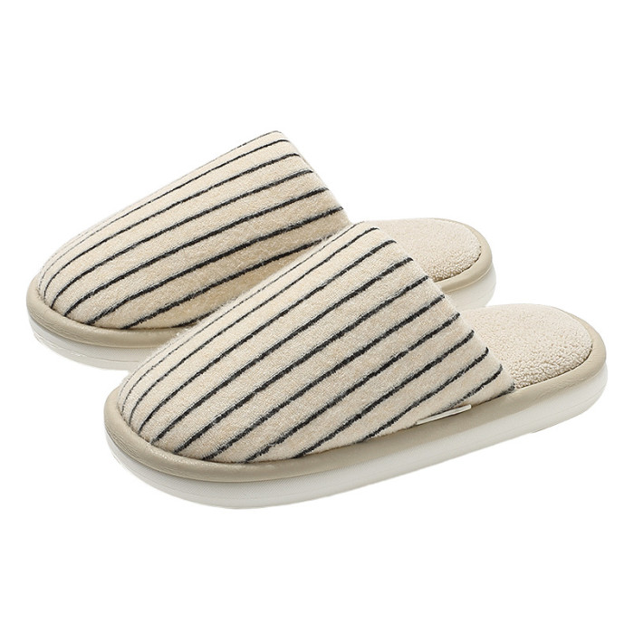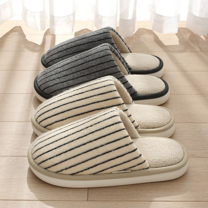 條紋棉拖鞋女秋冬季家居室內毛絨保暖情侶家用軟底防滑棉拖男