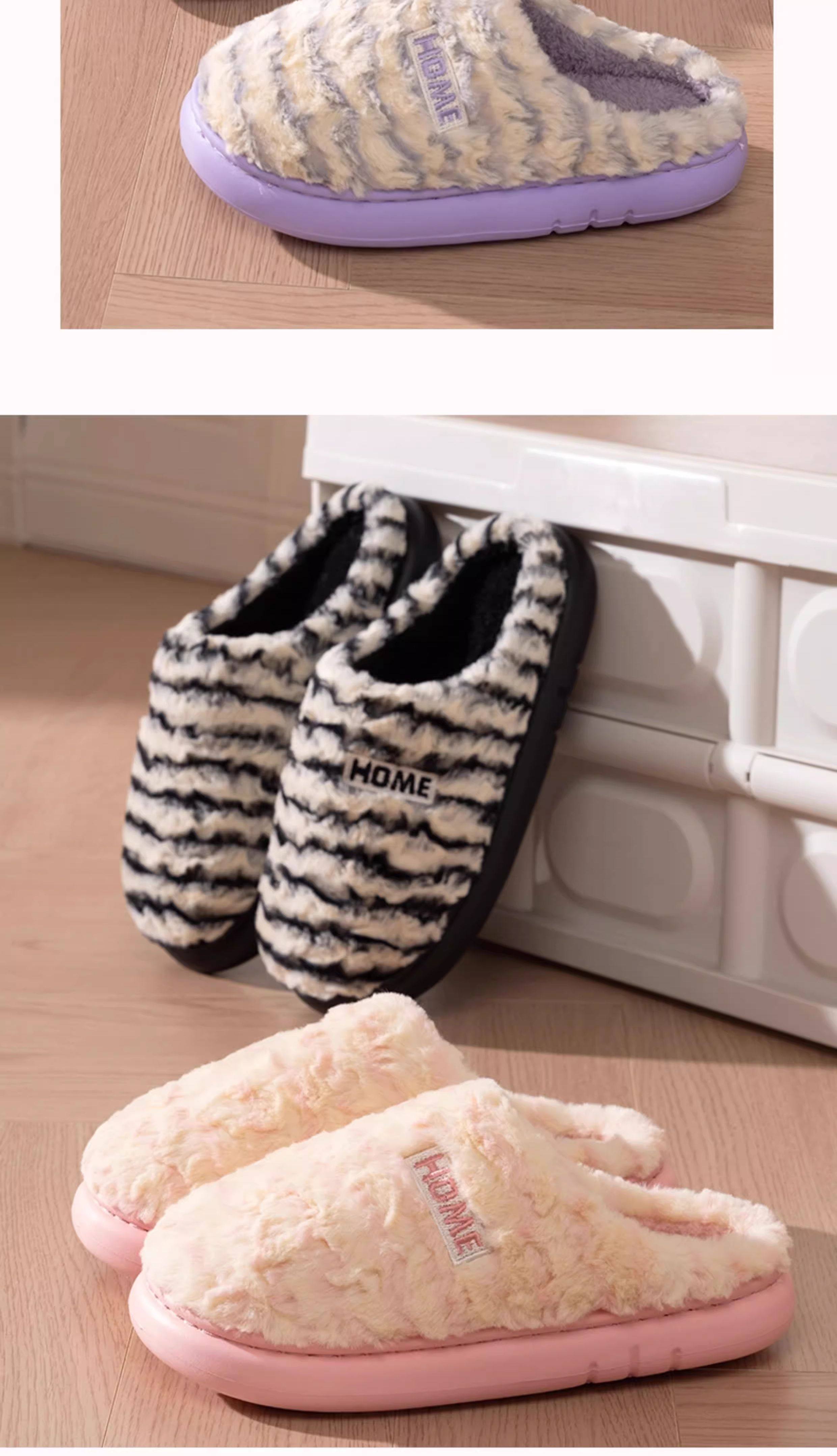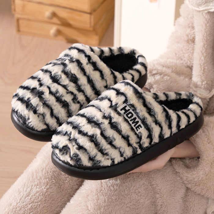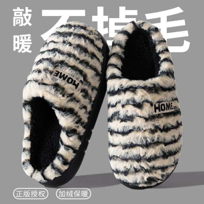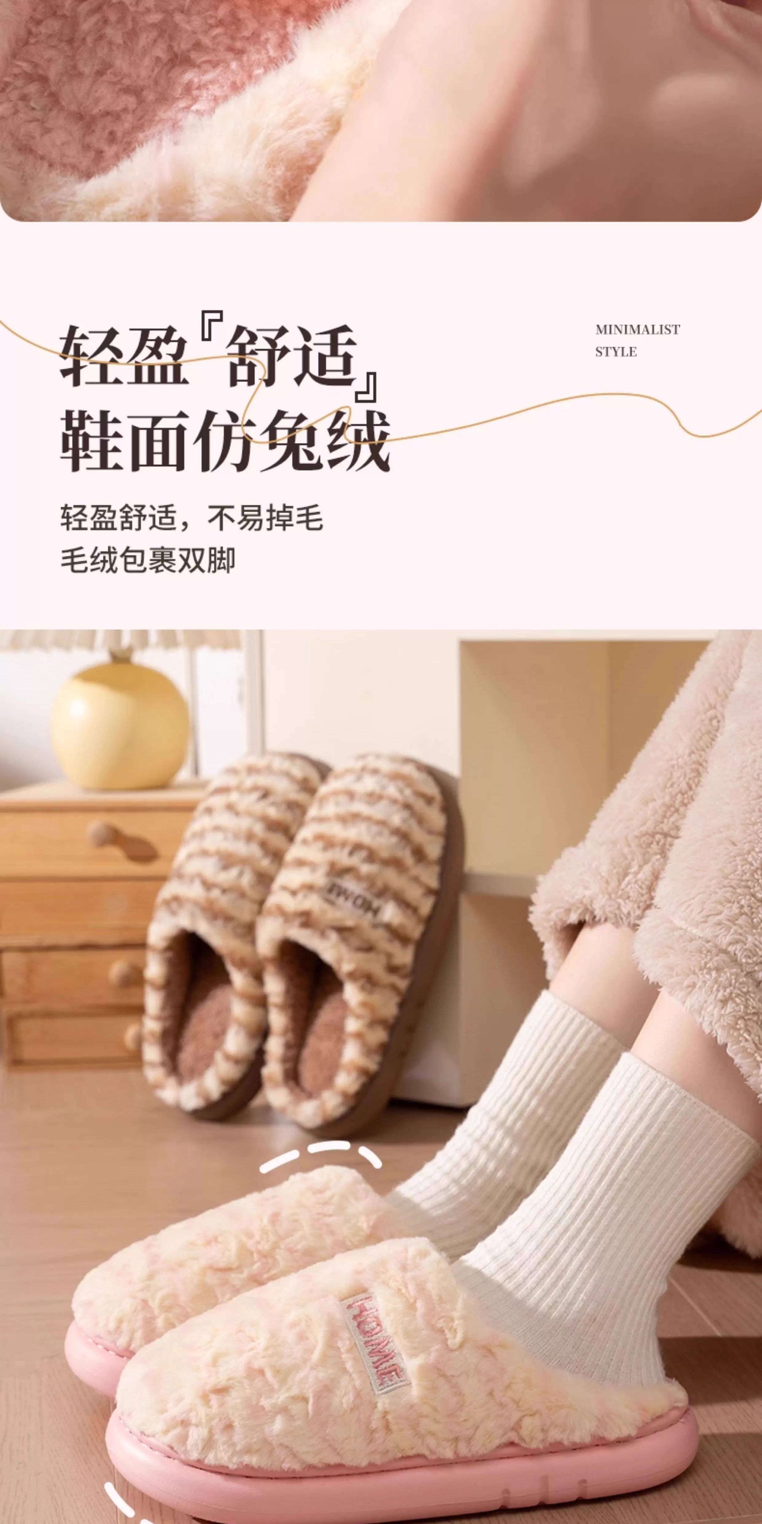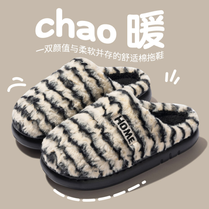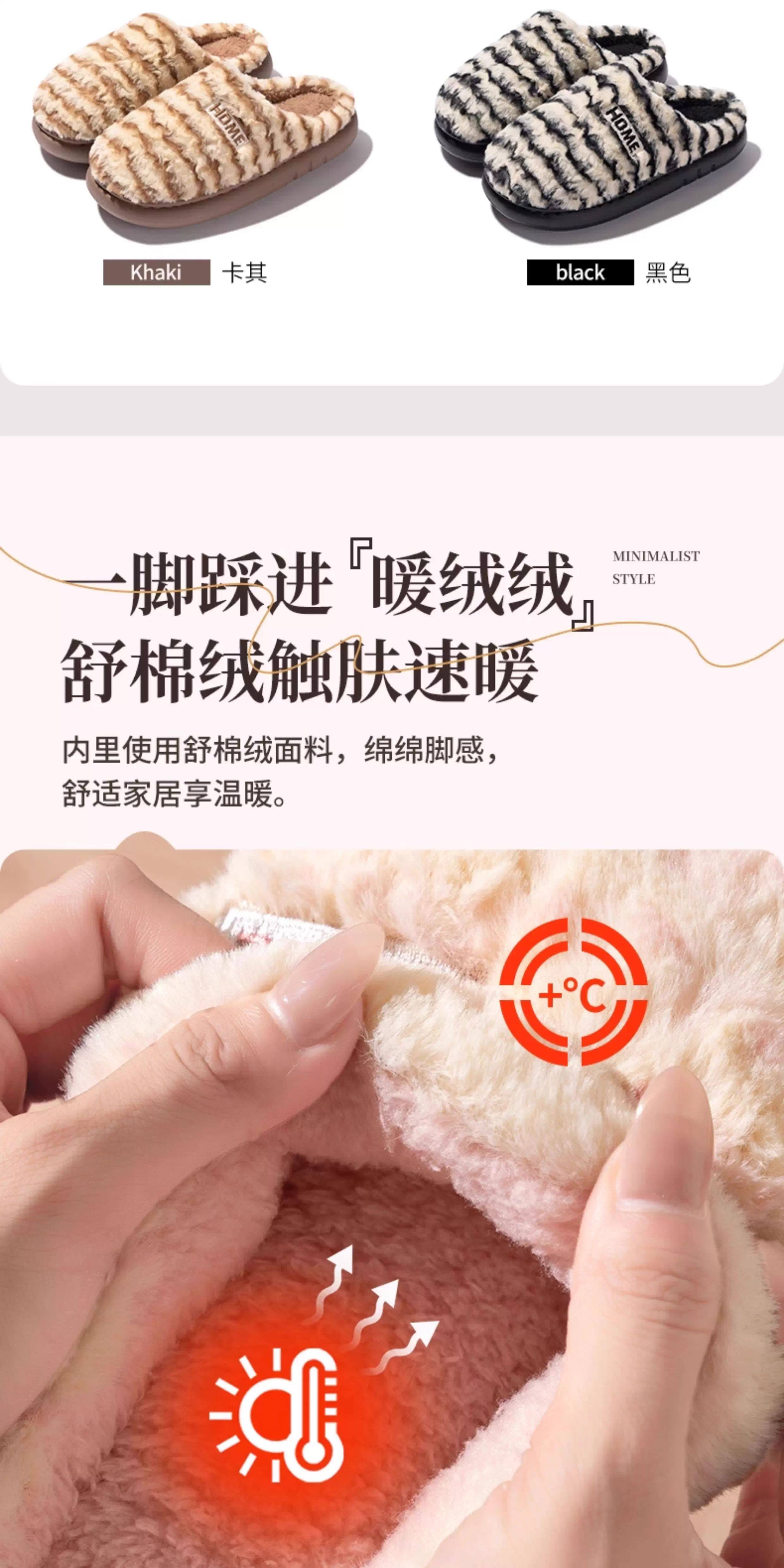 條紋毛絨棉拖鞋男士5新秋冬季加厚保暖居家室內軟底月子鞋女