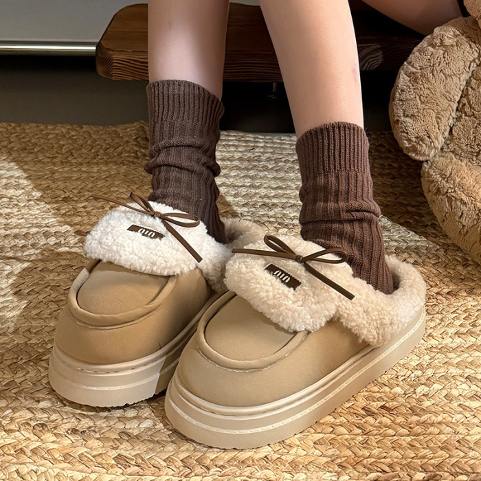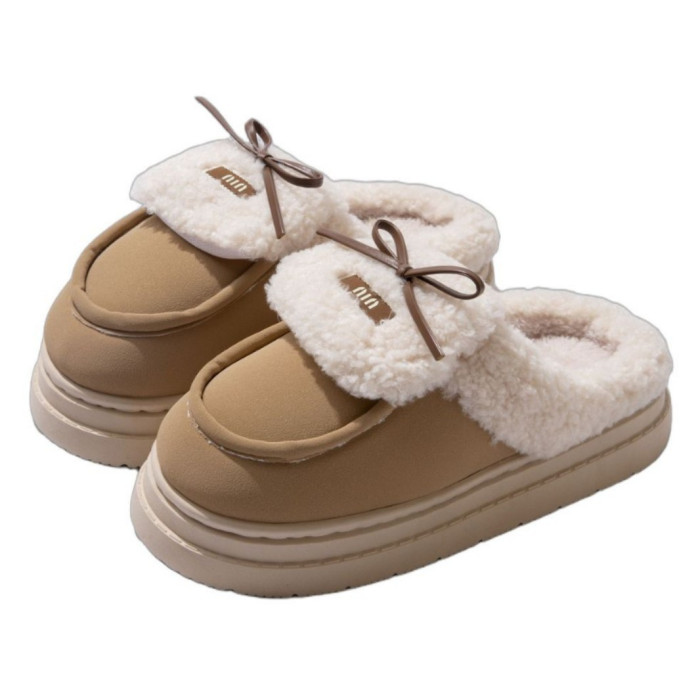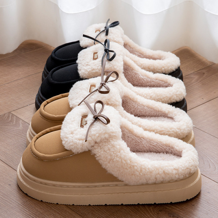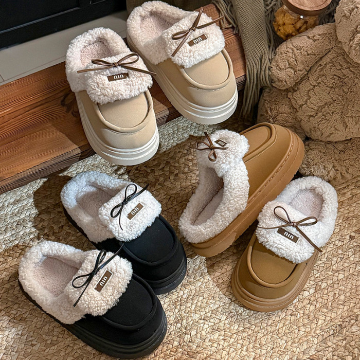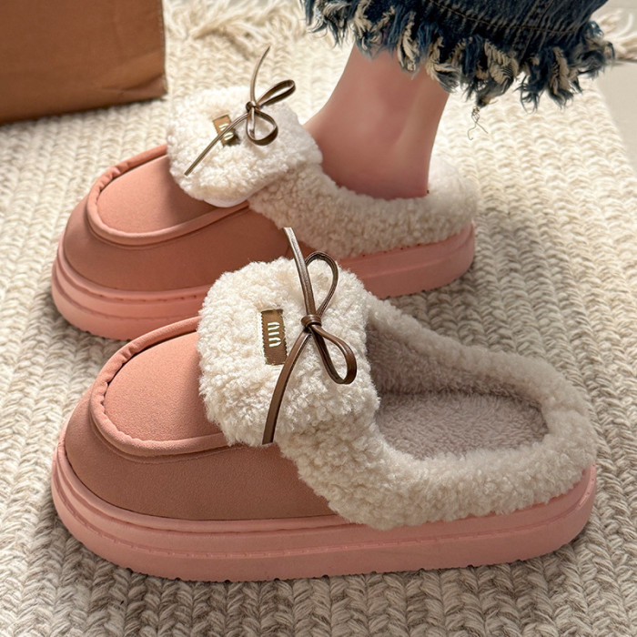 可愛蝴蝶結棉拖鞋女冬季新款外穿加絨厚底防滑居家保暖毛毛拖鞋女
