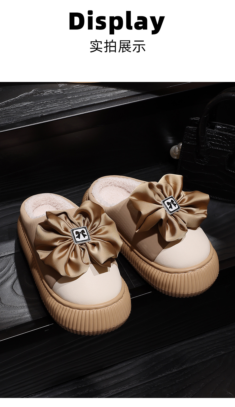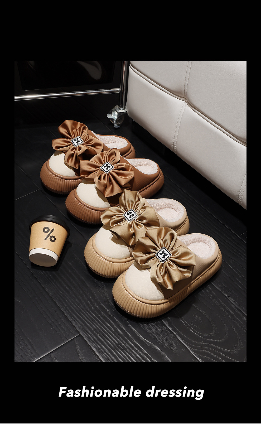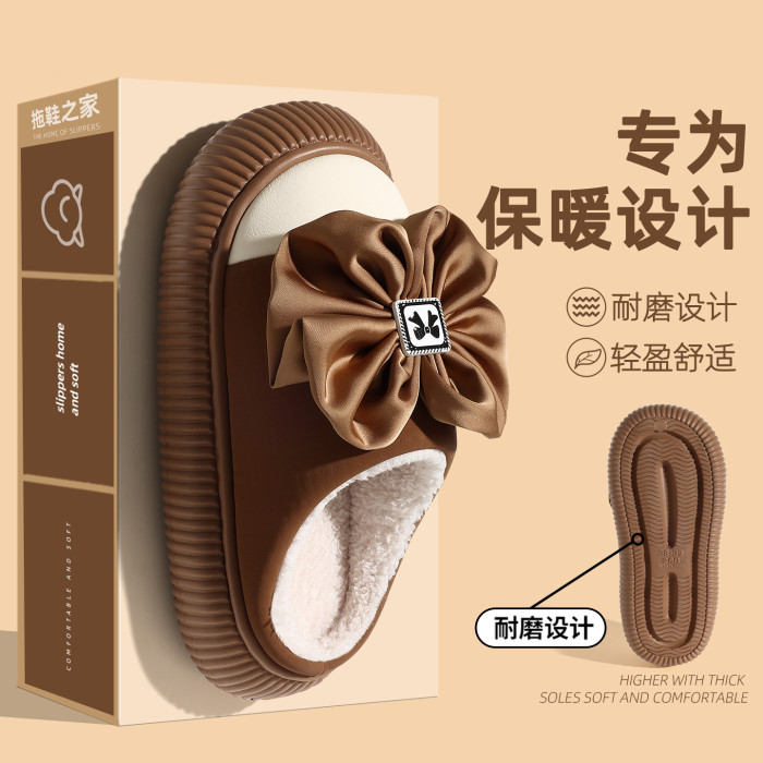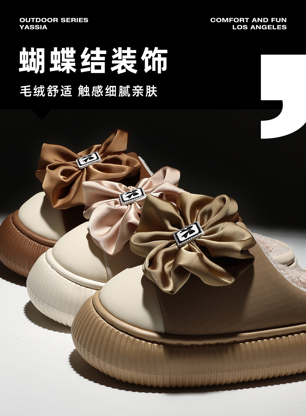 女士蝴蝶結棉拖鞋秋冬季厚底防滑家居室內家用毛絨保暖棉拖女