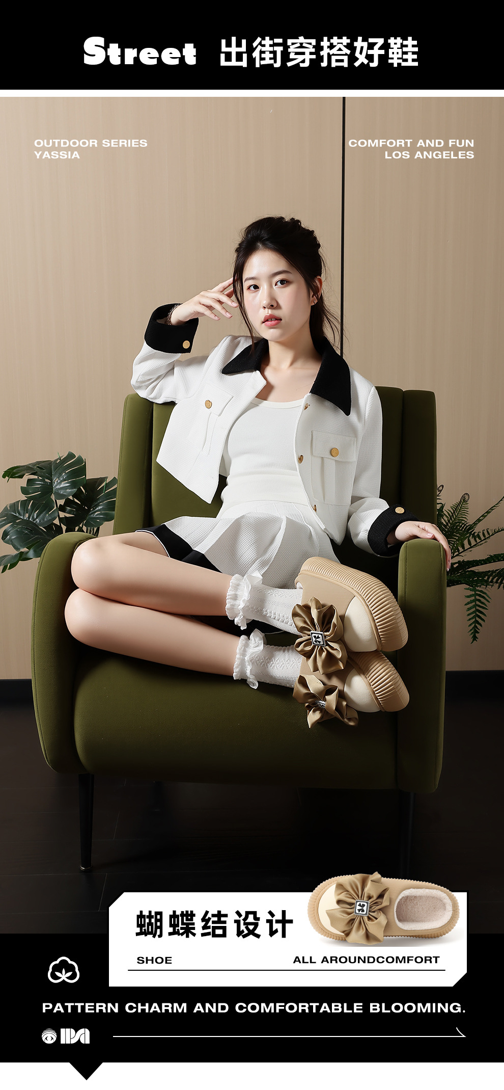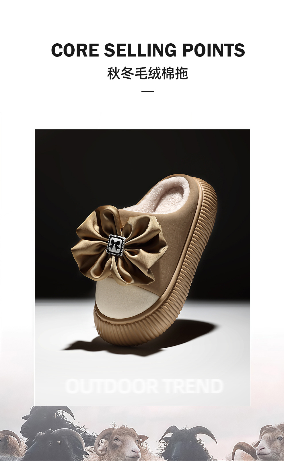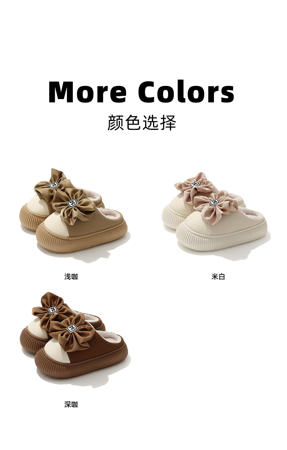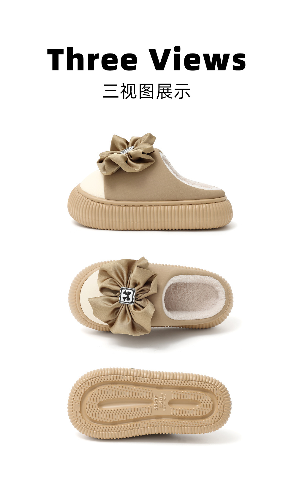 女士蝴蝶結棉拖鞋秋冬季厚底防滑家居室內家用毛絨保暖棉拖女