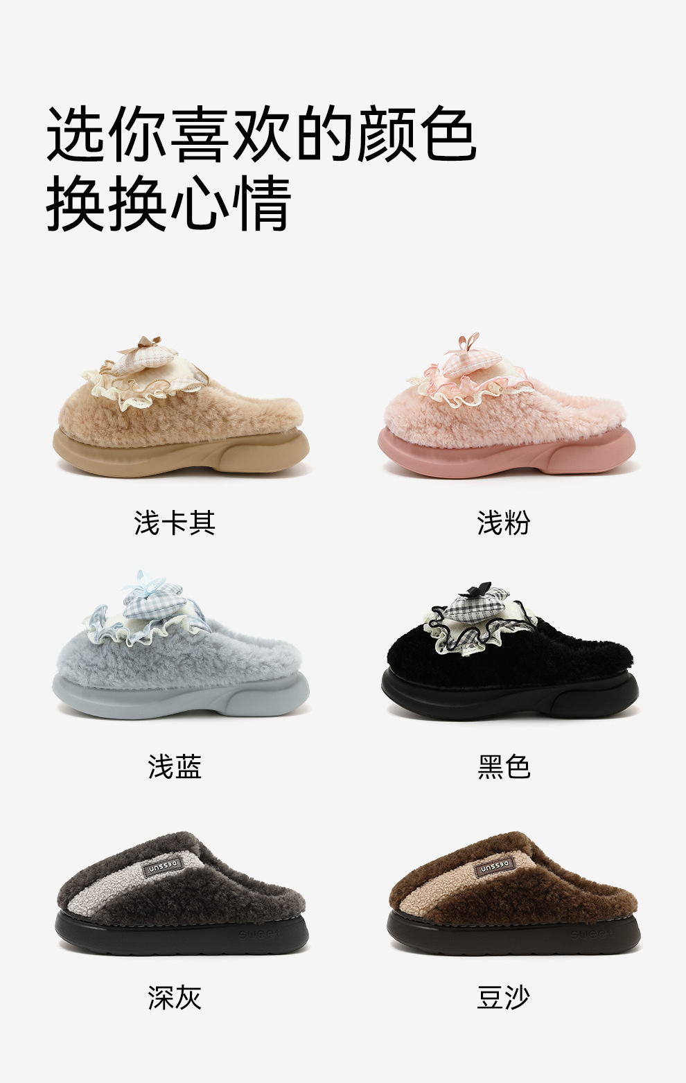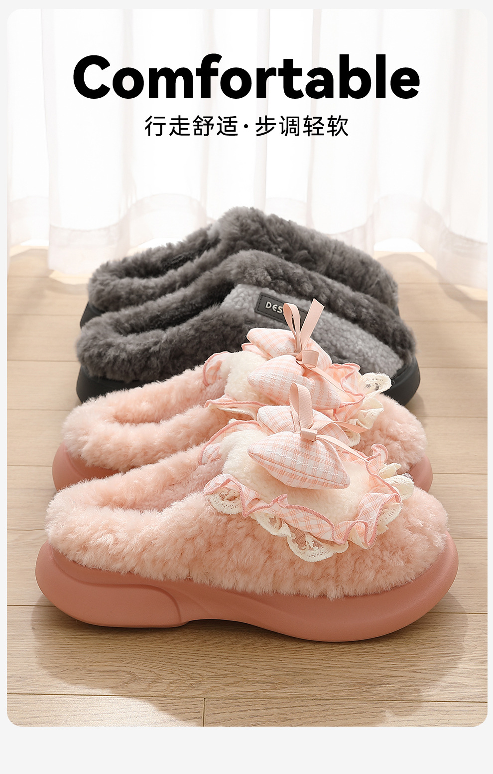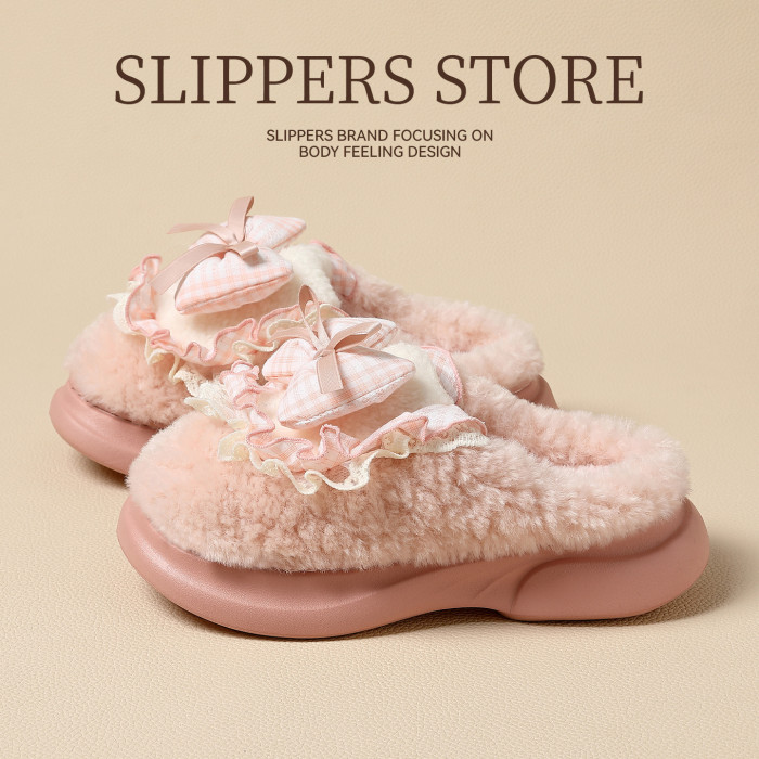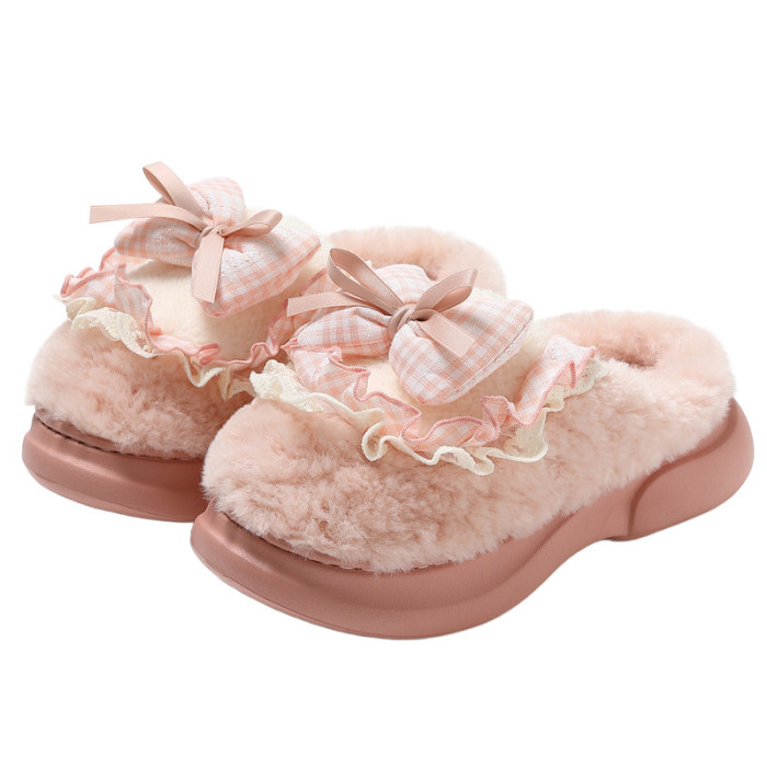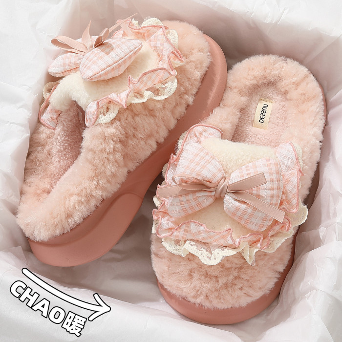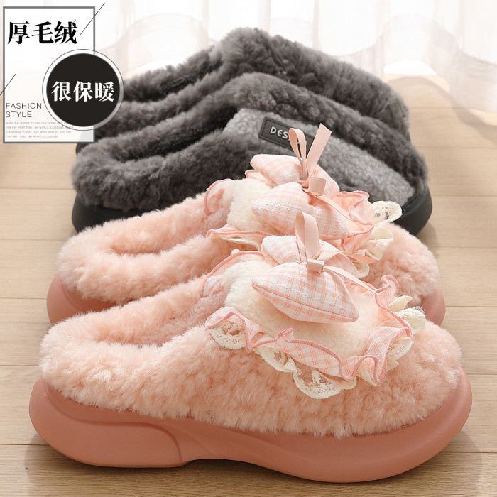 女士蝴蝶結棉拖鞋秋冬季家居室內毛絨保暖情侶家用防滑棉拖男