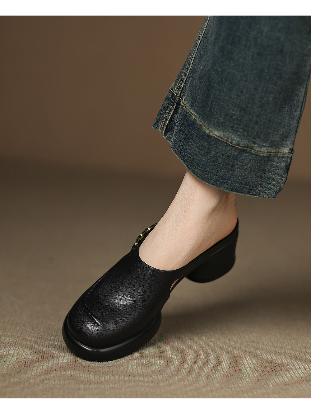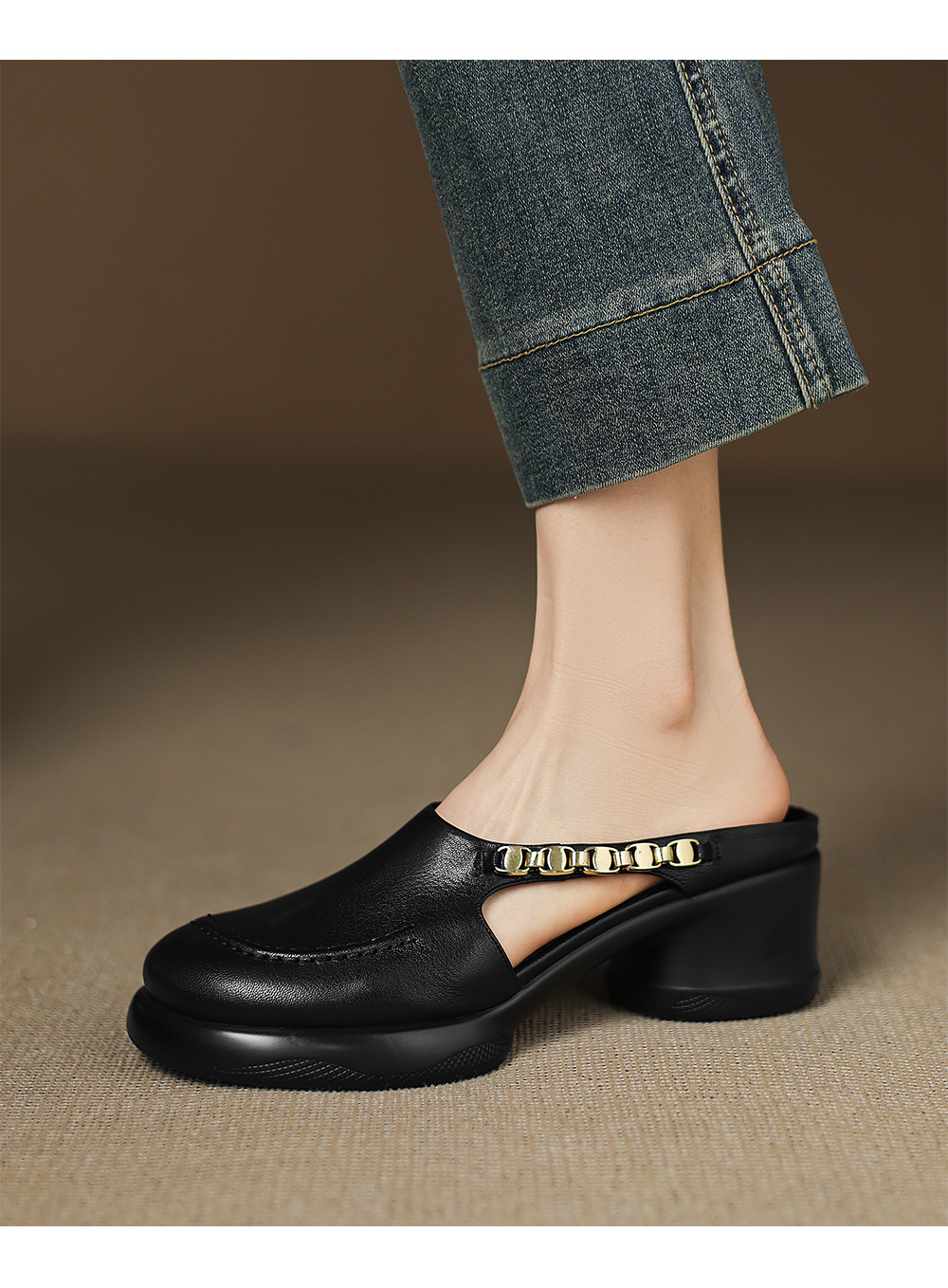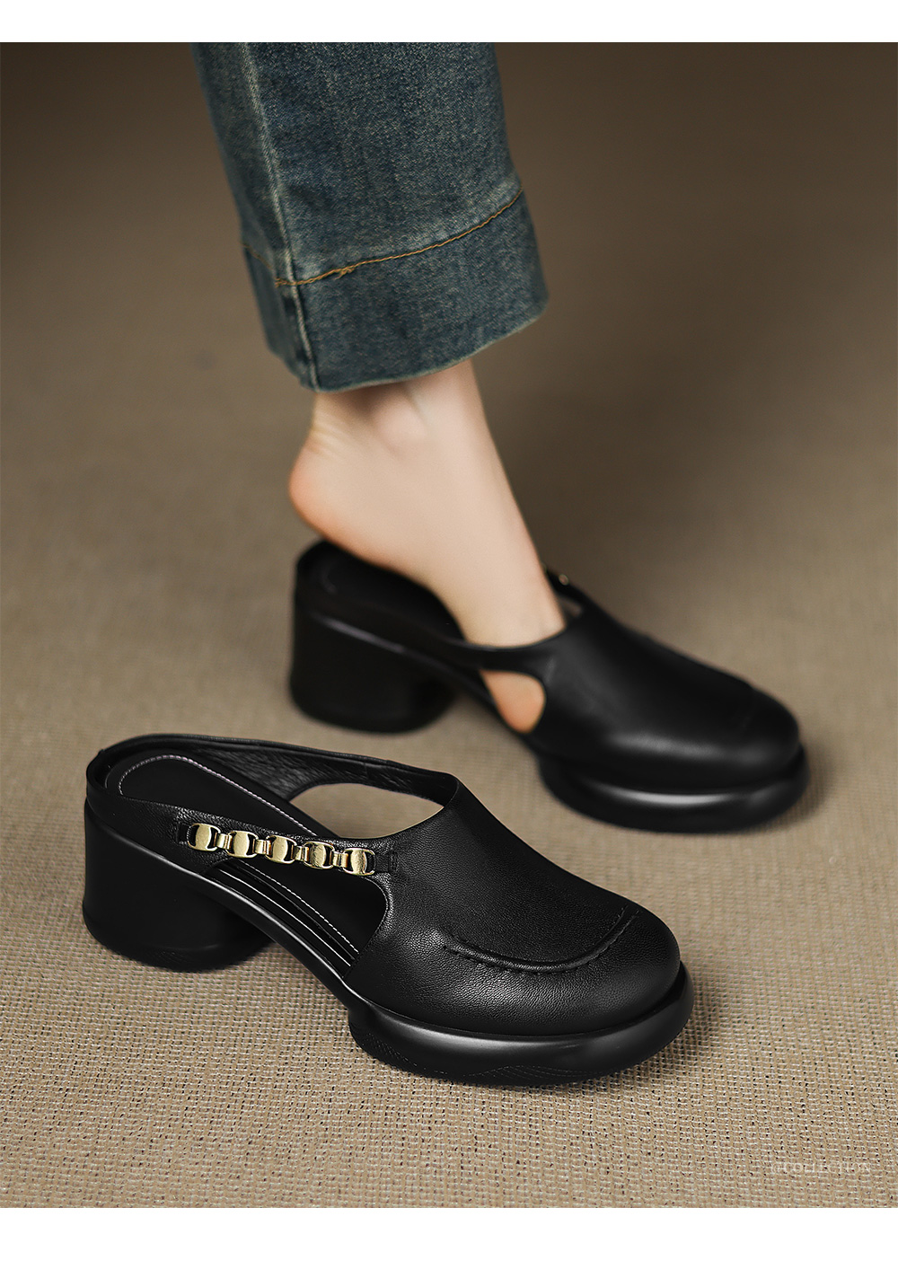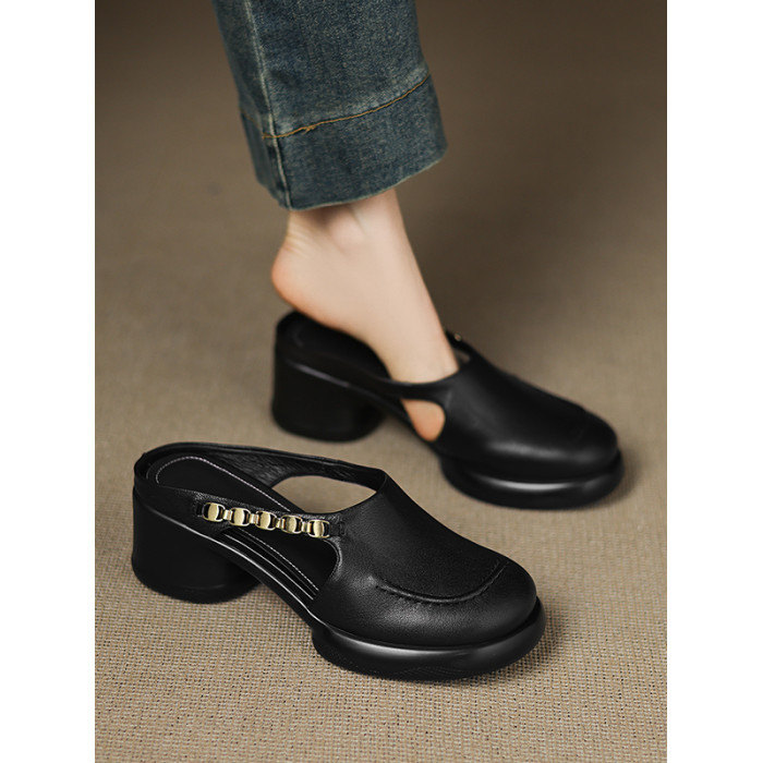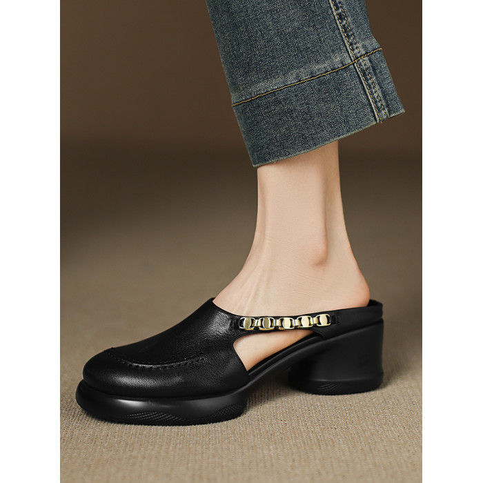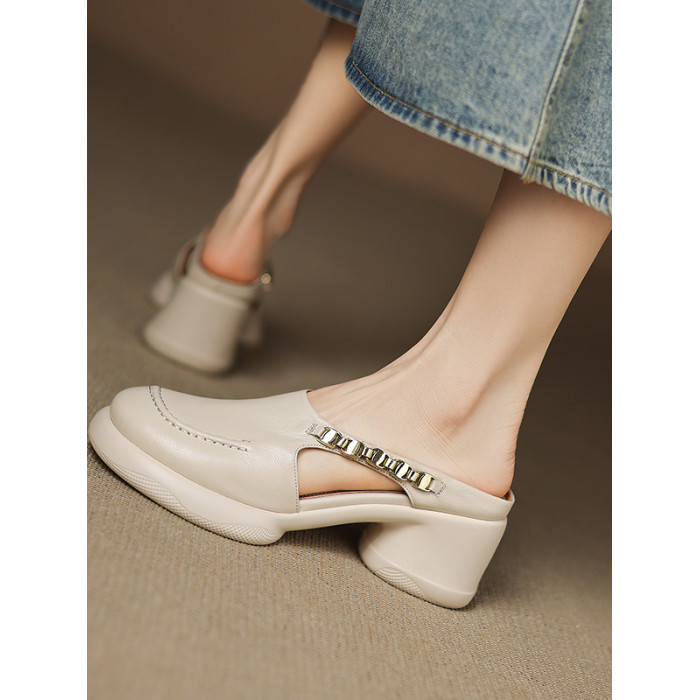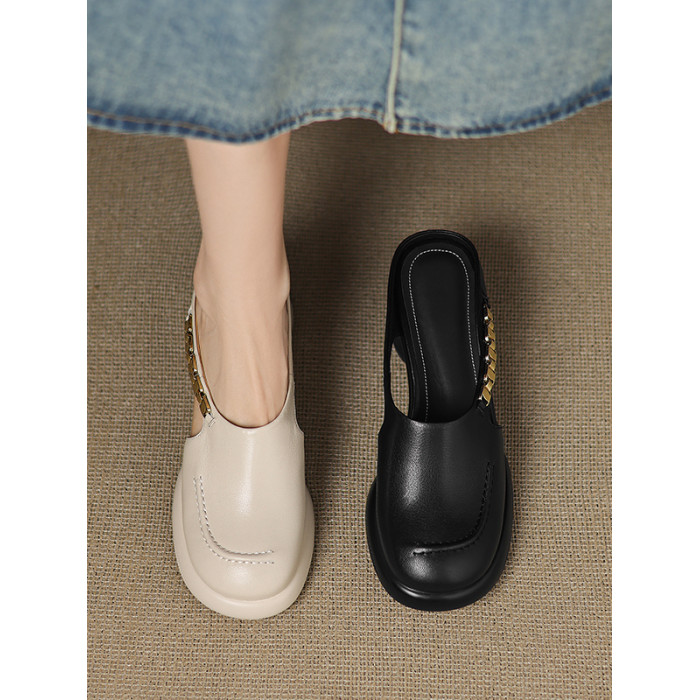 踩屎感厚底真皮包頭半拖鞋女夏季外穿圓頭一腳蹬穆勒鞋高跟涼拖鞋