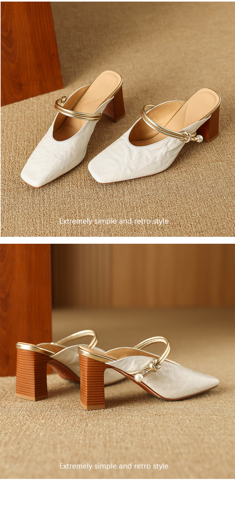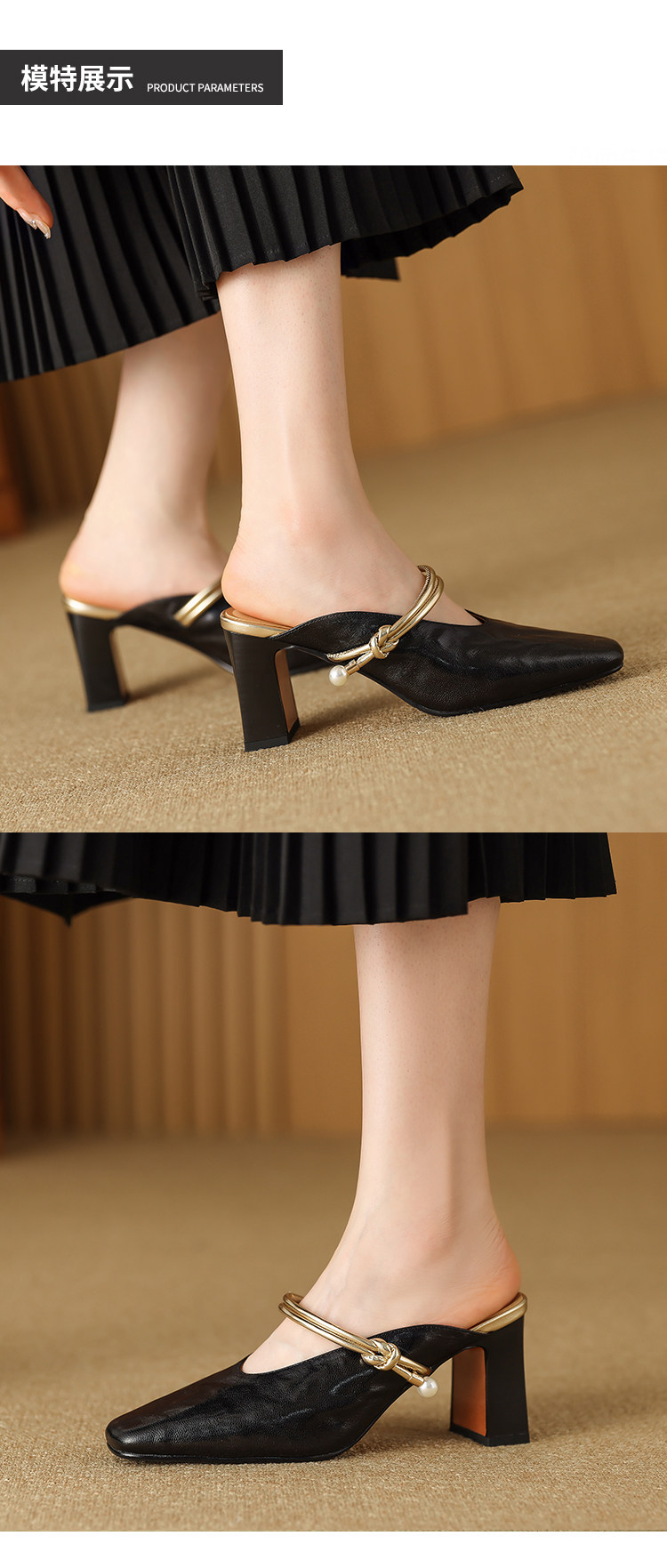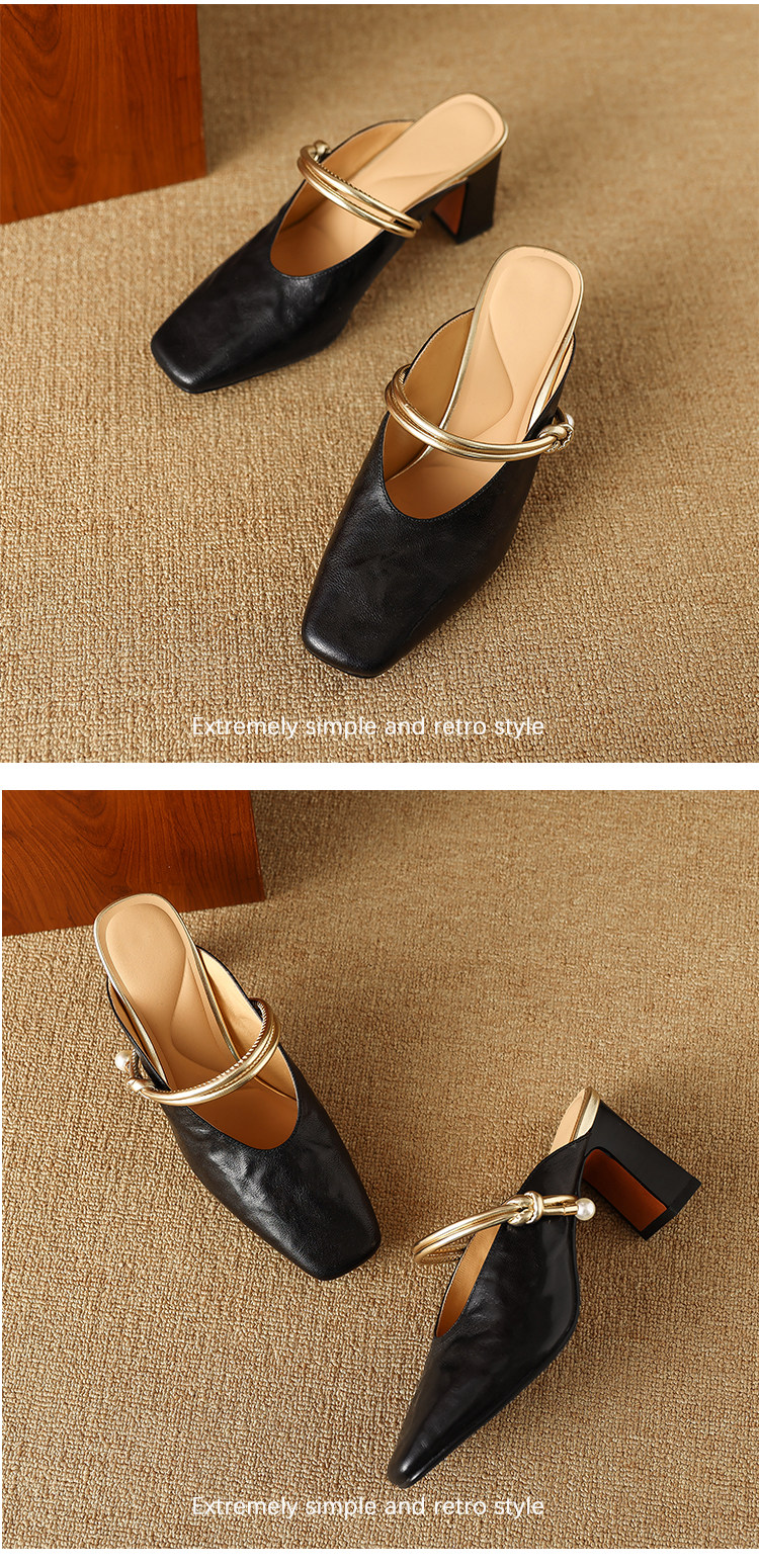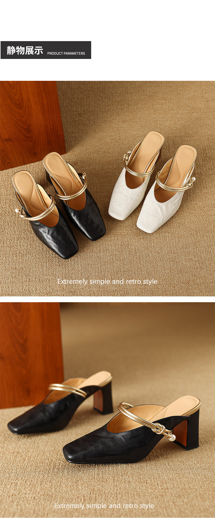 7cm羊皮高跟包頭半拖鞋女夏外穿穆勒時尚復古方頭粗跟瑪麗珍涼拖